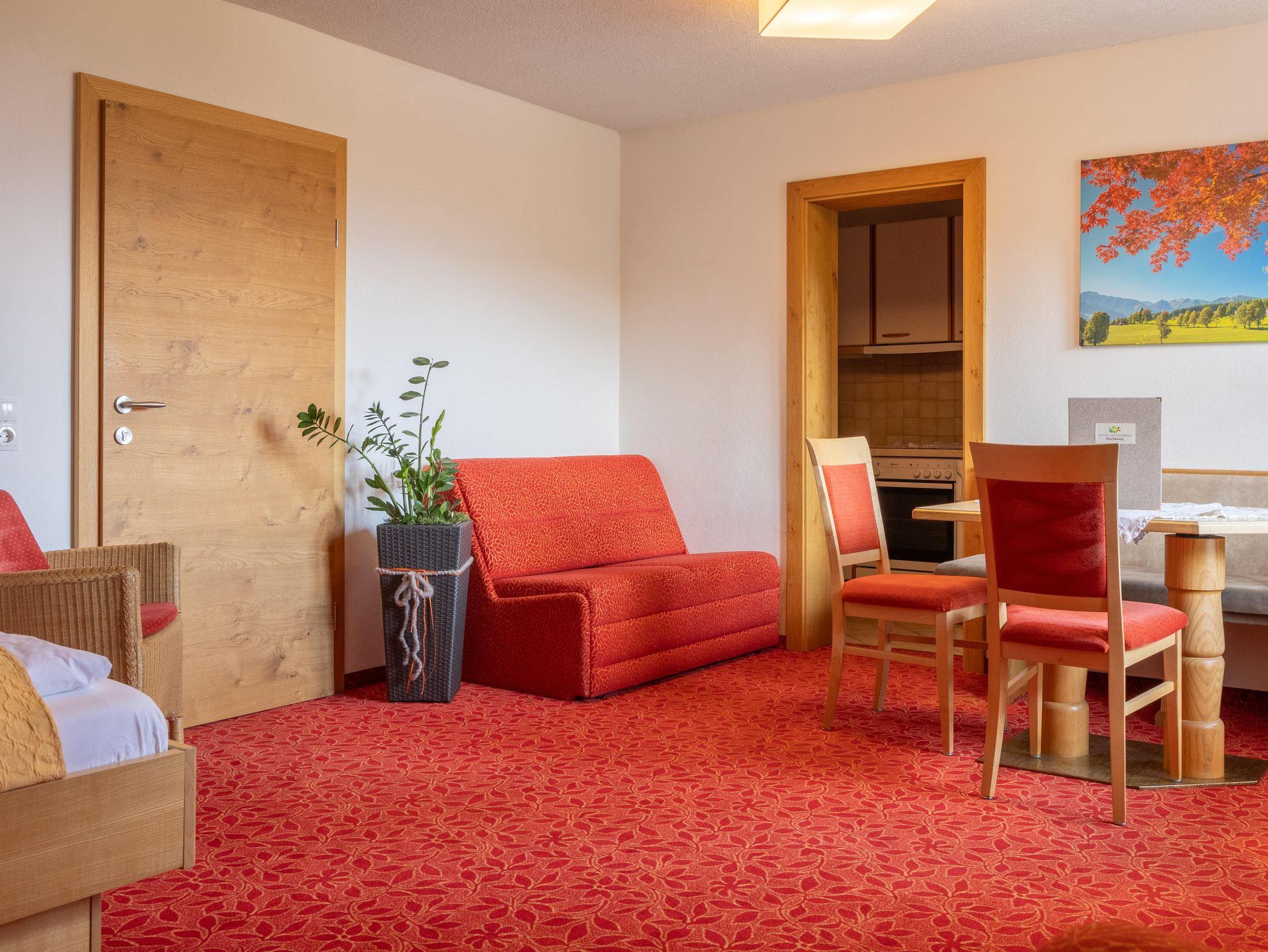 Ankommen und Wohlfühlen. Dieses voll ausgestattete Familienzimmer bzw. Appartement besteht aus einem Schlaf- und einem Wohnschlafzimmer mit Esstisch und ermöglicht ein komfortables Wohnen für 2 - 4 Personen. Eine eigene Küche, sowie der nach Süden ausgerichtete Balkon sind die Grundlage für angenehmen Wohnkomfort. Die Dusch/WC-Einheit ist von jedem Wohnraum aus separat erreichbar.
