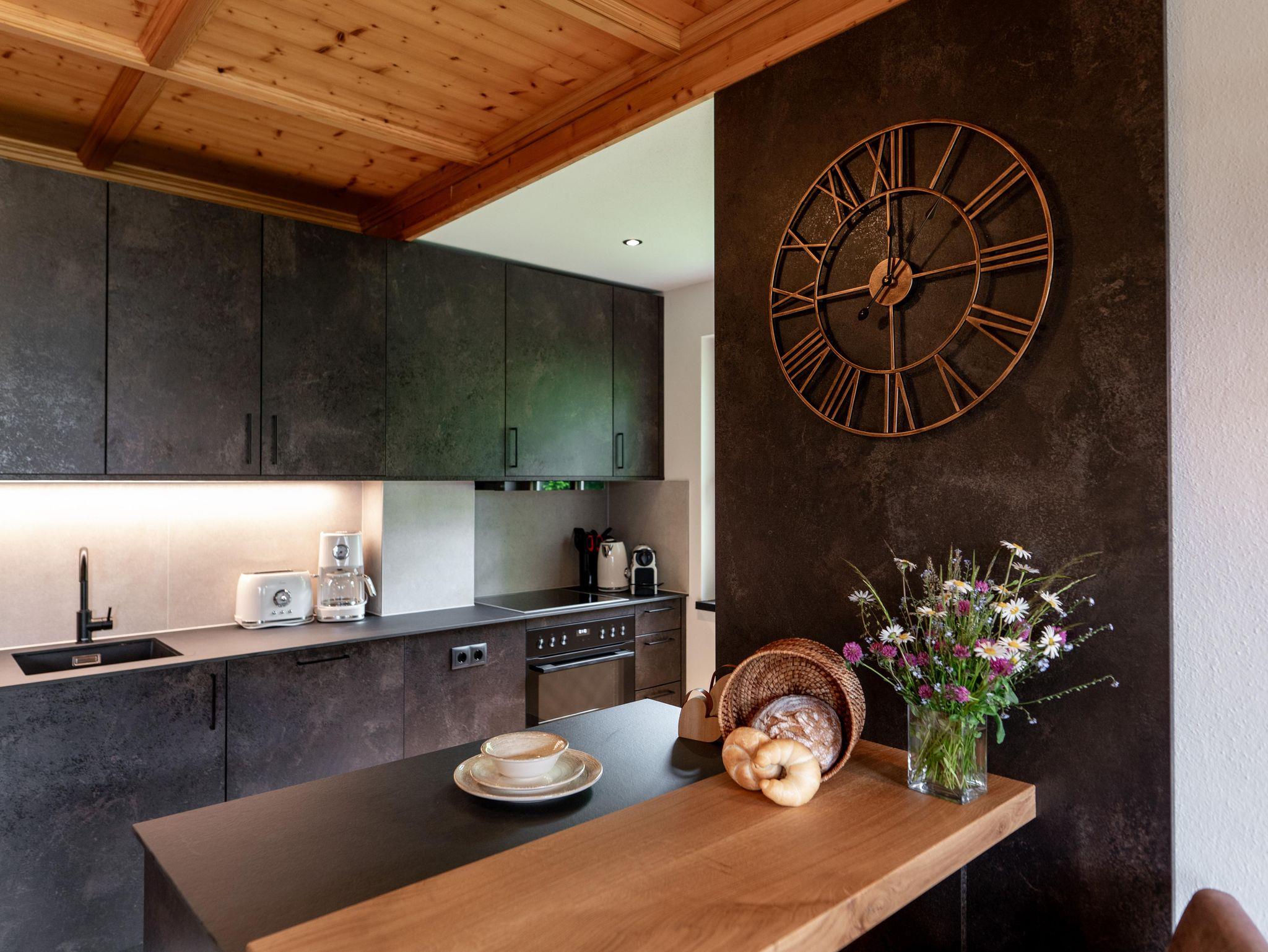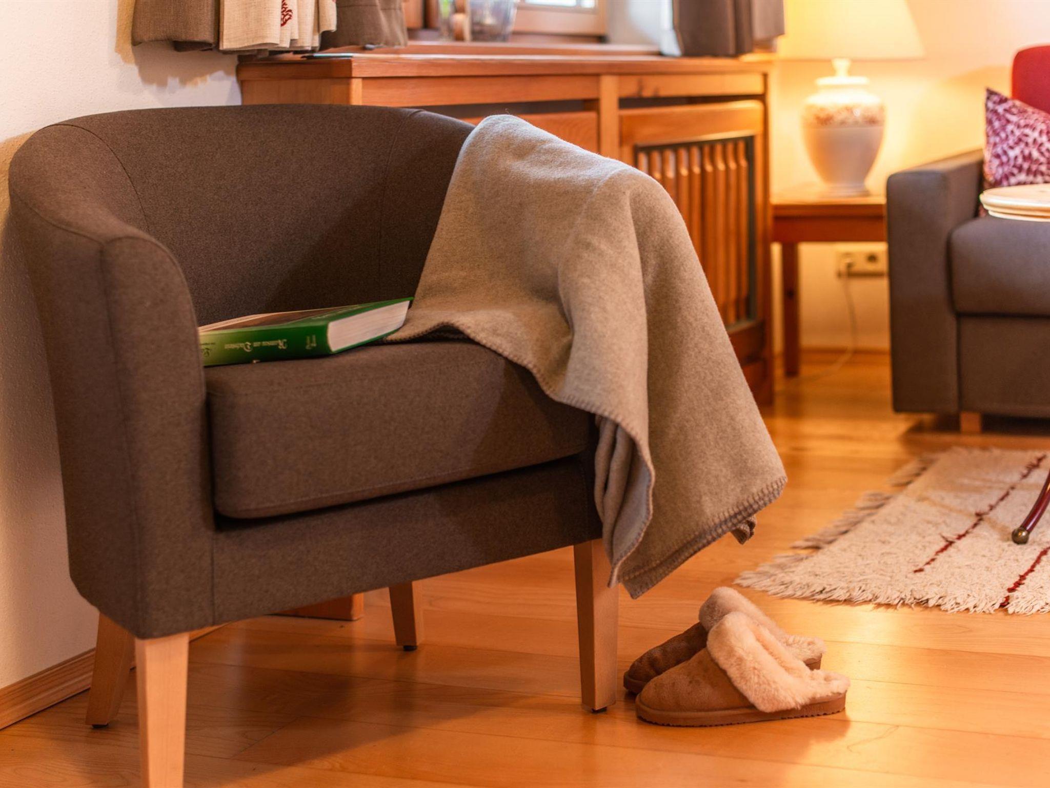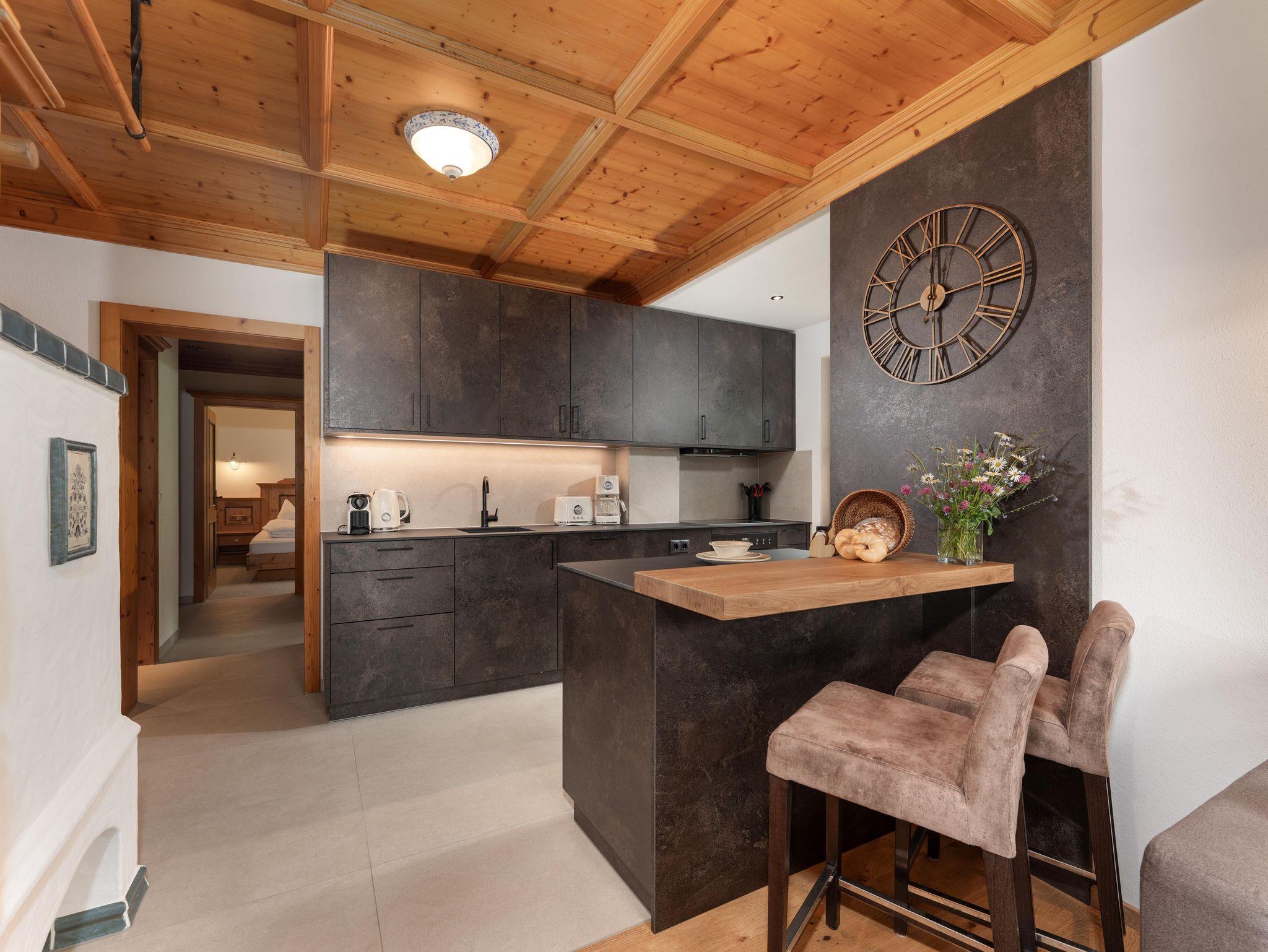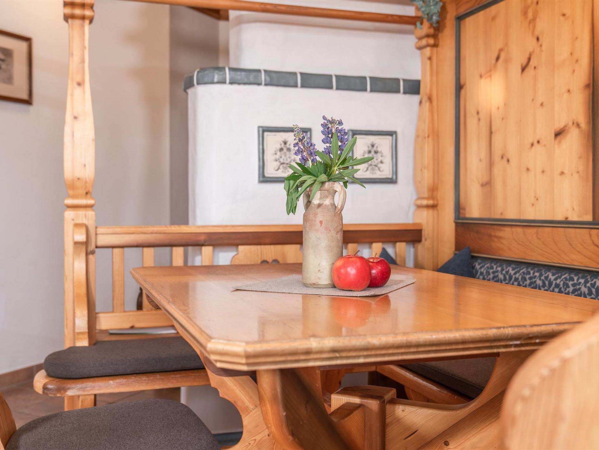 Das Appartement ist ausgestattet mit 2 Schlafzimmer, 1 Wohnzimmer mit Kachelofen, TV, Geschirrspüler mit Küche, Mikrowelle, E-Herd, Kühlschrank, 2 Bad/Dusche, 2 WC, Vorraum, Balkon und eigener privater Sauna
