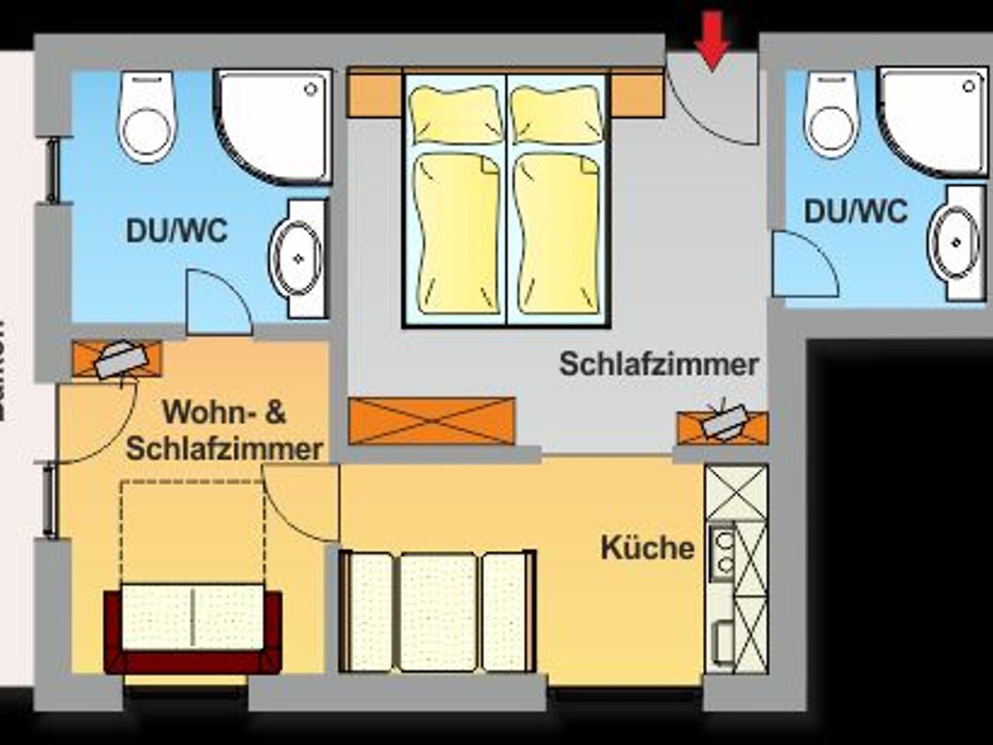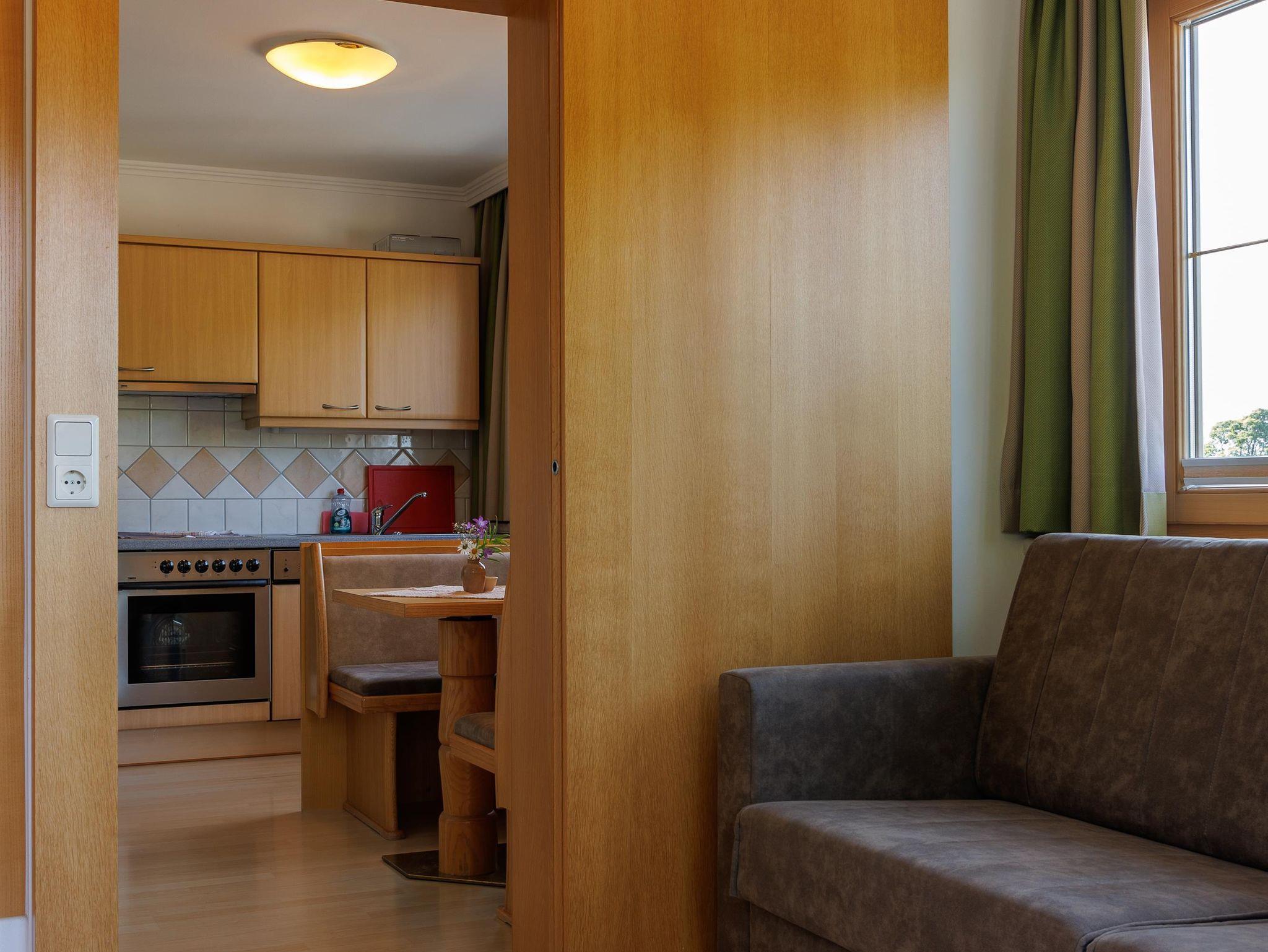 Ankommen und Wohlfühlen.Dieses voll ausgestattete Familienzimmer bzw. Appartement besteht aus einem Schlaf-, einem Wohnschlafzimmer und einer Küche mit Esstisch. Der nach Südwesten ausgerichtete Balkon erlaubt Sommer wie Winter die Sonne zu genießen. Zwei getrennte Dusch/WC-Einheiten ermöglichen 2-4 Personen ein gemeinsames Wohnen ohne Einschränkungen.