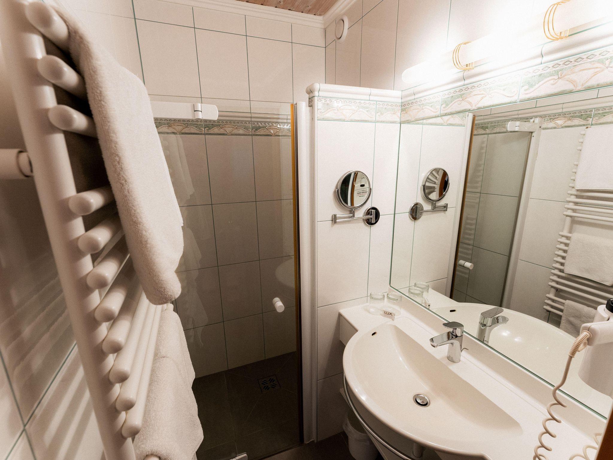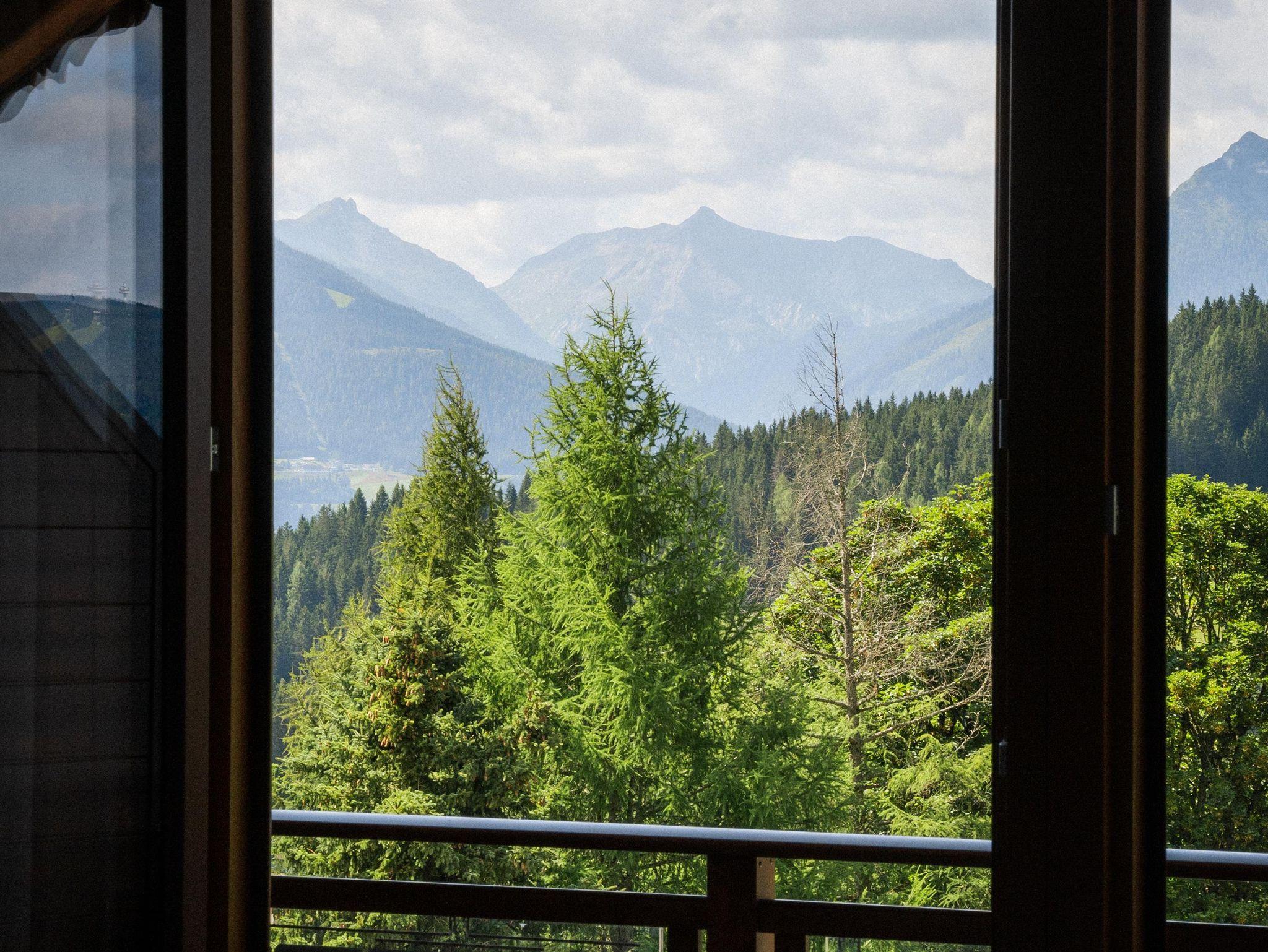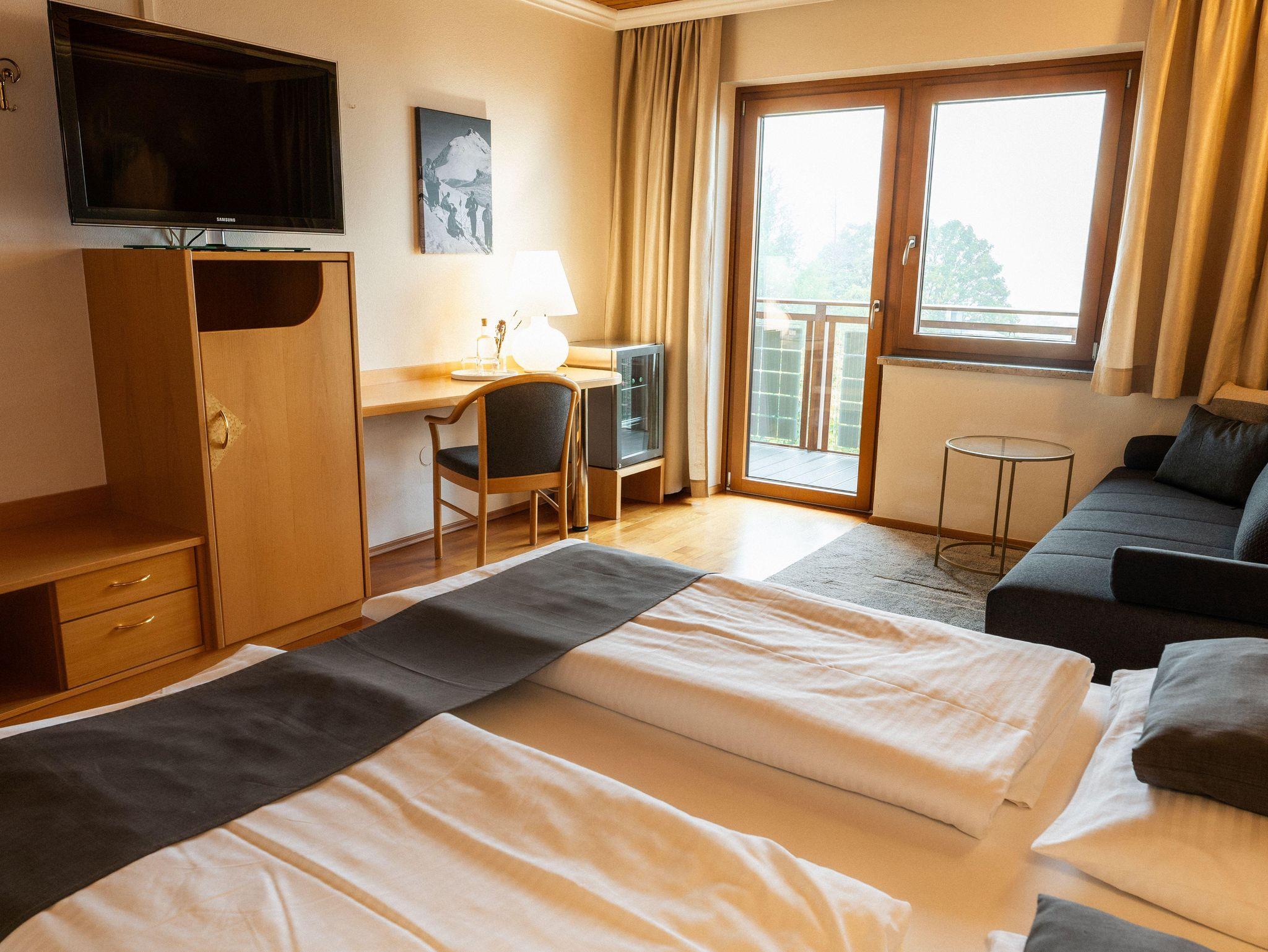 Allergenfreie Zimmer, mit Holzböden, ca. 30m². Gemütliche Sitzecke mit Minibar, Safe, Smart-TV - 42 Zoll Full HD Flatscreen,WLAN im ganzen Haus. Bademäntel und Badeschlappen am Zimmer, Dusche und Toilette getrennt. Alle Zimmer mit Balkon und Panorama - Bergblick.