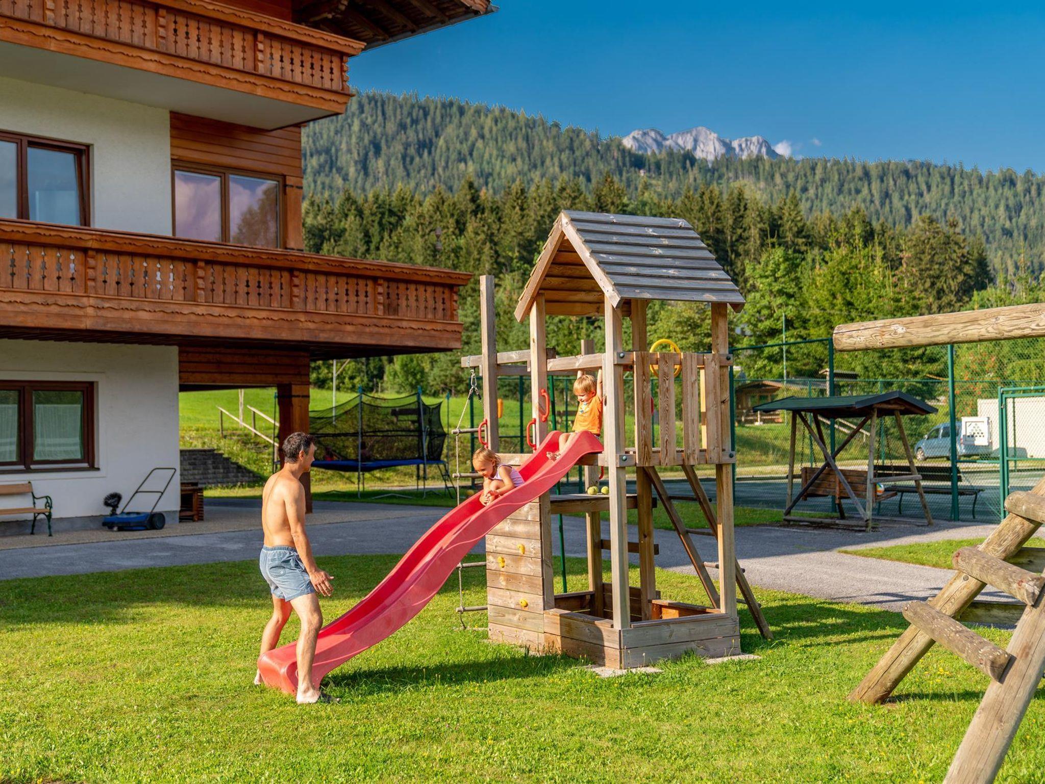 Unser Landhotel Kielhuberhof liegt im südlichen Teil der Ramsau, inmitten der eigenen grünen Wiesen: eine traumhaft ruhige und sonnige Lage am Fuße des Dachsteins mit freiem Panoramablick auf die Planai und die Niederen Tauern. Die vielen Sport- und Freizeitmöglichkeiten wie langlaufen, wandern oder Ski fahren laden zu einem einzigartigen Urlaub in die Ramsau ein! Der Skibus in die familienfreundlichen Skigebiete Ramsau und Ski amadé hält direkt beim Hotel Kielhuberhof. Der Kielhuberhof bietet Ihnen gemütliche Einzel- und Doppelzimmer, ein ebenerdig begehbares, barrierefreies Doppelzimmer mit Zugang über eine eigene Haustüre, geräumige Familienzimmer sowie Appartements und Ferienwohnungen für bis zu 6 Personen. Auch größere Gruppen sind bei uns im Hotel Kielhuberhof gerne willkommen. Alle Zimmer und Ferienwohnungen sind im modernen Landhaus-Stil eingerichtet und verfügen ab der Kategorie 25m² über neue große Wohlfühl-Badezimmer und über einen herrlichen Balkon mit Aussicht auf die umliegende Bergwelt. In den geräumigen Familienzimmern für 2 - 5 Personen finden Sie einen Vorraum mit Garderobe und eine kleine Küchenzeile mit bequemer Essecke. Gerne bieten wir Ihnen auch 1 barrierefreies Zimmer mit einem speziell auf die Bedürfnisse von Rollstuhlfahrern abgestimmten Badezimmer an. Für Ihr leibliches Wohl sorgen wir mit unserem reichhaltigen Frühstücksbuffet mit Produkten heimischer Bauern und dem köstlichen 3- oder 4-Gang Wahlmenü mit vegetarischer Alternative, Salat- und Dessertbuffet. Im Sommer laden wir einmal wöchentlich zu einem gemütlichen Grillabend ein. Das Hotel Kielhuberhof bietet Ihnen eine Freizeithalle mit Tischtennis, Tischfußball und Billard, einen 400 m² großen Natur-Schwimmteich, eine Liegewiese, 2 Tennisplätze und einen Sportplatz für Fußball, Volleyball und Badminton. Nach einem aktiven Tag mit Wandern oder Langlaufen, entspannen Sie im neu gestalteten Wellnessbereich des Landhotels Kielhuberhof. Der Panorama-Wellnessbereich erstreckt sich über 2 Etagen und bietet eine urige Blockholz-Sauna-Hütte. Relaxen Sie auch in der Bio-Sauna, dem Kräuterdampfbad, der Infrarotkabine und im Ruheraum mit Blick auf das Dachstein-Massiv. Auf Anfrage organisieren wir für Sie entspannende Wohlfühl-Massagen. Von der Sonnenterrasse genießen Sie bei einem hausgemachten Apfelstrudel einen herrlichen Ausblick auf die Naturkulisse der Dachstein-Tauern-Region. In der gemütlichen Stube mit offenem Kamin verbringen Sie gediegene Stunden mit einem spannenden Buch oder bei einem Glas guten Österreichischen Weins. Im Sommer lädt Sie die idyllische Umgebung der Ramsau am Dachstein zu gemütlichen Spaziergängen, aktivem Nordic-Walking und Wanderungen auf die urigen Almen der Region ein. Für Kinder bieten Hochseilgärten, Freizeitparks und Naturlehrpfade spannende Erlebnisse. Den Winter in der Ramsau verbringen Sie auf den herrlich präparierten Pisten der Skigebiete Ramsau und Planai, auf den traumhaft gespurten Langlaufloipen, auf den Winterwanderwegen zu Fuß oder im Pferdeschlitten, oder ganz gemütlich in einer der umliegenden Hütten. Familie Tritscher freut sich schon sehr, Sie im Landhotel Kielhuberhof in Ramsau am Dachstein zu begrüßen und zu bewirten!