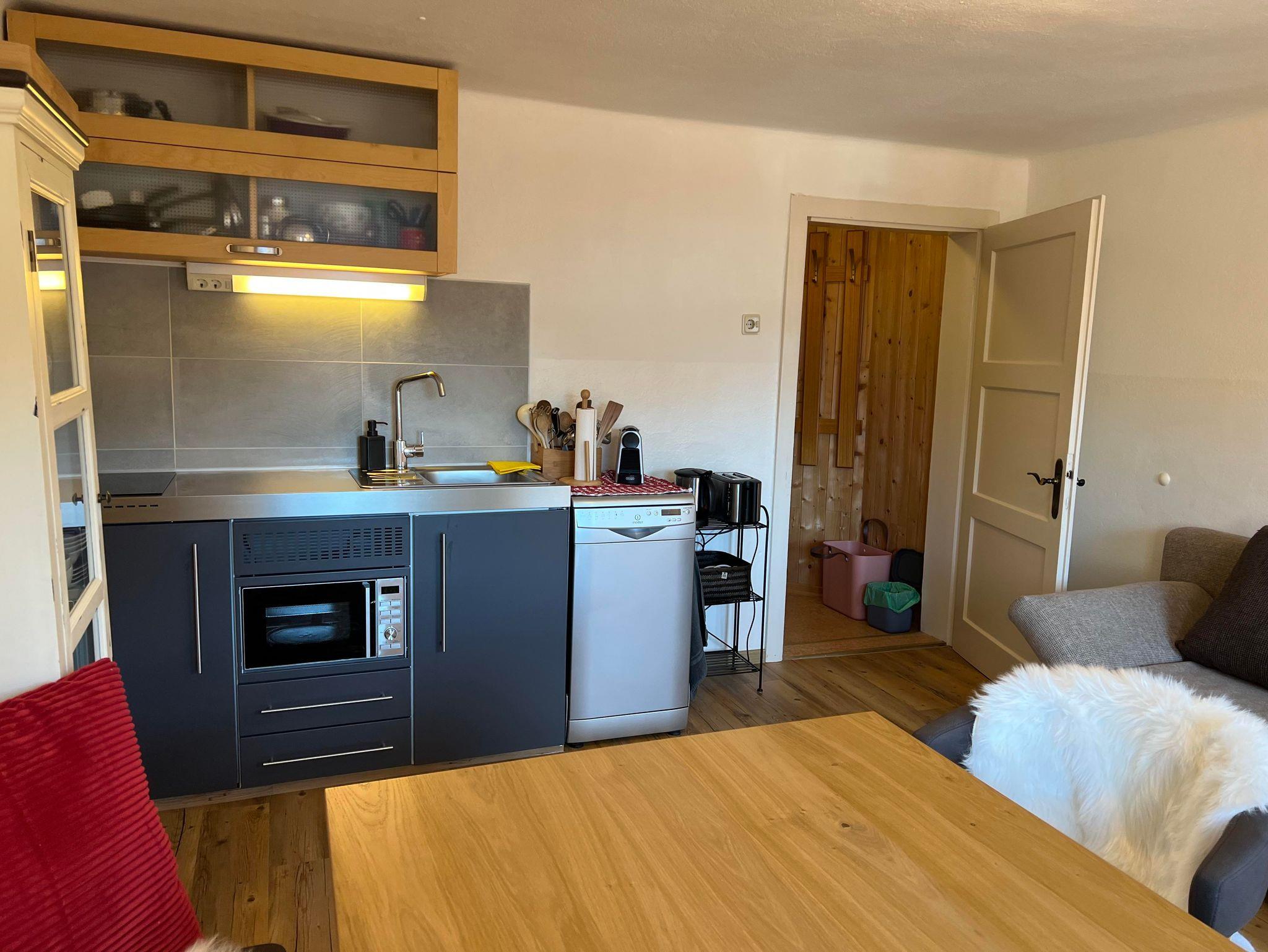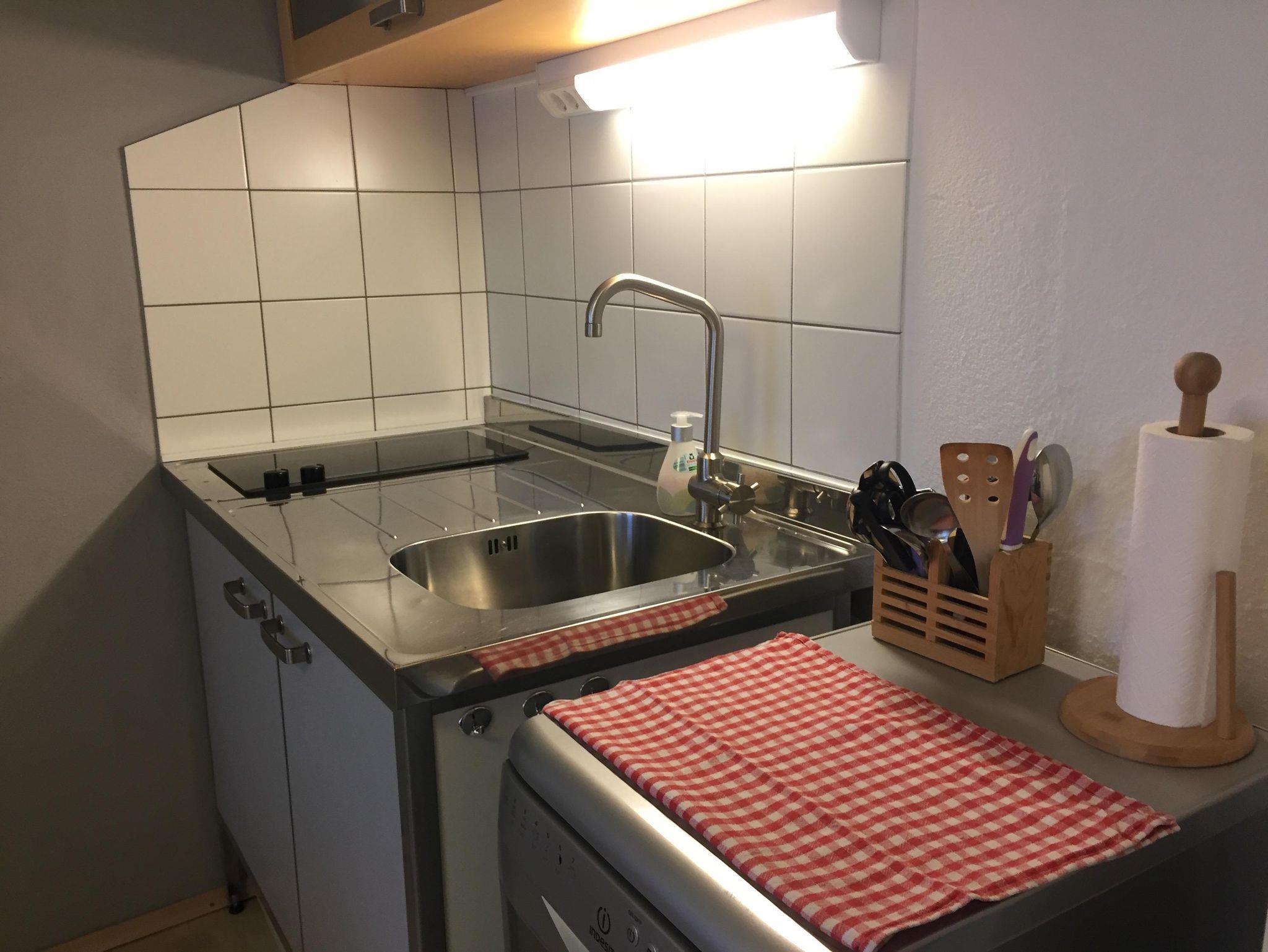 Wohnzimmer 15 m² mit Küche, 2 Kochplatten, Kühlschrank mit Gefrierfach, Radio, Kaffee Maschine, Wasserkocher