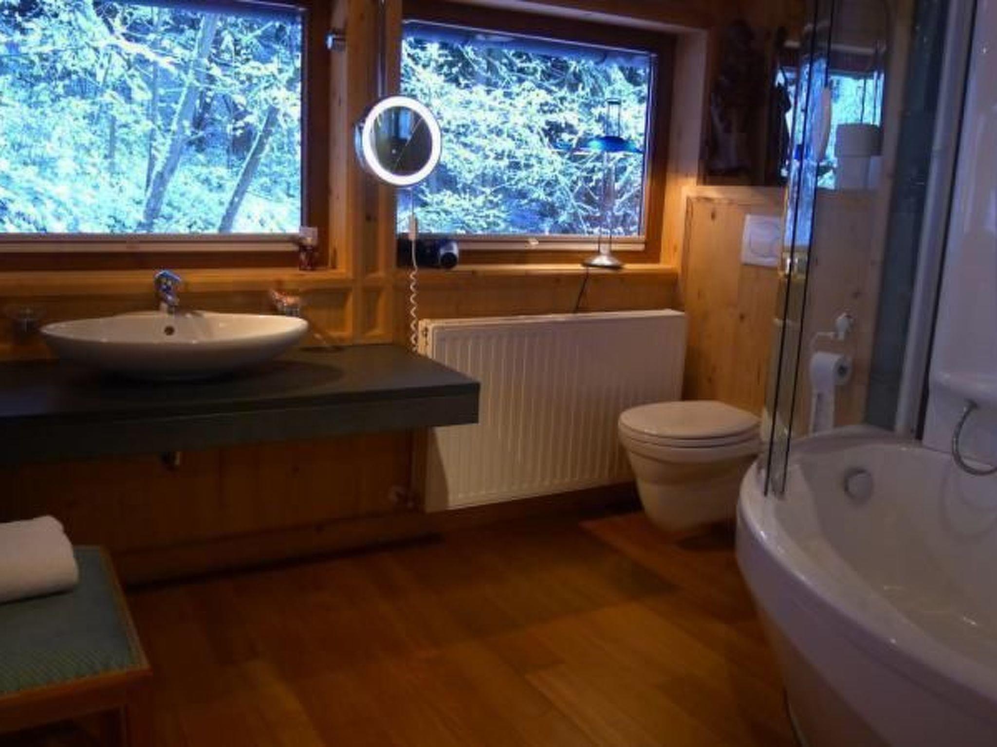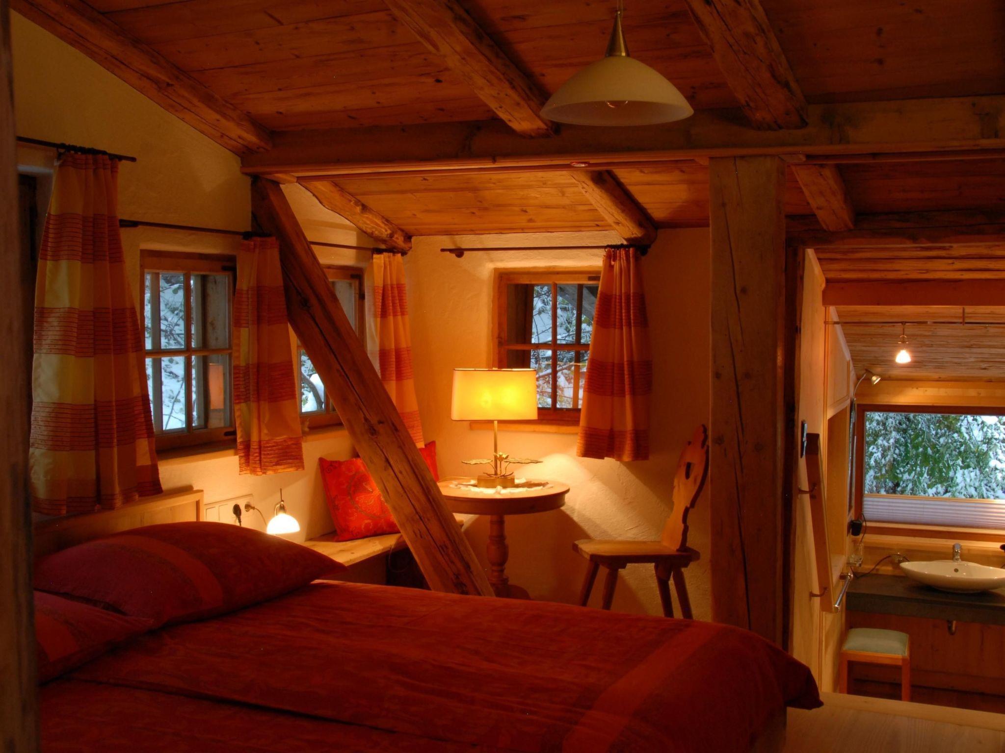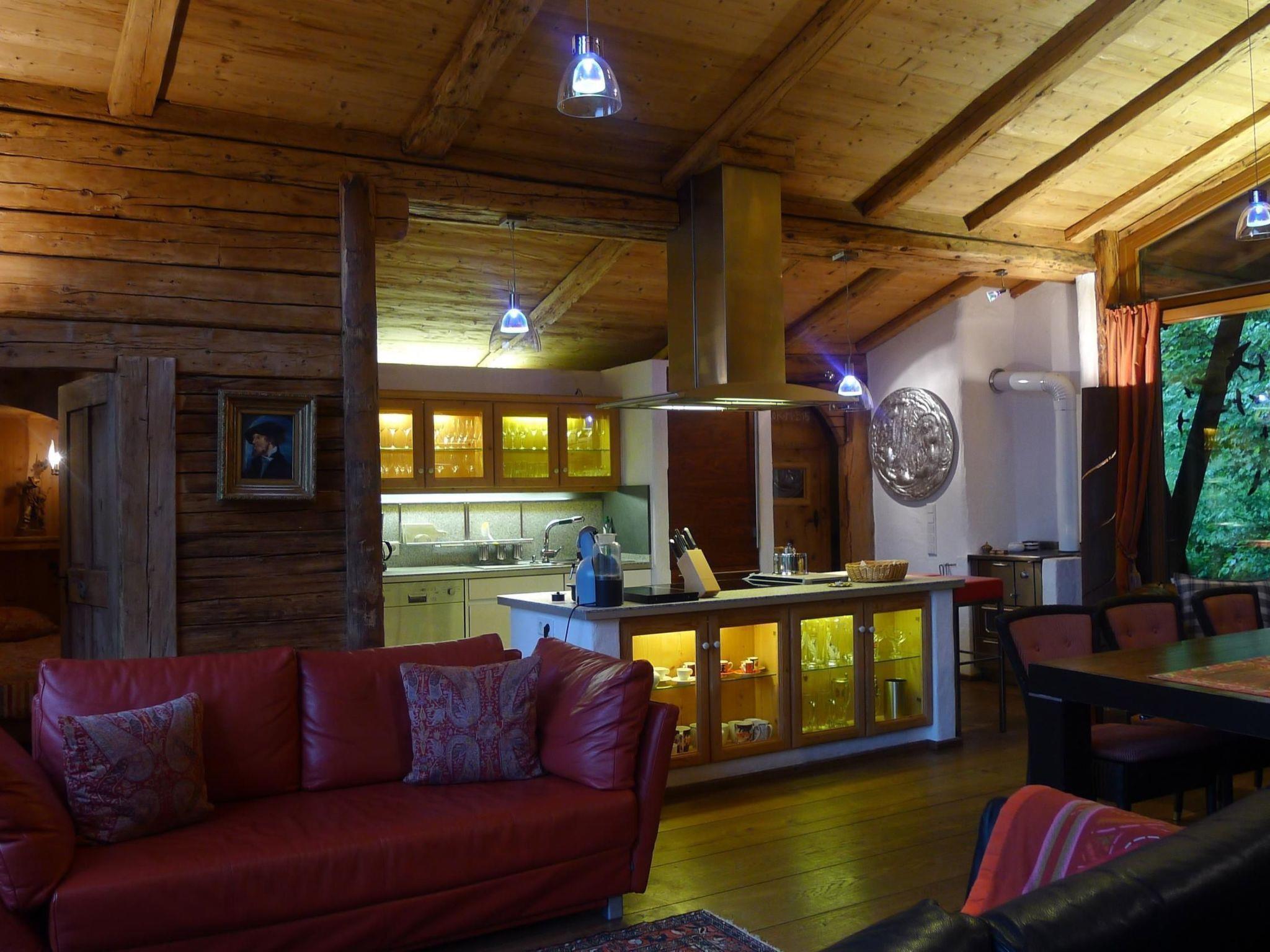 The ultra-modern kitchen equipment naturally includes a spacious fridge with freezer compartment (Miele), a dishwasher (Miele), an electric oven (Miele-Imperial), a wood-fired oven, a lava stone grill (Gaggenau), electric hobs and induction cookers (Küppersbusch), a Saeco espresso machine, bread slicer, a steam cooker (Imperial) and plenty of cupboards for crockery (fully stocked, of course) Do you enjoy cooking? Then you'll get your money's worth in our kitchen. A pair of stylish bar stools at the all-round kitchen counter create a modern atmosphere, and you can make yourself really cosy on the red leather couch, while a large HD plasma TV with satellite connection (including Sky) and a Beolit 12 from Bang & Olufsen provide entertainment. A large dining table is available for socialising. The large south- and north-facing windows and the extensive, largely indirect lighting (Swarovski living room lighting) as well as the solid, partly handcrafted furniture made of untreated natural wood lend the room a special flair. The generous window front provides a great view of the valley and pleasant lighting. This window front can also be opened for a breath of fresh air - outside there is a terrace with a glass front, table and seating. BATHROOMS Three bathrooms - a touch of wellness. The first bathroom is equipped with a combined bathtub and massage shower. Toilets, washbasins and towel rails can of course be found in both bathrooms. The second impresses with a massage shower and a spacious round bathtub. Three windows provide a wonderful view of nature and the valley from the bathtub. The third bathroom, which was only built in 2007, also has a shower and toilet. Our bathrooms are equipped with natural products (old antique wood panelling, teak floors, wet area with local slate). We also provide towels.