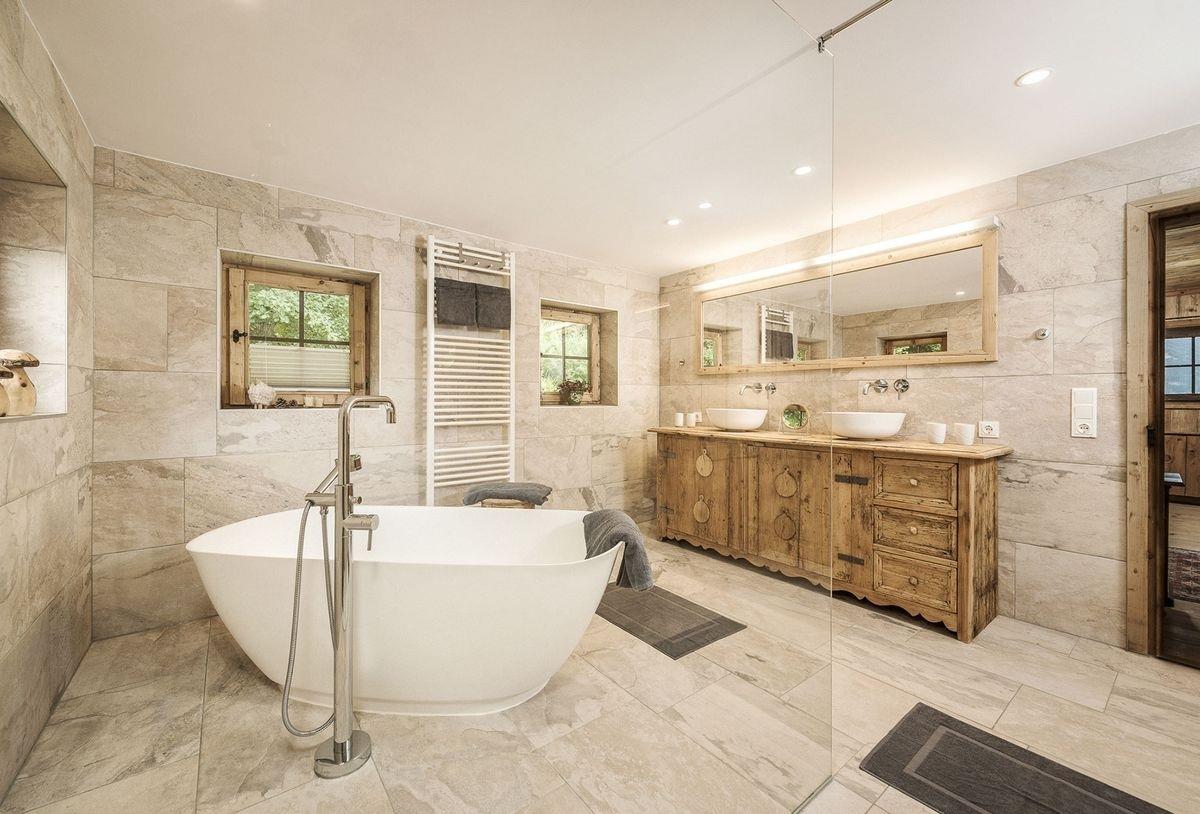 1 neues Badezimmer mit freistehender Badewanne, Regendusche, Doppel-Waschbecken, WC und Haartrockner