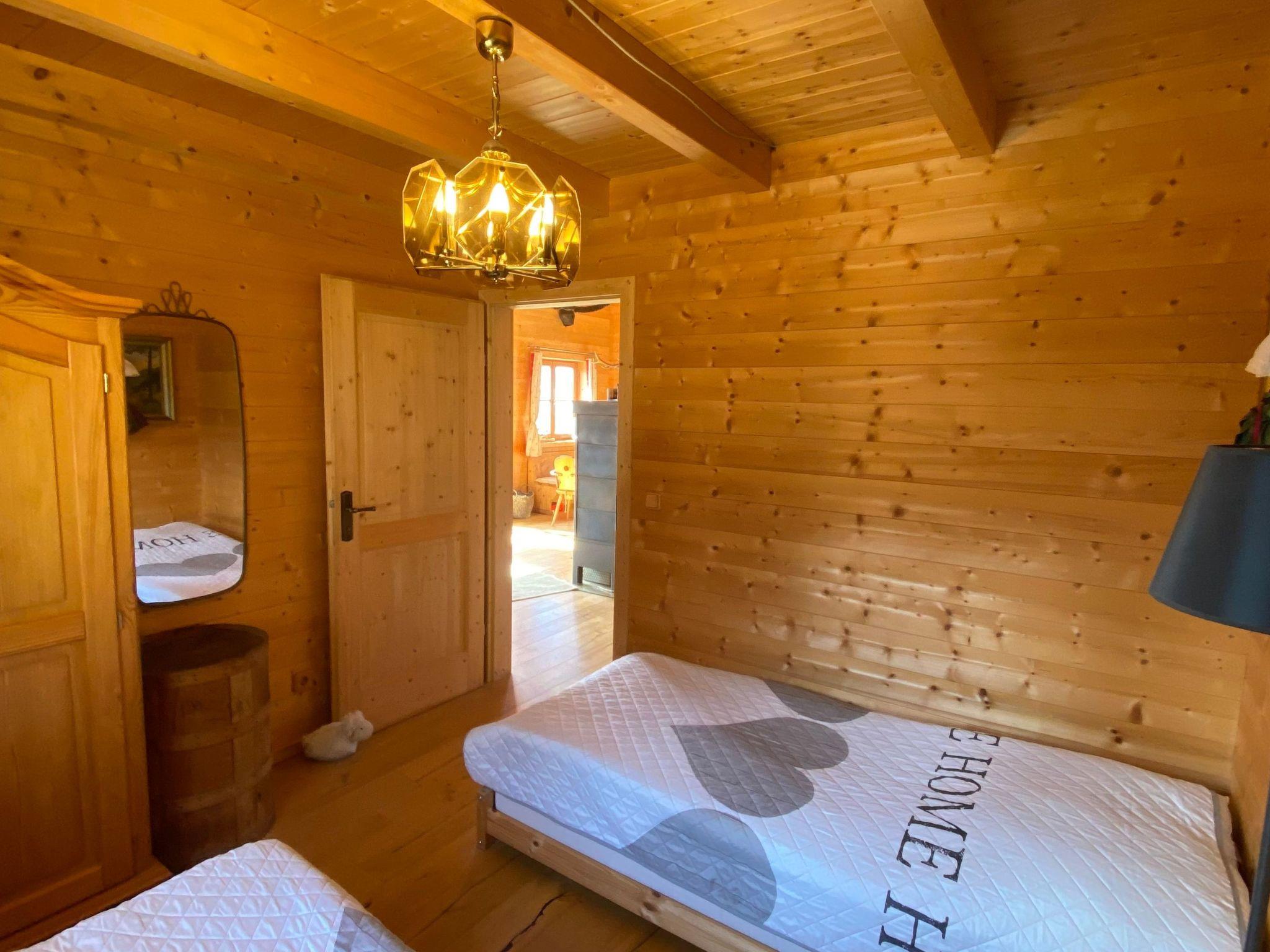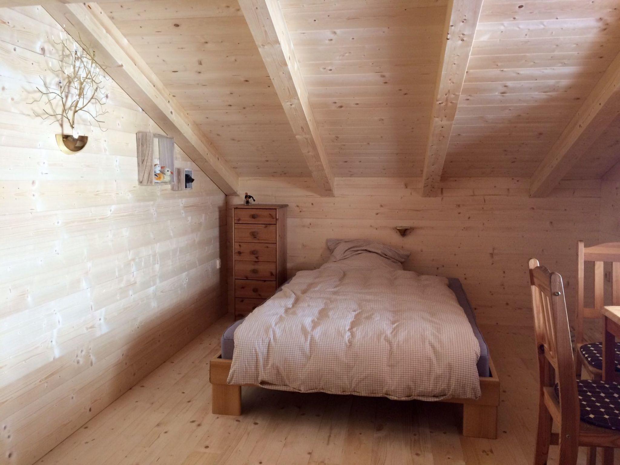 The holiday home has a living space of approx. 70 m², divided over two fully heated floors. The cosy wooden cabin offers a living and dining area with fully equipped kitchen and fireplace, three bedrooms and a modern bathroom with shower, washbasin, hairdryer and WC. The first bedroom is furnished with a king-size bed (1.60 m wide), which is particularly impressive due to the romantic bed canopy. The second bedroom has a stacked bed consisting of two 0.90 m wide single beds. The third bedroom in the attic is designed as a bed store and has a queen-size bed (1.40 m wide) and a table with two chairs. There is another bed in the living room, but this is not intended as a place to sleep. Instead, the single bed in the living area serves as a cosy seating area.