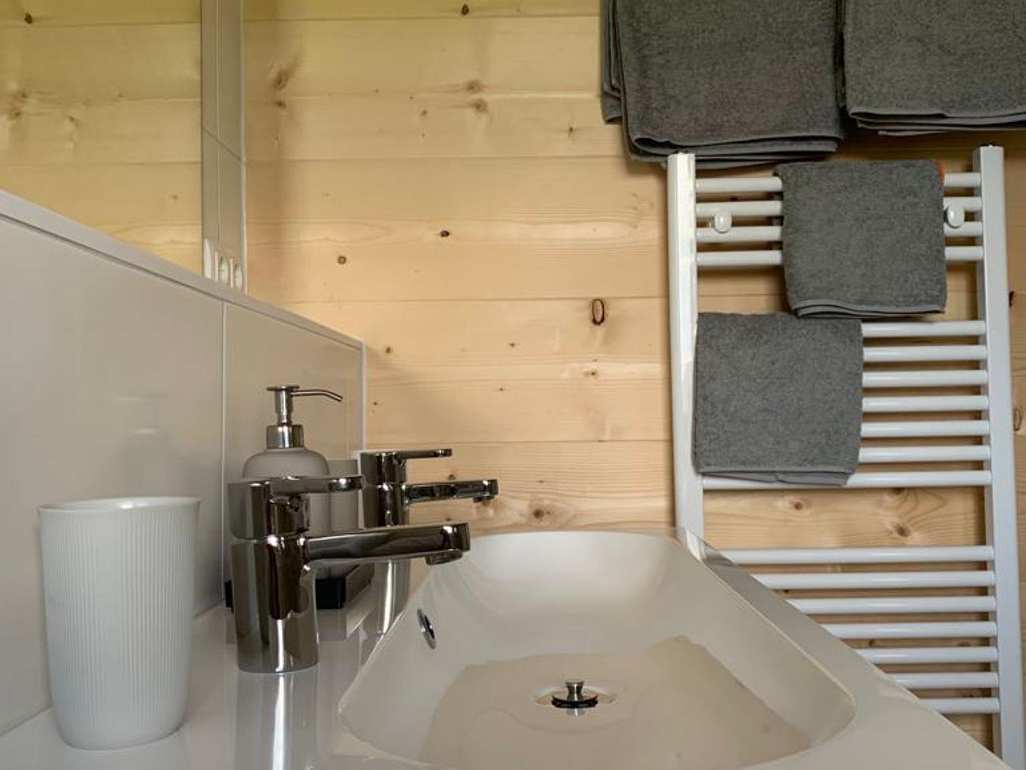 Unser Blockhaus verfügt über zwei Doppelzimmer mit je einem eigenen Badezimmer inkl. Doppelwaschbecken und einer begehbaren Dusche. Für mehr Platz befindet sich in den Zimmern außerdem je ein Zusatzbett.
