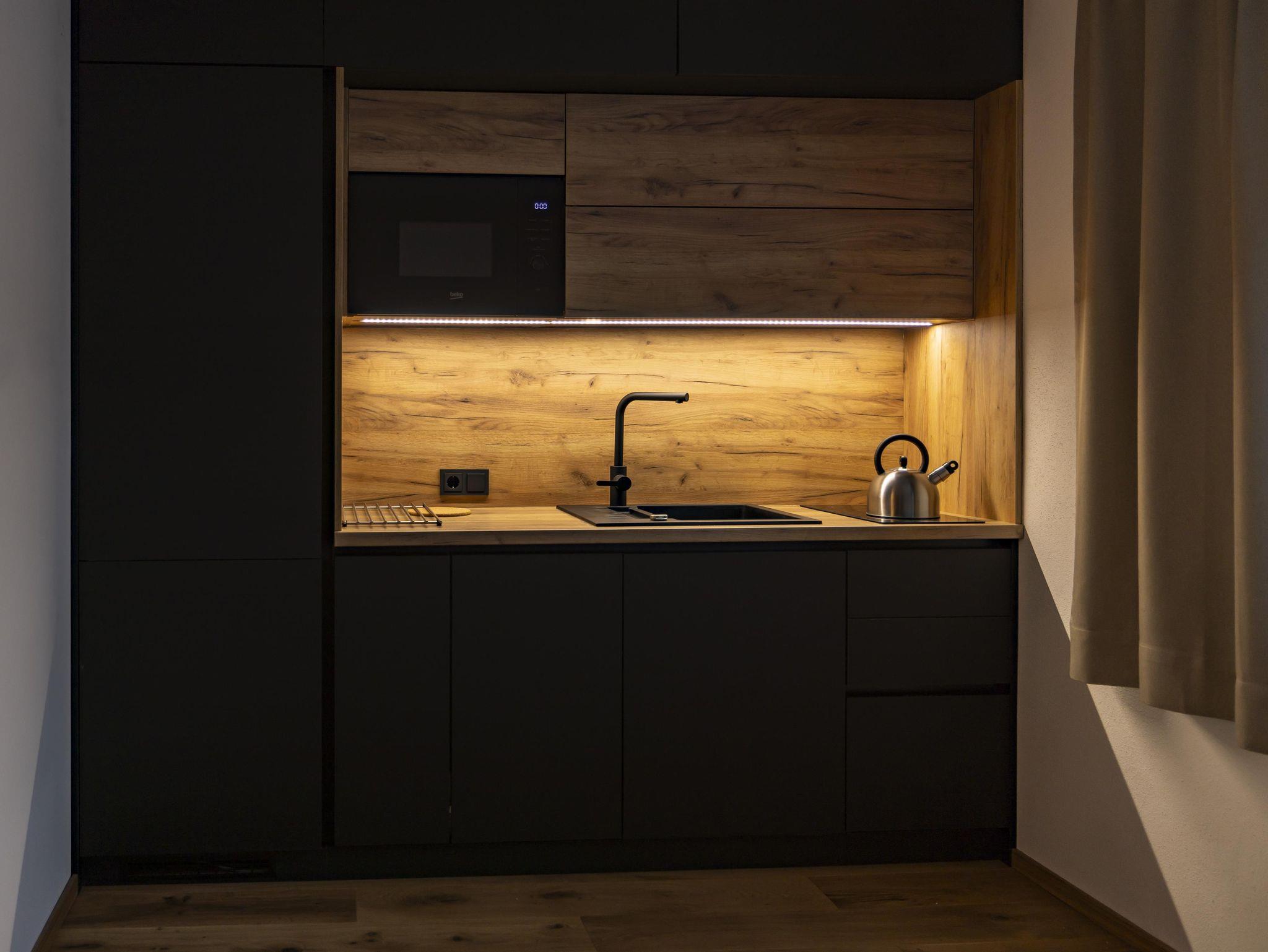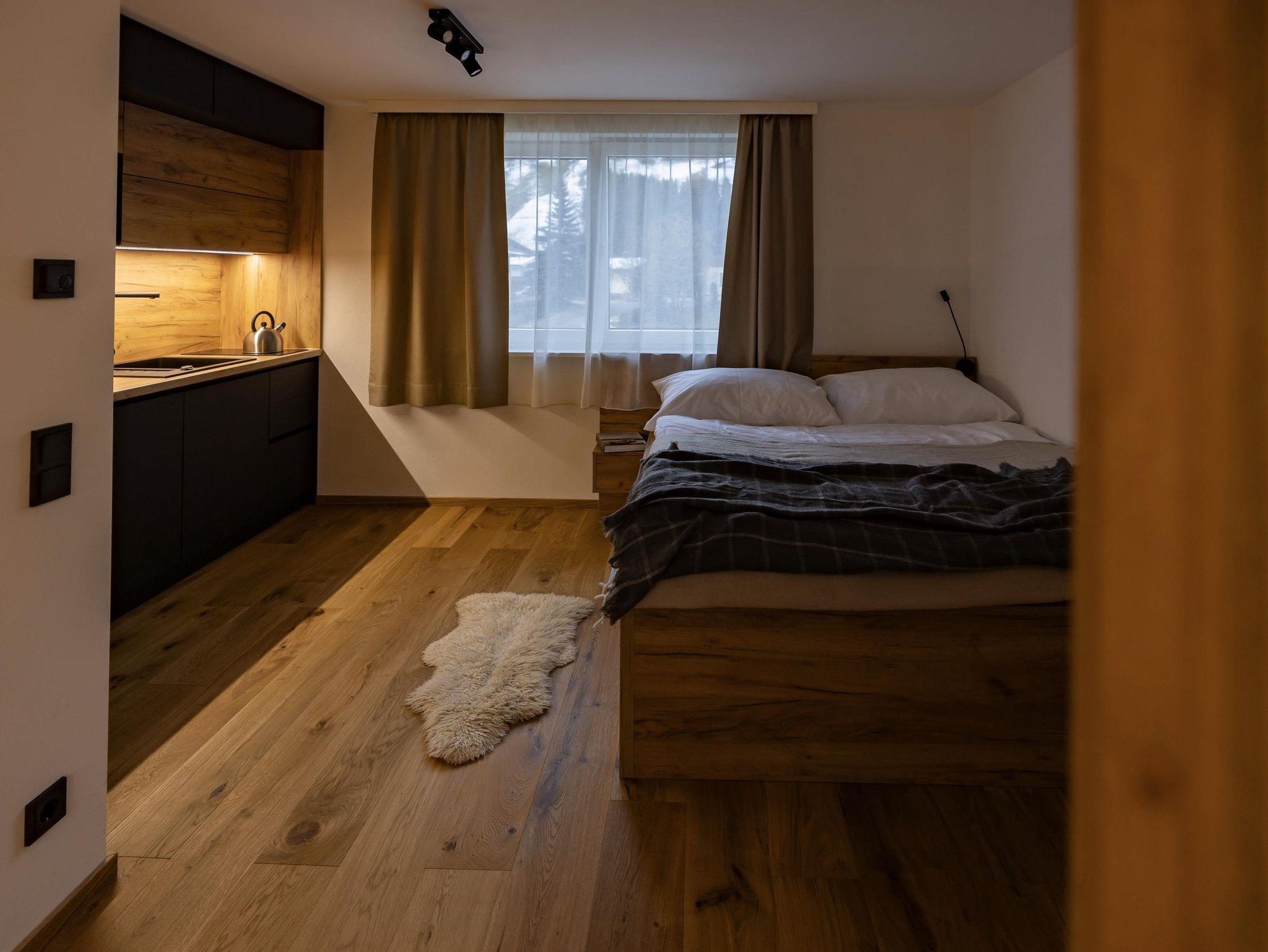 Romantische Unterkunft für zwei Personen. Voll ausgestattetes Studio mit Doppelbett, Bad und geräumigem Balkon für ungestörte Momente der Entspannung nach anstrengenden Tagen in den Bergen.