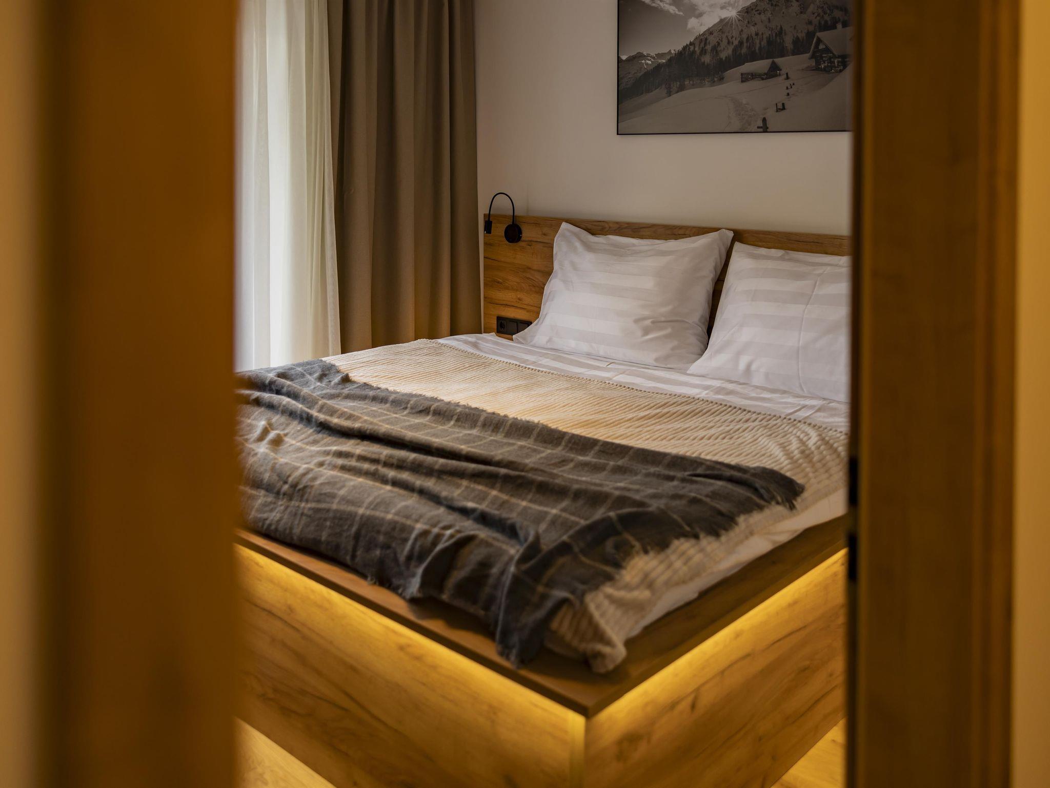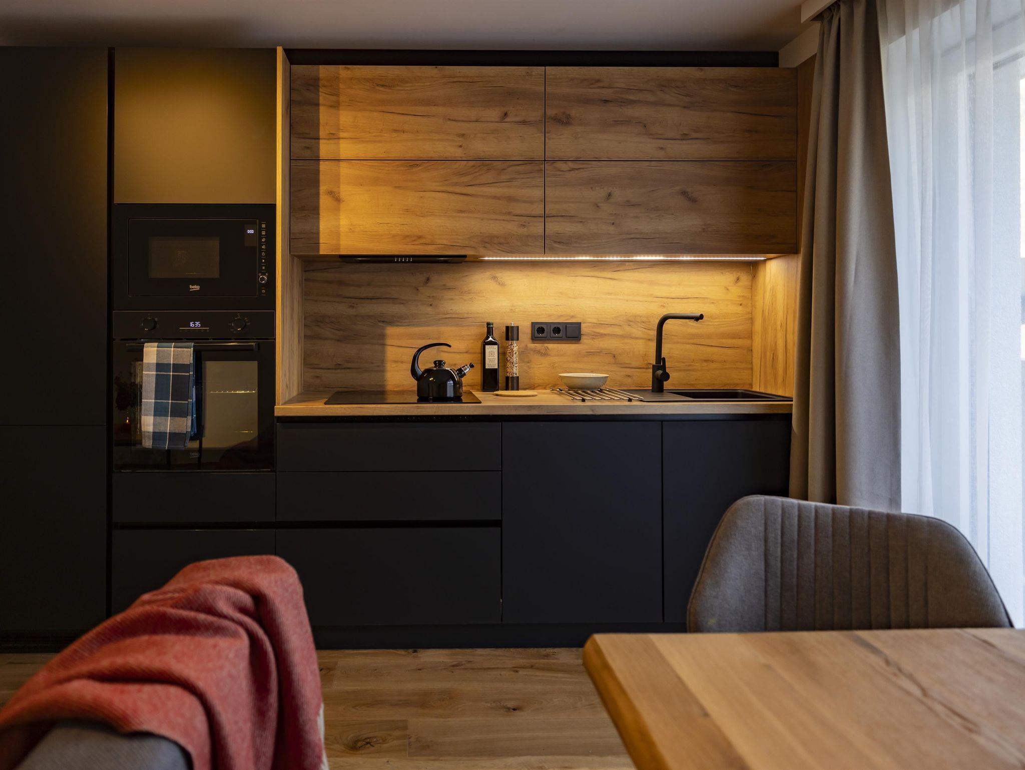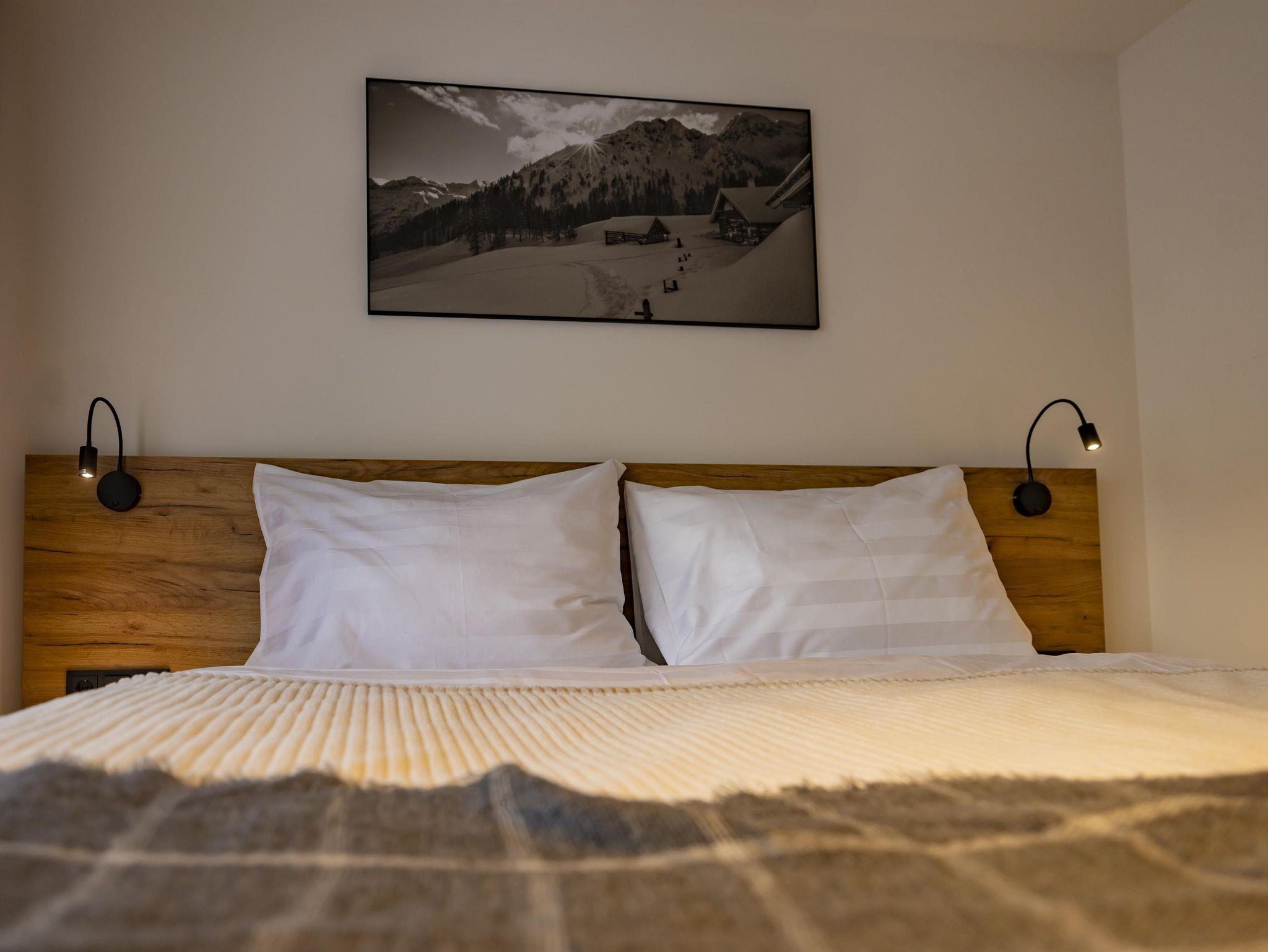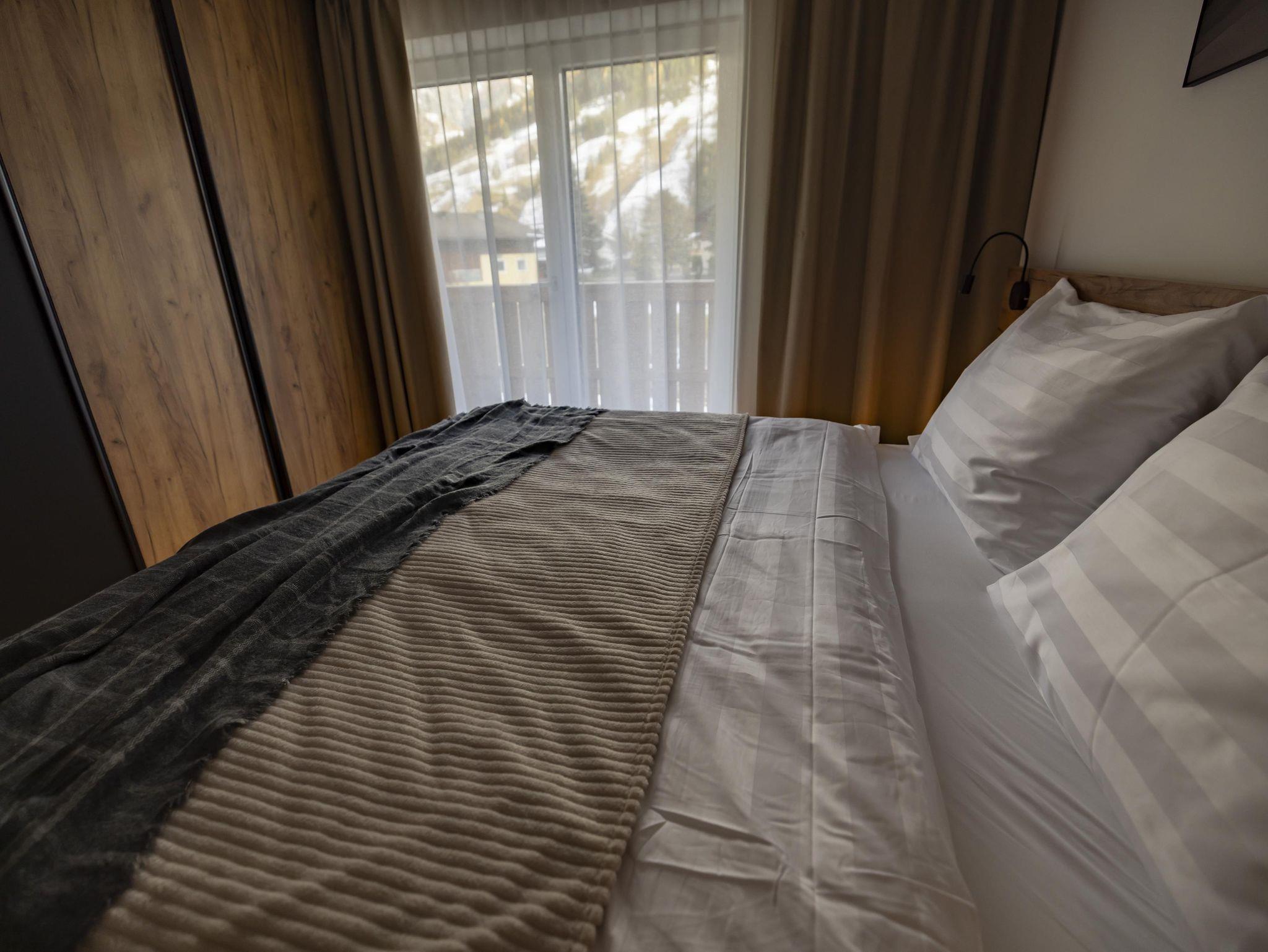 Im ersten Stock des Appartementhauses erwartet Sie eine schöne Wohnung, in der Sie von jedem Zimmer aus auf einen großzügigen Balkon treten und mit Blick auf die schneebedeckten Gipfel der Alpen entspannen können. Zwei getrennte Schlafzimmer mit Doppelbetten, ein geräumiges Badezimmer mit WC und eine gemütliche Küche mit Wohnzimmer garantieren maximalen Komfort für bis zu 6 Personen.