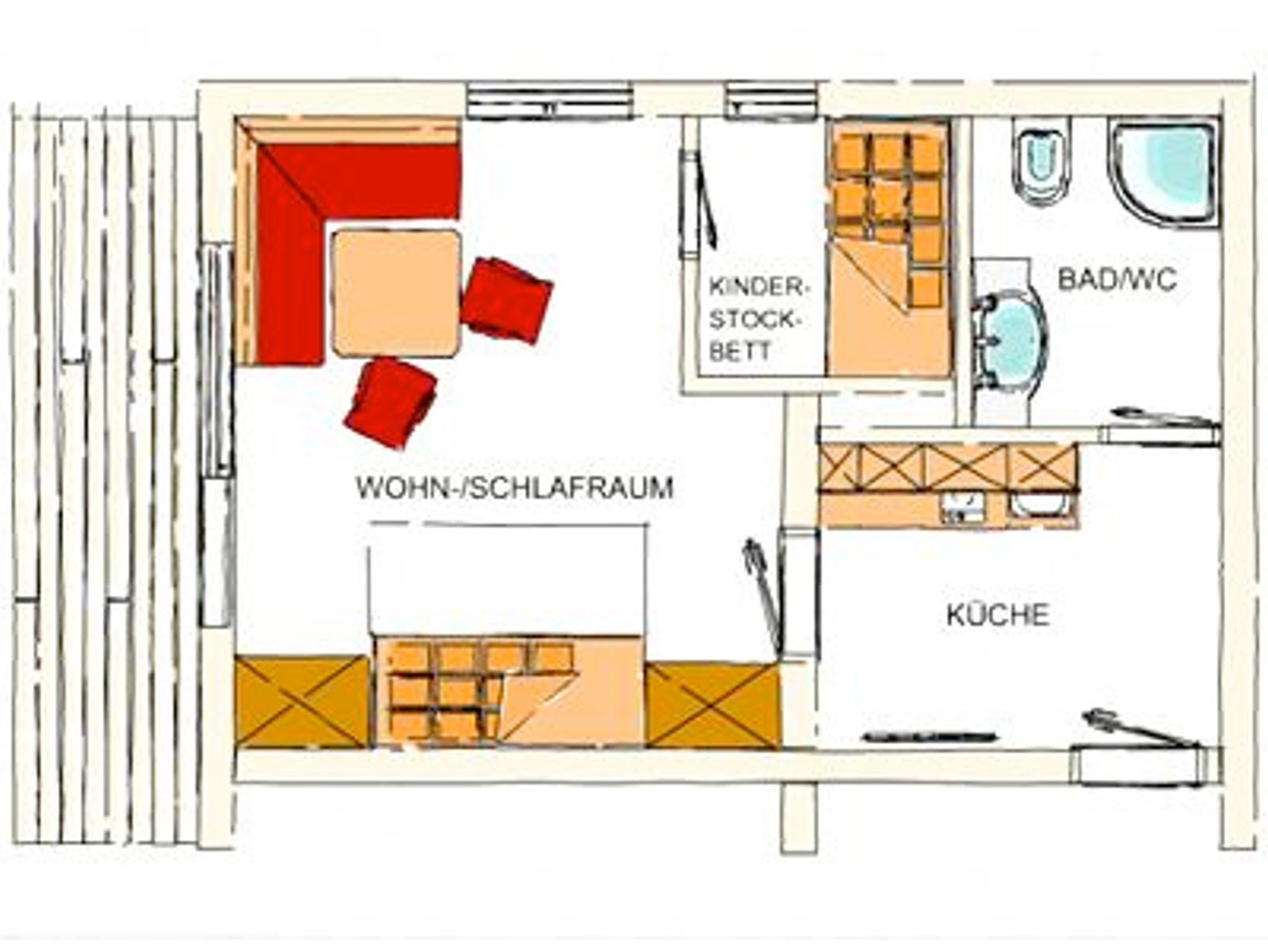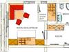 Typ-2: Platteck: 2 Erwachsene + 2 Kinder mit Südbalkon, Küche im Vorraum der Wohnung nagelneu eingerichtet, Eckbank mit Esstisch, DU/WC, Wohn-Schlafraum für 2 Erwachsene, kleiner mit Schiebetür getrennter Schlafraum (Bettenlänge 165cm)