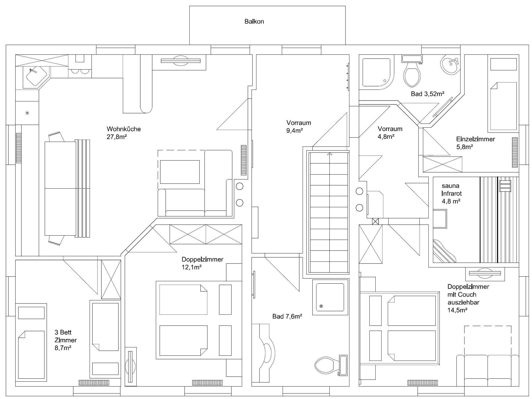 Unser neu errichtetes Appartement bietet Platz für bis zu 9 Personen und besteht aus 4 Schlafräumen, einer Wohnküche und 2 Badezimmern mit Dusche und WC.