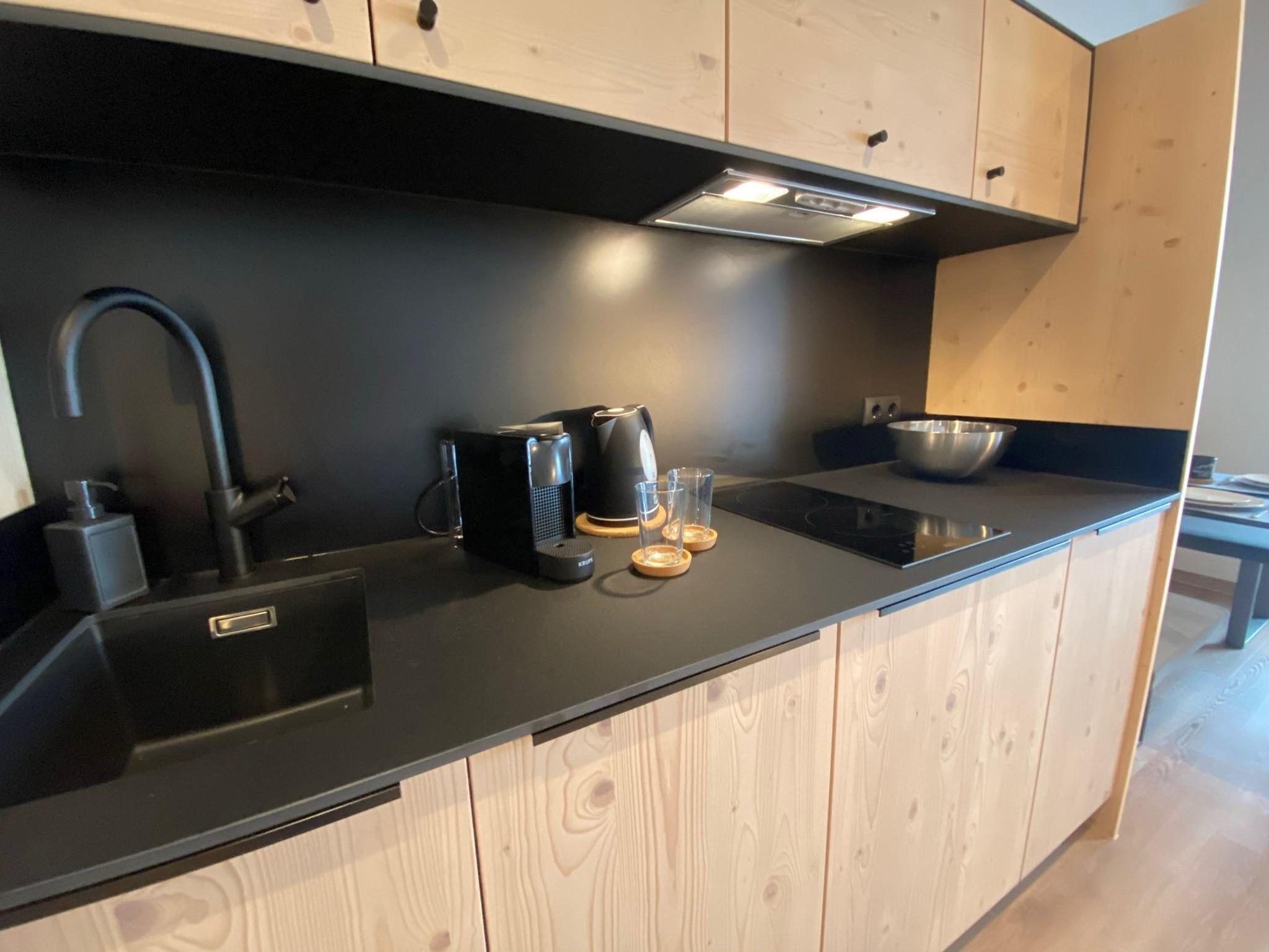 Der offene Wohn- und Schlafbereich, das Badezimmer und die vollfunktionale Küche lassen keine Wünsche offen – alles in klaren Formen und natürlichen Materialien gehalten.