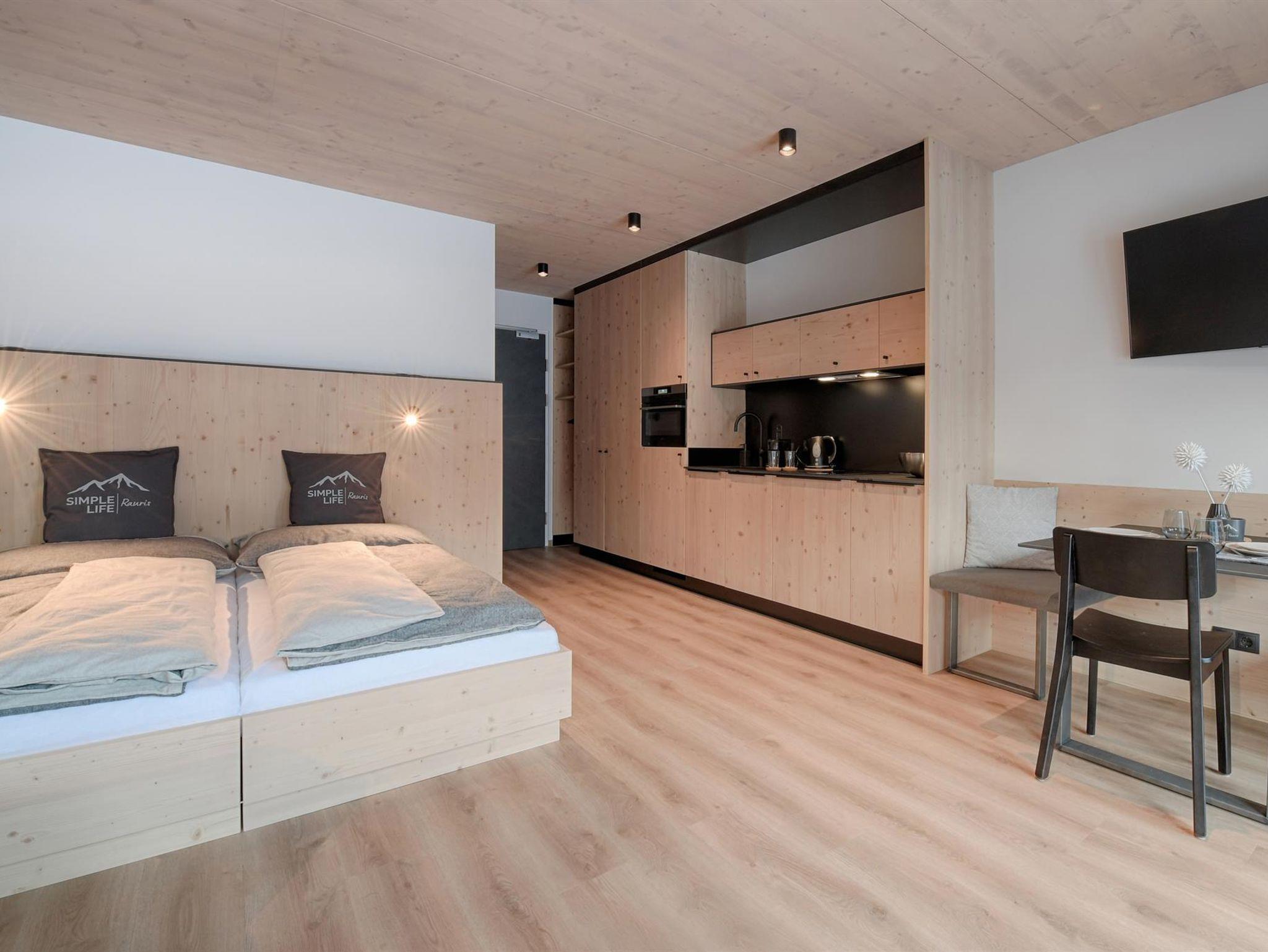 Unsere großzügigen 1 Zimmer Apartments punkten mit trennbaren Doppelbett, gratis WLAN, neueste Technologie (elektronischem Zutrittssystem, mobiler Handy Schlüssel), großen Terrassen oder Balkonen und einem besonders angenehmen Raumklima durch den kompletten Massivholzbau.