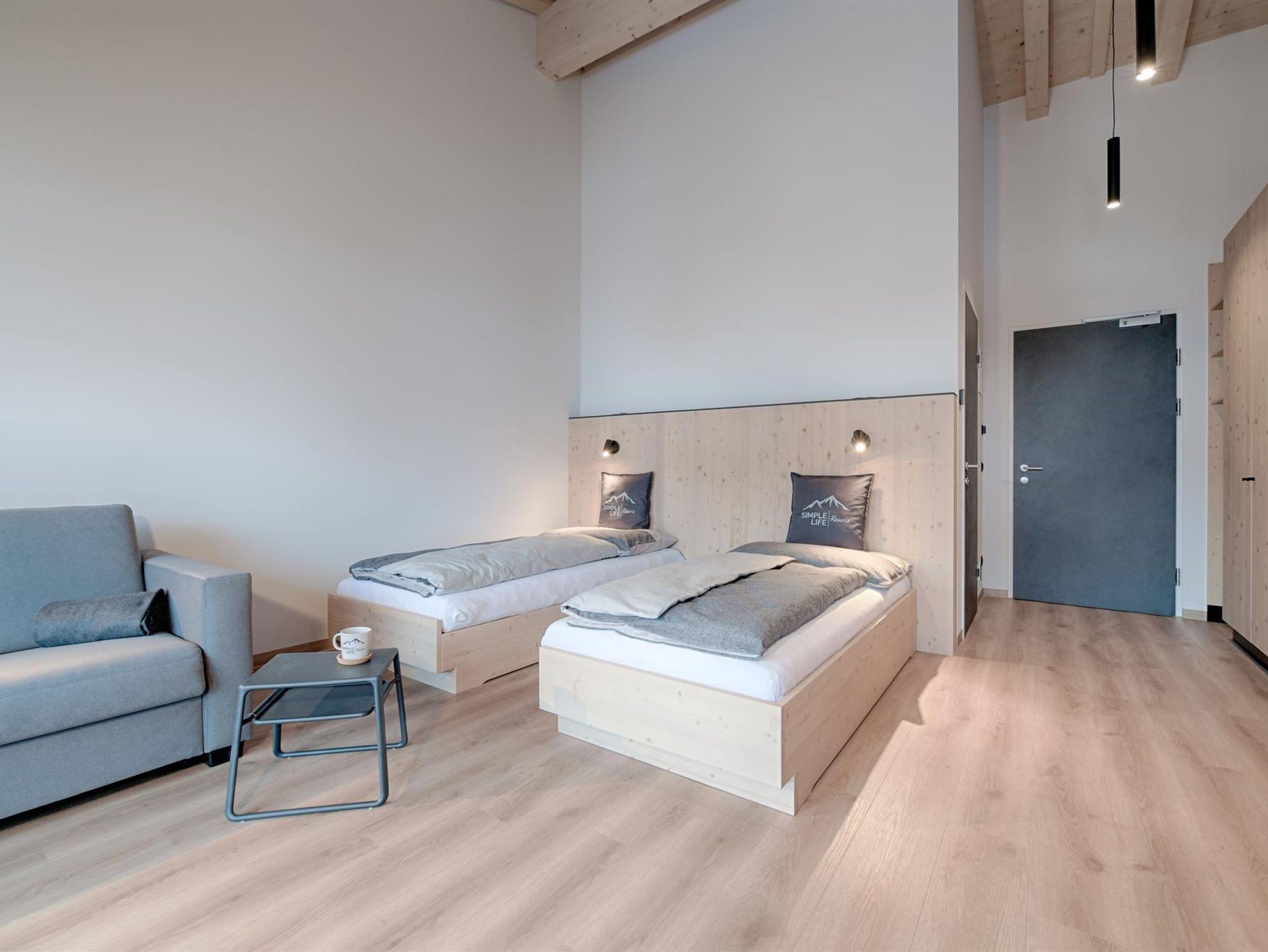 Unsere großzügigen 1 Zimmer Apartments punkten mit trennbaren Doppelbett, gratis WLAN, neueste Technologie (elektronischem Zutrittssystem, mobiler Handy Schlüssel), großen Terrassen oder Balkonen und einem besonders angenehmen Raumklima durch den kompletten Massivholzbau.