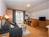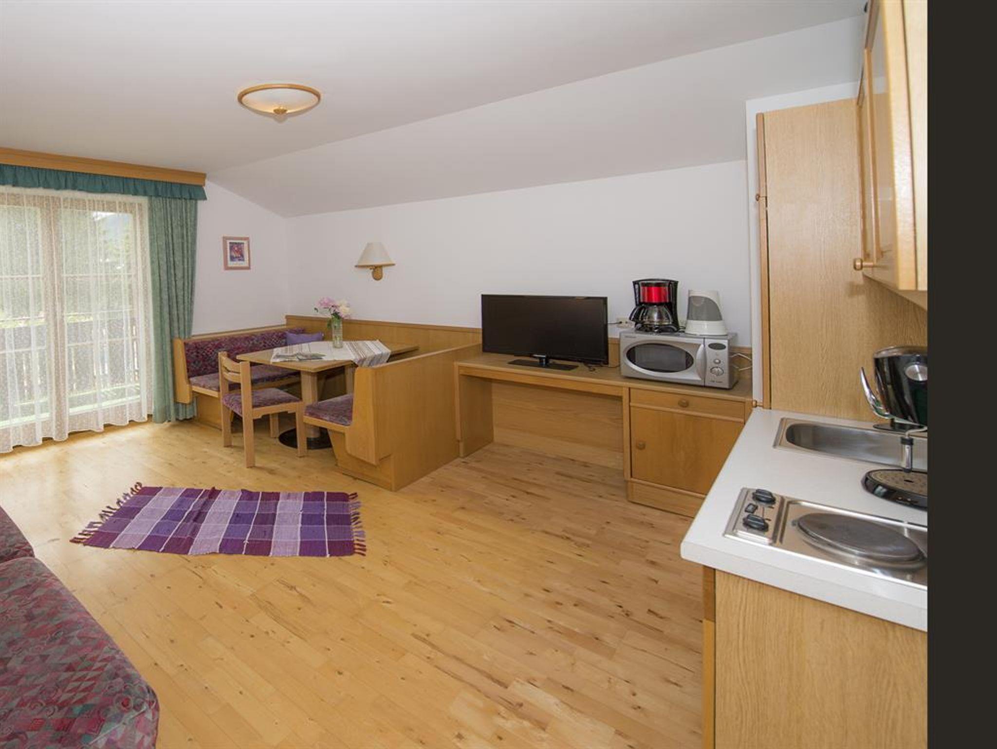 Appartement für 2 bis 5 Personen mit Schlafraum und Couchliege, Wohnschlafraum mit Doppelschlafcouch, Eckbank mit Eßtisch, Wohnküche, Balkon, TV, Dusche und WC, Vorraum;