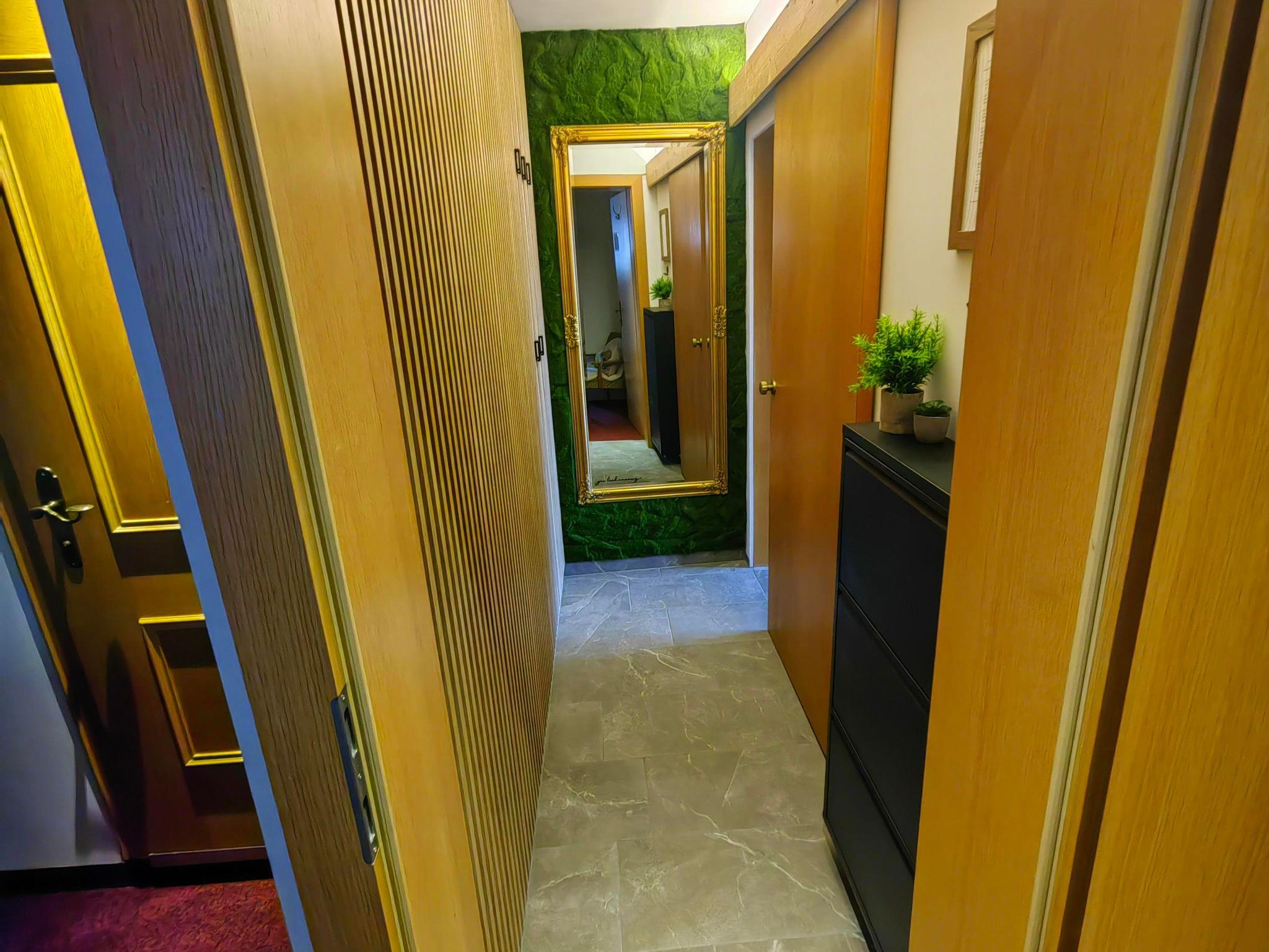 Neu renoviertes, großes Apartement für 4-6 Personen (ca. 70 m2) Großer Vorraum, großer Wohnraum mit ausziehbarer Couch und Essbereich sowie einer kleinen Küche, zwei Schlafzimmer mit Doppelbetten, zwei Badezimmer mit Duschen, zwei separate Toiletten, kleiner terrassenartiger Balkon Richtung Osten;