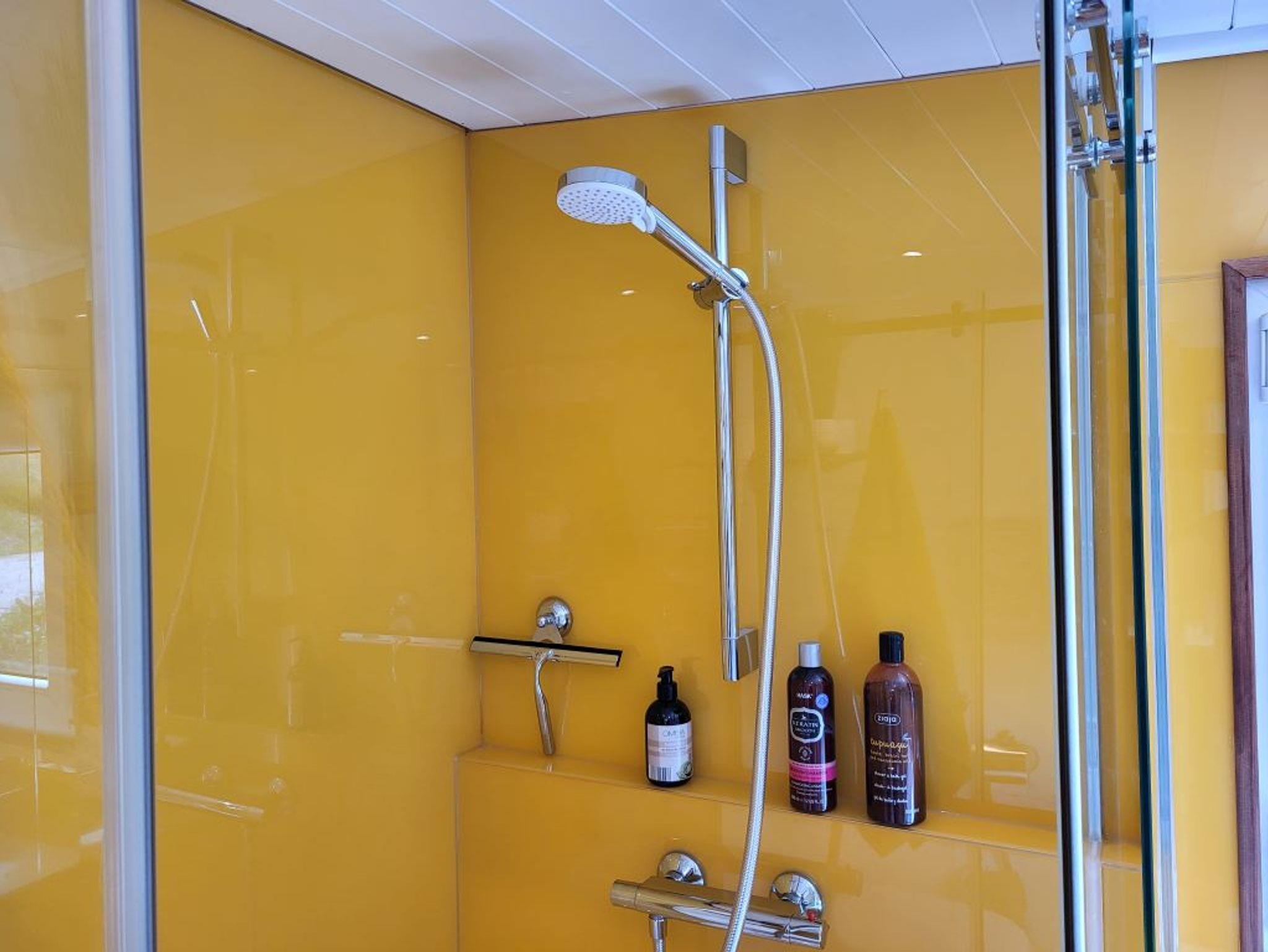 Badezimmer mit Waschbecken & Dusche, Duschgel & Shampoo, Handtüchern & Haartrockner