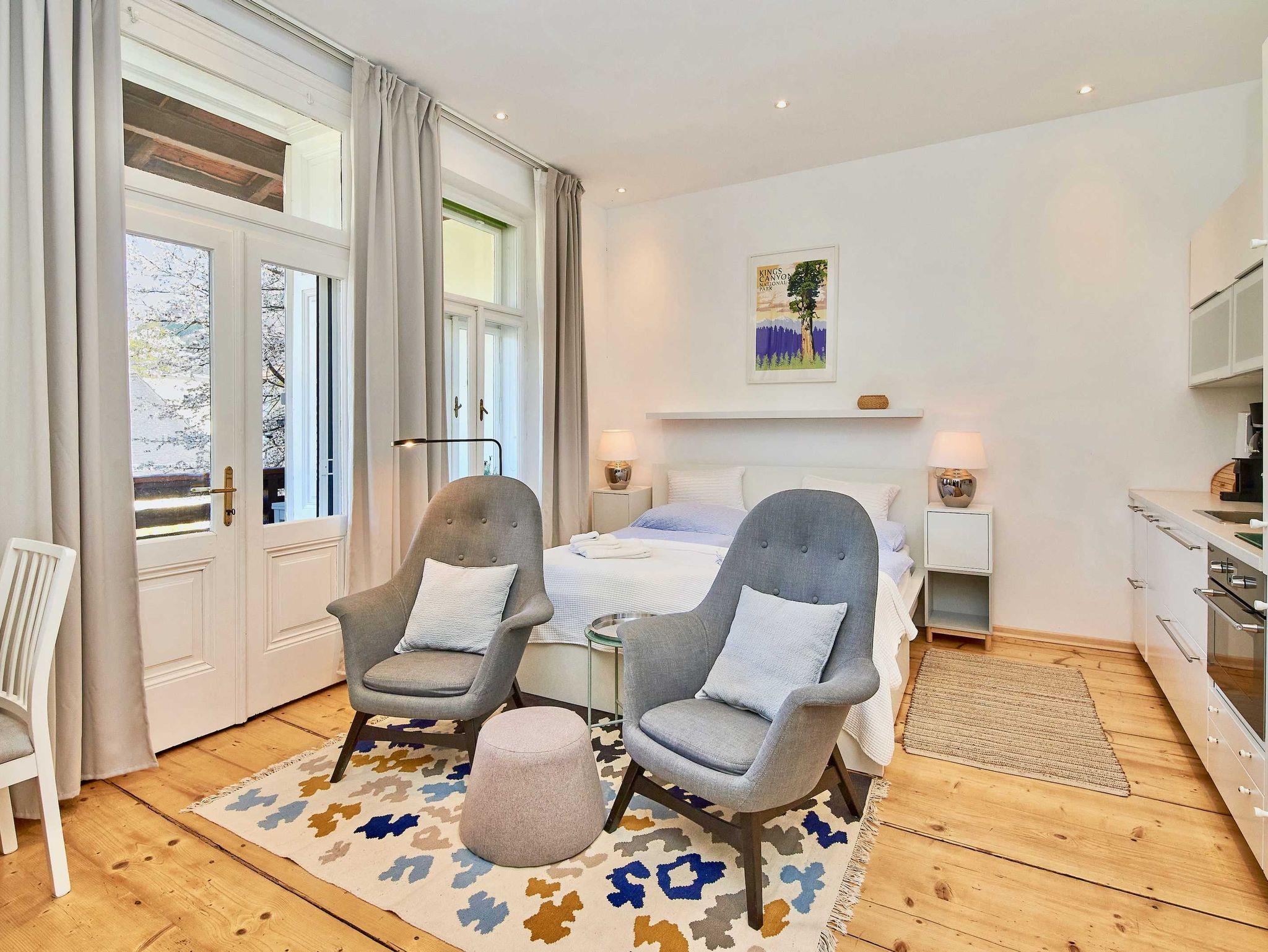 Das Studio Apartment mit Balkon und Raxblick bietet ausreichend Platz für zwei Personen, um einen entspannten Urlaub zu genießen. Der Balkon mit Direktzugang ladet ein, den Abend bei einem Glas Wein mit Blick auf das Raxgebirge ausklingen zu lassen.