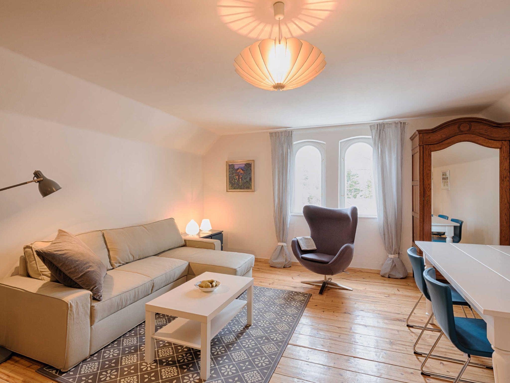 Ein gemütlich-gediegener Landhausstil zieht sich durch alle Apartments, mit Möbeln aus 3 Jahrhunderten. Alle Apartments sind nicht nur teppichbodenfrei, man bewegt sich überwiegend auf 120 Jahre alten Dielen. Dazu alle komfortablen Errungenschaften von heute: gemütliche Badewannen für Zwei (nicht in allen Apartments), Fußbodenheizung im Bad, durchgehend gratis WLAN, Ultraflachbildschirme mit SAT Anschluss (viele davon digital und damit streaming-fähig), DVD Player und eine Auswahl an DVDs etc. Pelletöfen in jeder Wohnung sorgen für gemütliche Wärme und Feuerschein auf Knopfdruck, auch wenn es jenseits des Winters einmal etwas kühler wird.