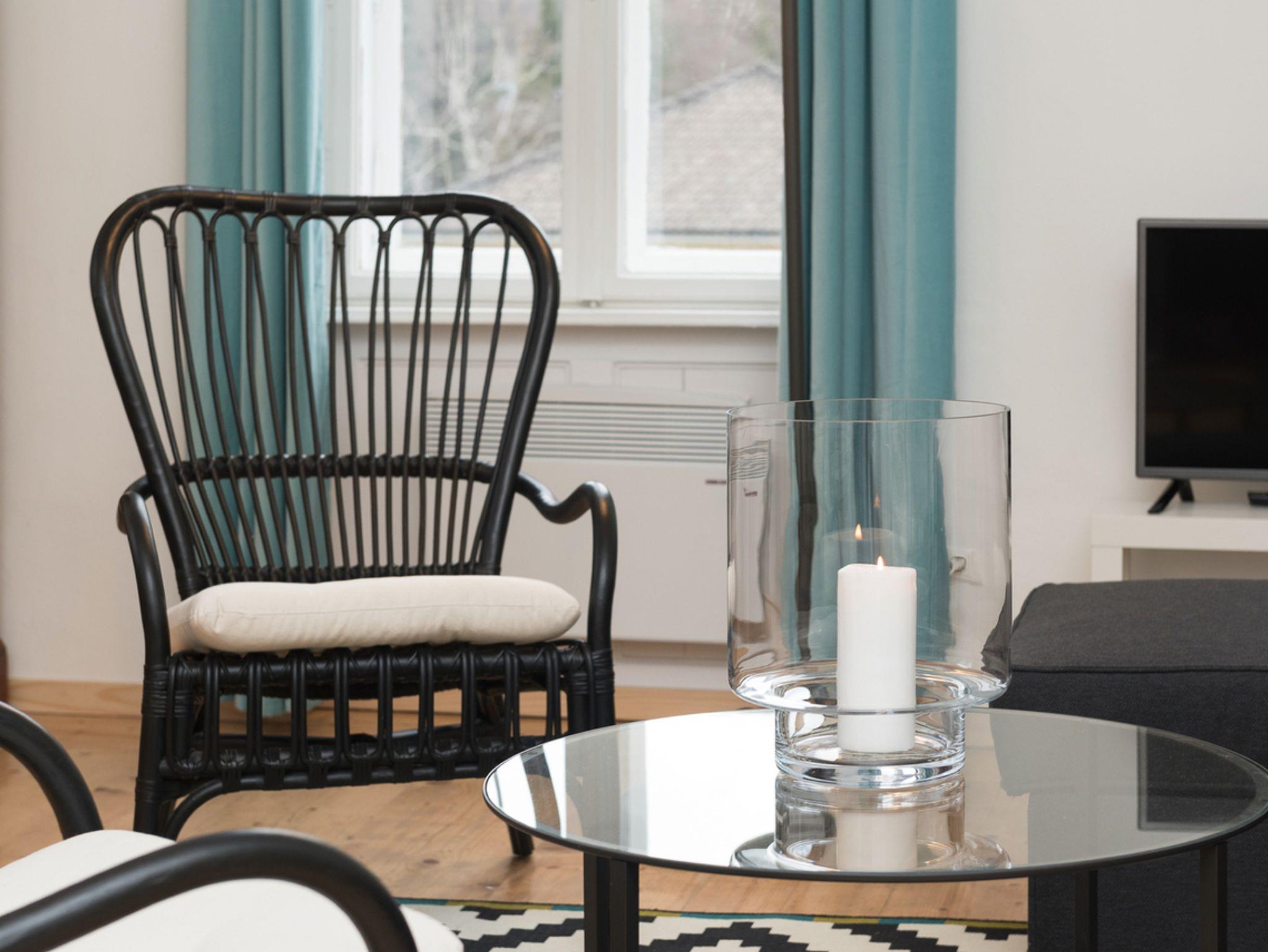 Ein gemütlich-gediegener Landhausstil zieht sich durch alle Apartments, mit Möbeln aus 3 Jahrhunderten. Alle Apartments sind nicht nur teppichbodenfrei, man bewegt sich überwiegend auf 120 Jahre alten Dielen. Dazu alle komfortablen Errungenschaften von heute: gemütliche Badewannen für Zwei (nicht in allen Apartments), Fußbodenheizung im Bad, durchgehend gratis WLAN, Ultraflachbildschirme mit SAT Anschluss (viele davon digital und damit streaming-fähig), DVD Player und eine Auswahl an DVDs etc. Pelletöfen in jeder Wohnung sorgen für gemütliche Wärme und Feuerschein auf Knopfdruck, auch wenn es jenseits des Winters einmal etwas kühler wird.