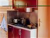 Die Küche grenzt an den Wohnbereich und verfügt über eine großzügige Raumaufteilung. Selbstverständlich ist die Küche komplett ausgestattet mit zwei elektrischen Kochplatten , Kochgeschirr, Geschirr für 5 Personen, Spüle und Kühlschrank. Neben der Küche befindet sich das Bad mit Dusche und WC.
