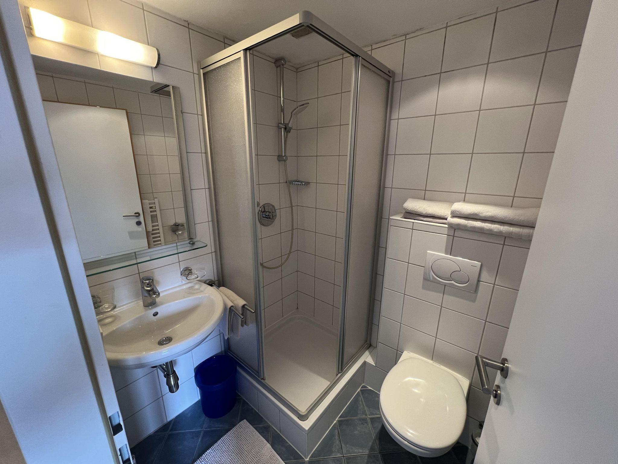 Badezimmer mit Dusche und WC.