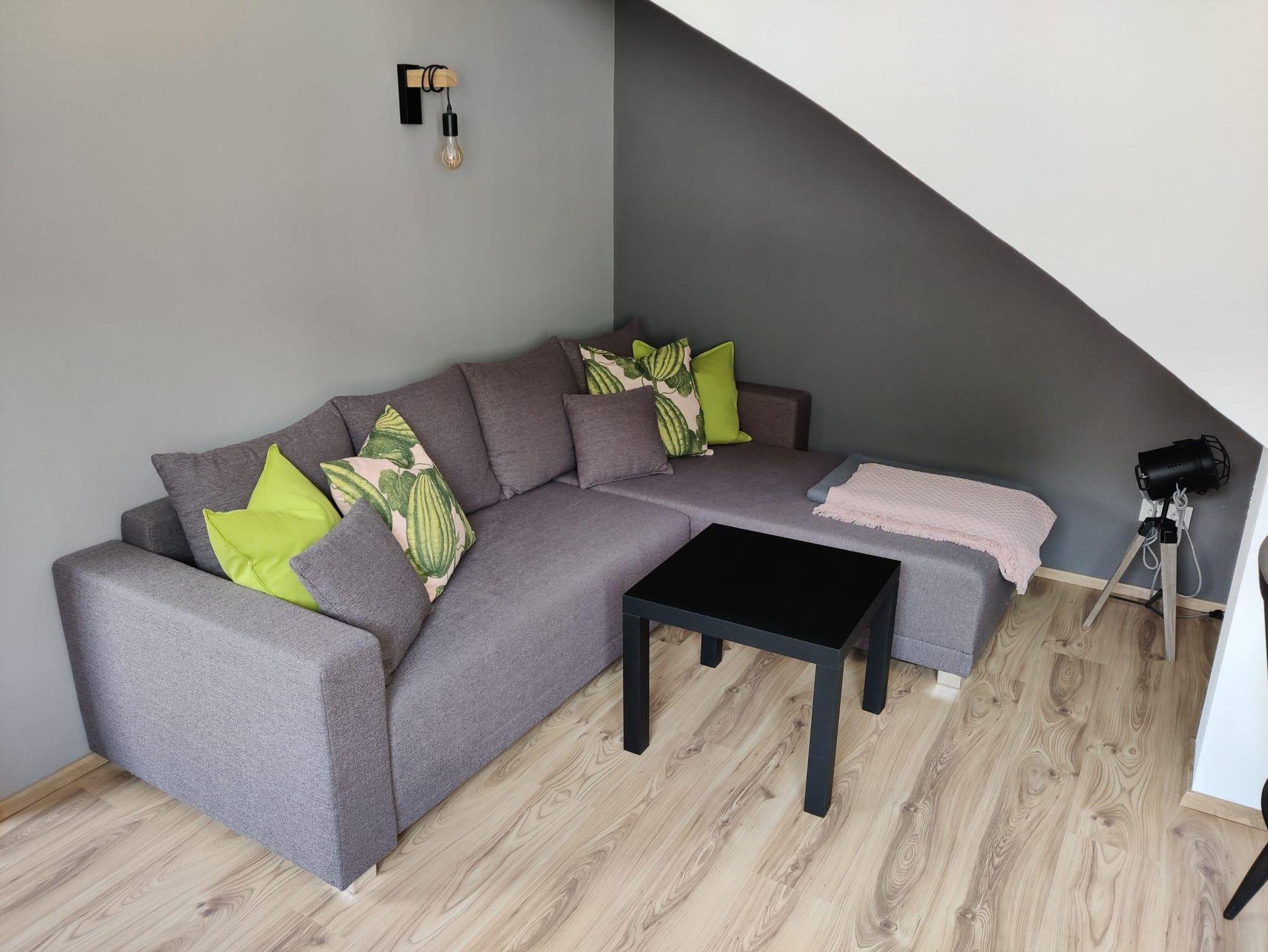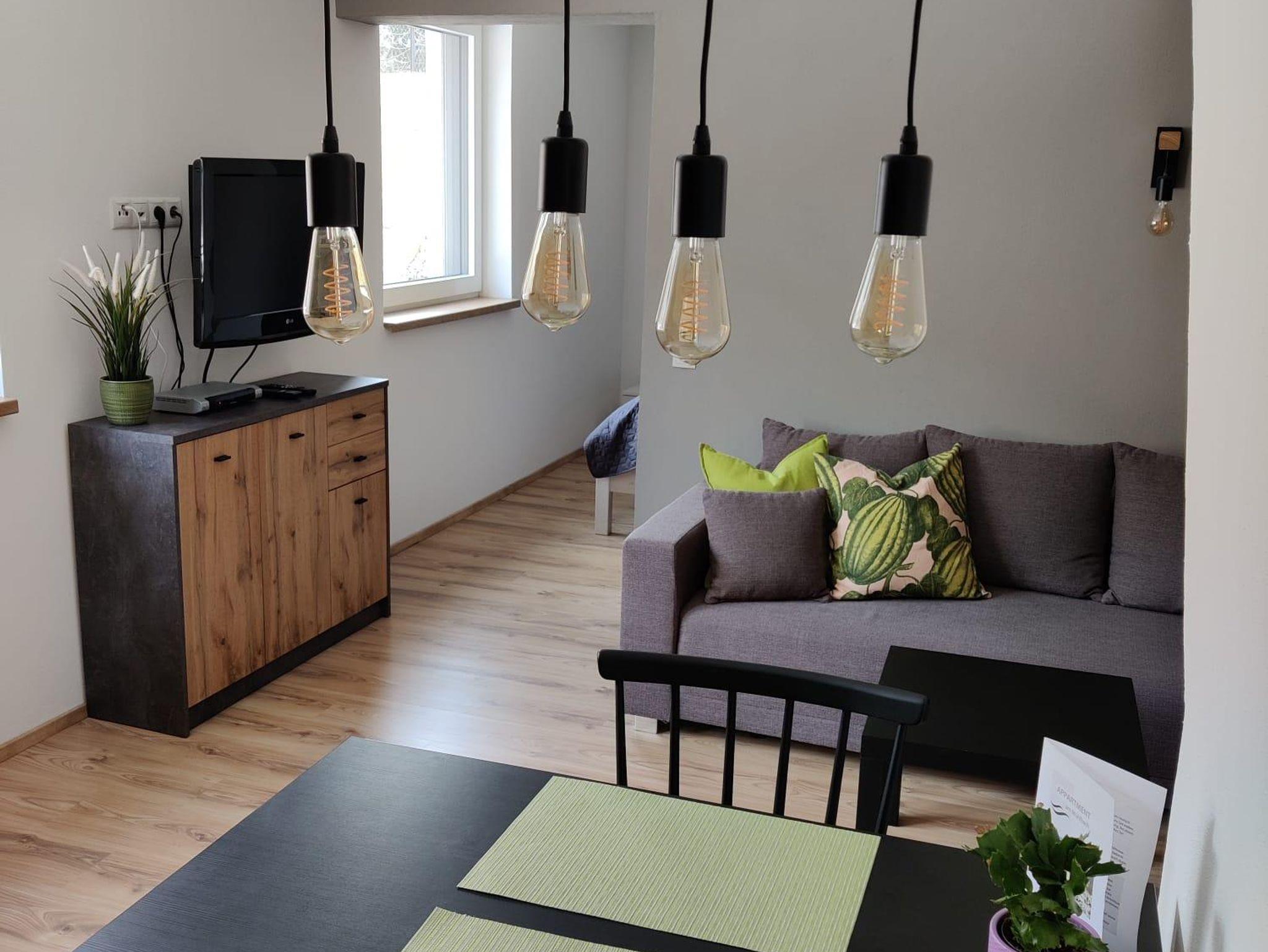 Das Apartment verfügt über einen Vorraum, ein Schlafzimmer mit Doppelbett sowie einem Bad mit Dusche und WC. Das Wohnzimmer hat einen Fernseher, ein Sofa, eine vollständig ausgestattete Küchenzeile sowie einen zweckmäßigen Essbereich.