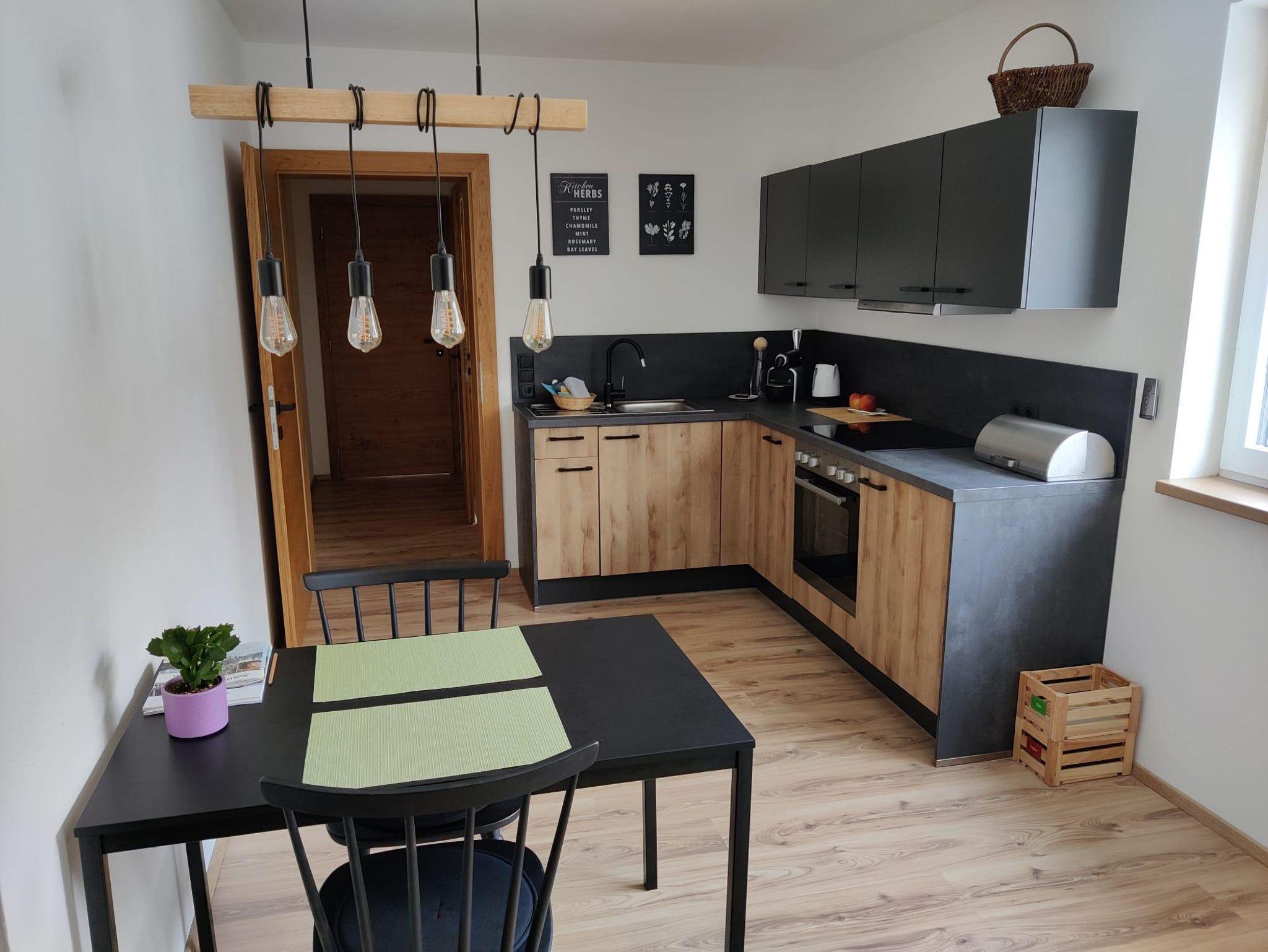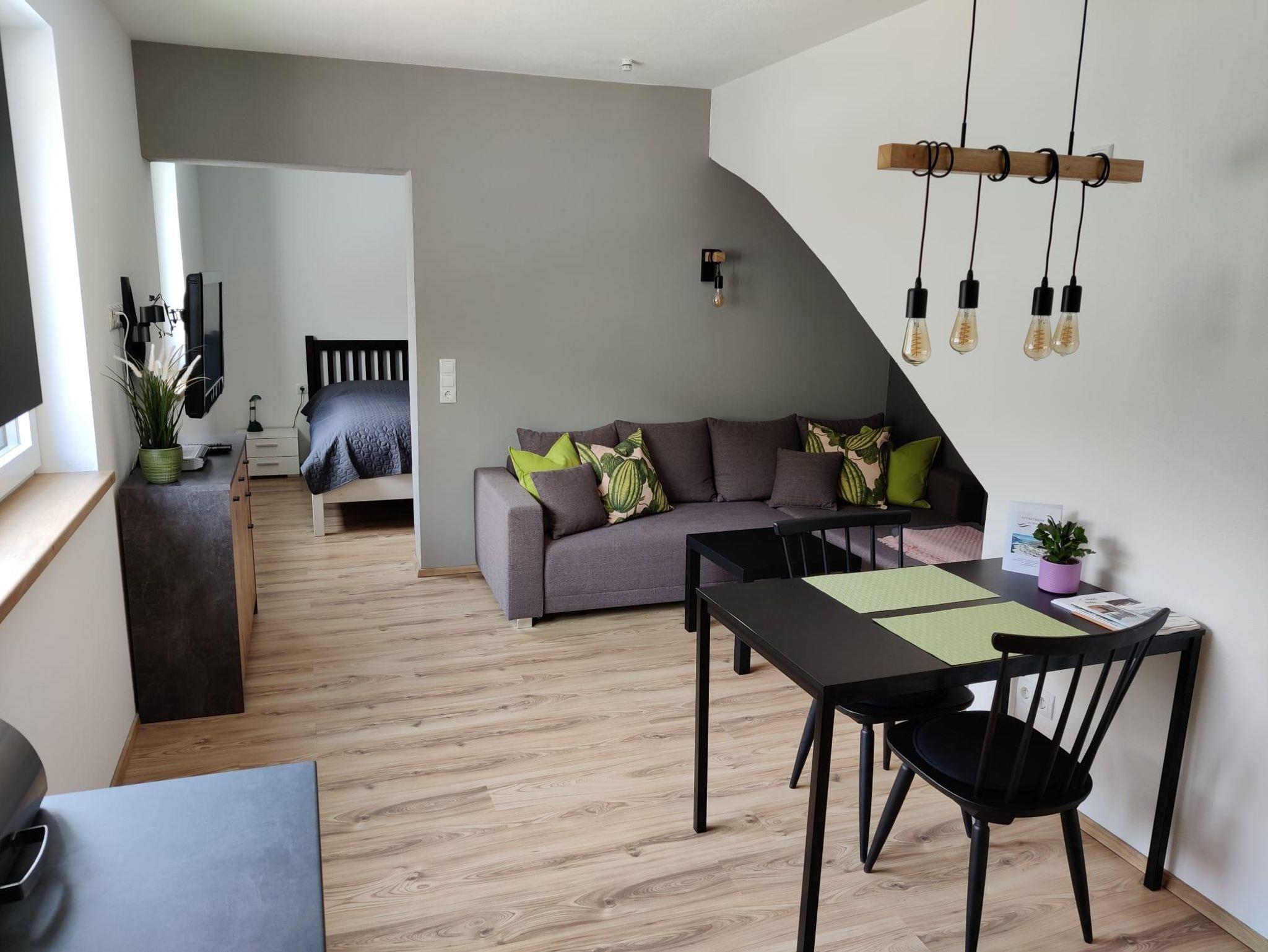 Das Apartment verfügt über einen eigenen Eingangsbereich, eine Wohnküche, ein Schlafzimmer mit Doppelbett sowie ein Bad mit Dusche und WC. Im Wohnzimmer befinden sich eine vollständige ausgestattete Küche sowie der Wohn- und Essbereich. Hier kann gegebenenfalls auch eine weitere Schlafgelegenheit vorbereitet werden.