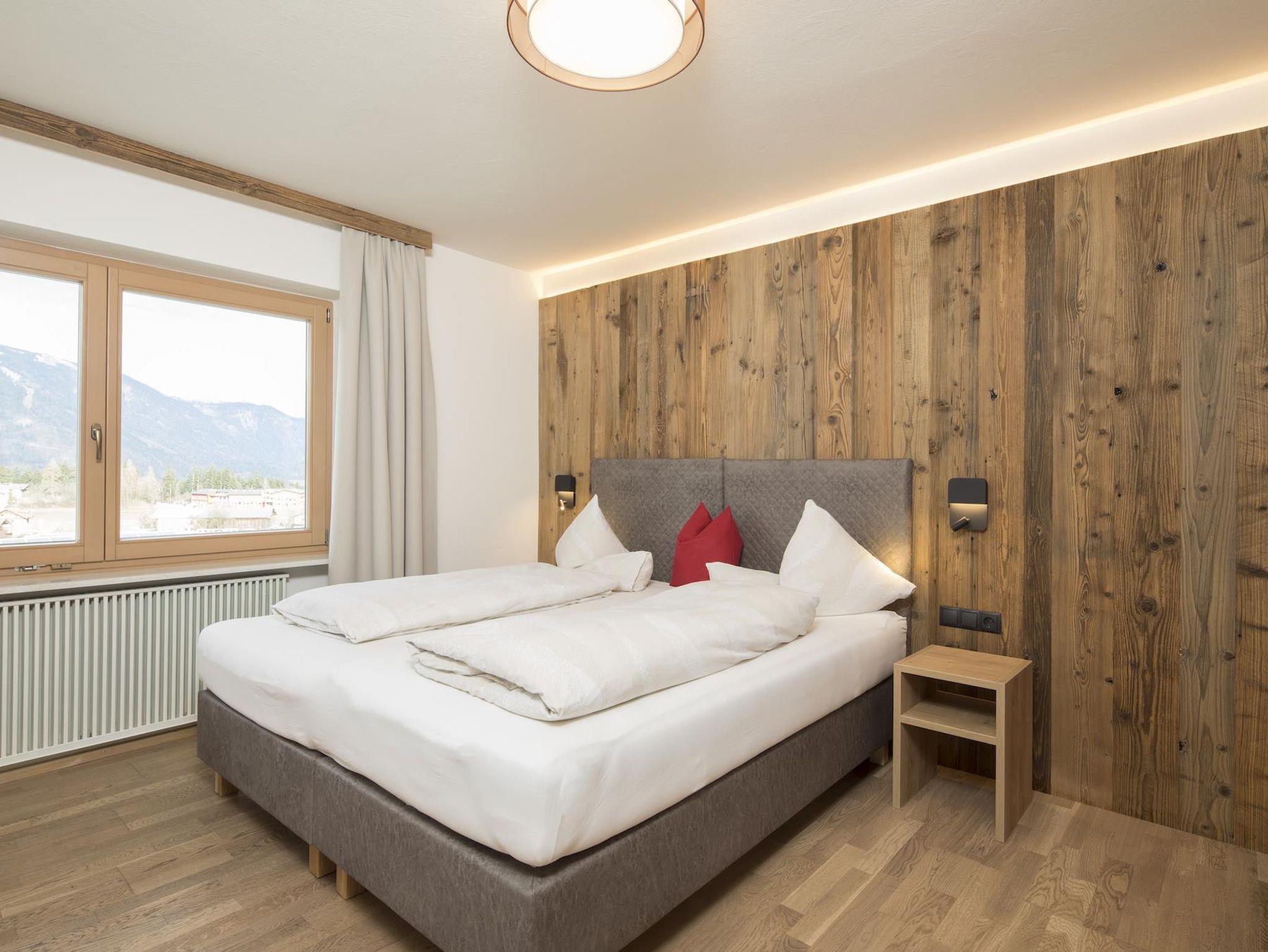Die Familiensuite Alpenchalet ist mit 65 m2 Wohnfläche großzügig gestaltet und überzeugt mit einem besonders gemütlichen Ambiente sowie einer hochwertigen Ausstattung im alpinen Chalet-Stil. Die Suite verfügt über eine große mit Zirbenholz getäfelte Bauernstube mit Kachelofen und Esstisch sowie zwei Schlafzimmer für bis zu fünf Personen (1 Schlafzimmer mit einem Boxspring-Doppelbett und einem zusätzlichen Einzelbett sowie 1 Schlafzimmer mit einem Boxspring Doppelbett). Bei unseren Gästen besonders beliebt sind die große südseitige Terrasse und die zwei Balkone. In der Familiensuite Alpenchalet kann nach Rückfrage maximal ein Zustellbett für eine weitere Person zum Preis von EUR 15,00 pro Übernachtung und ein Babybett (kostenfrei für Kinder bis 2 Jahre) platziert werden.