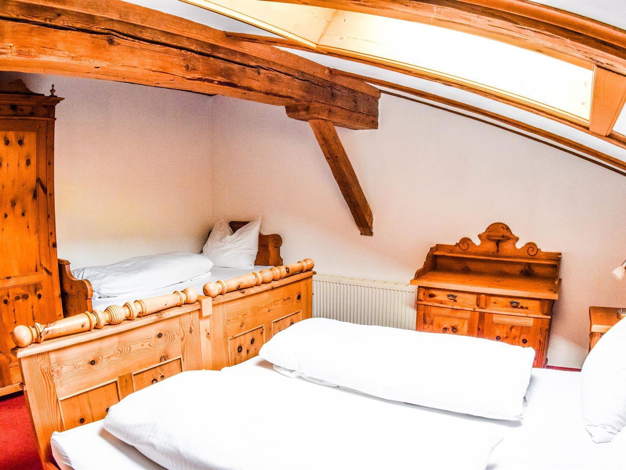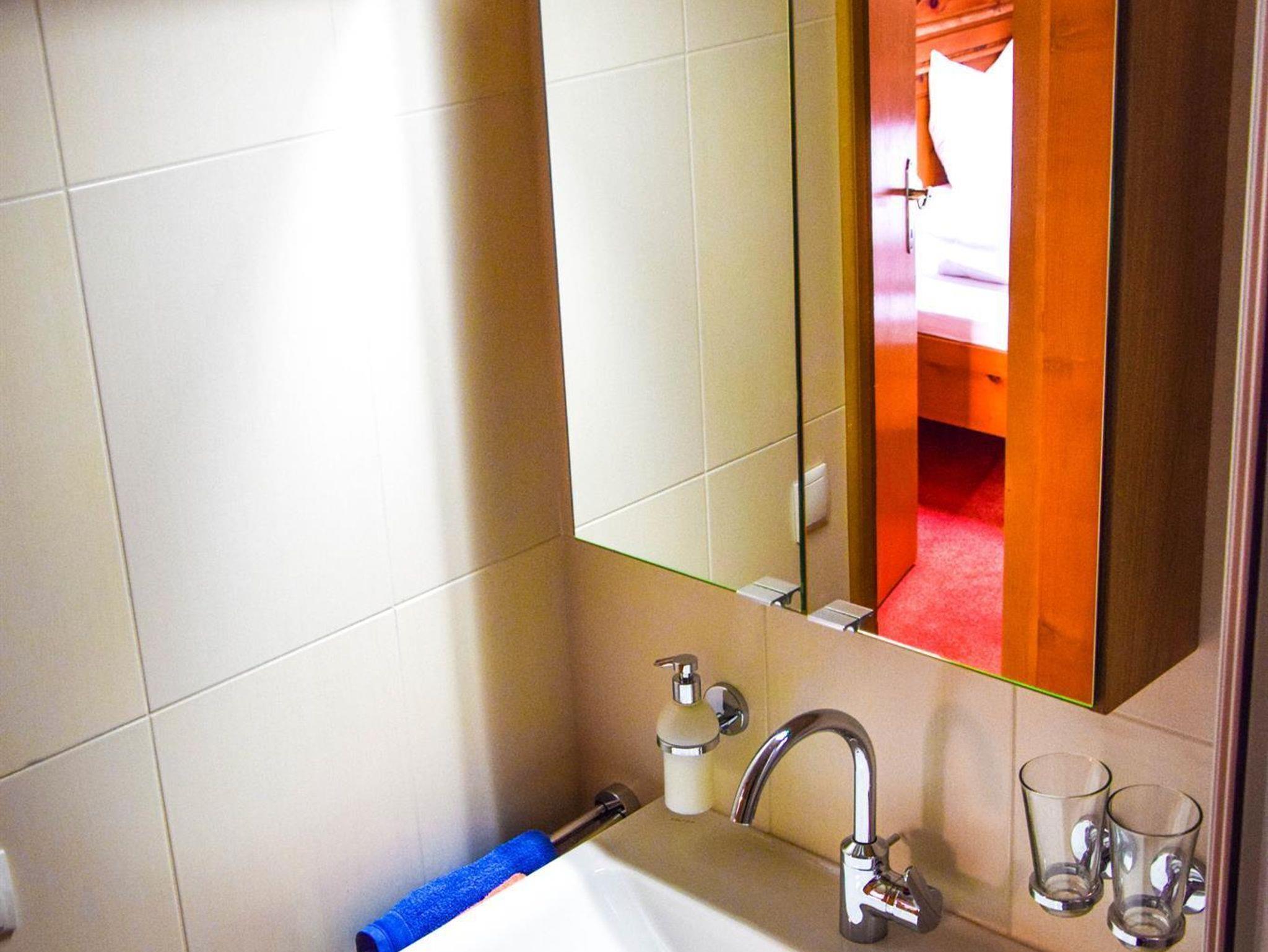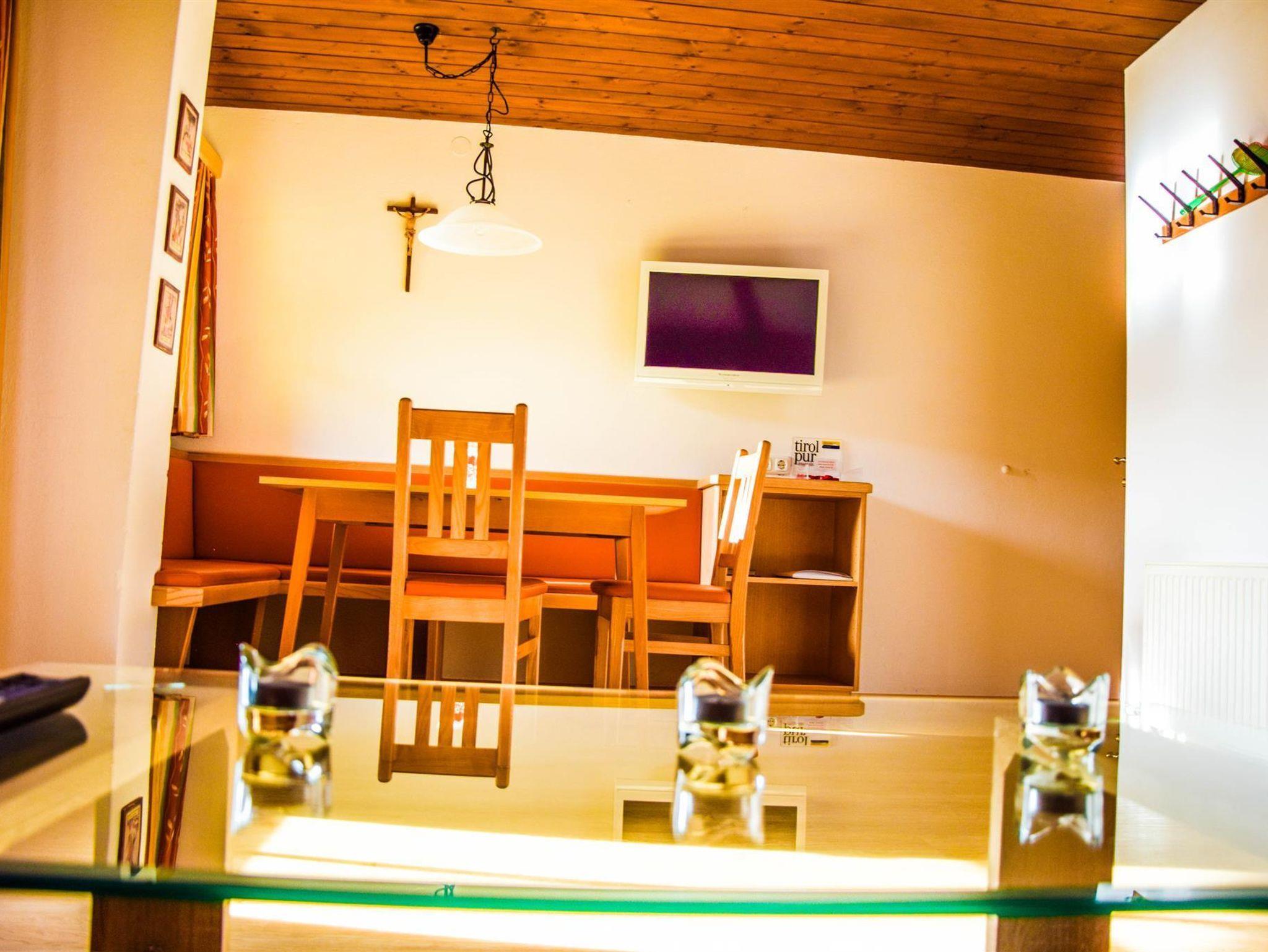 Ferienwohnung 46 m², 2-5 Personen mit Balkon, einem Schlafzimmer aus Zirbenholz mit Doppelbett und Einzelbett, 1 Wohnschlafraum ausgestattet mit Ausziehcouch für 2 Personen und Küche mit Elektroherd, Mikrowelle, Geschirrspüler, Ess- und Kochgeschirr, Badezimmer mit Dusche und WC.