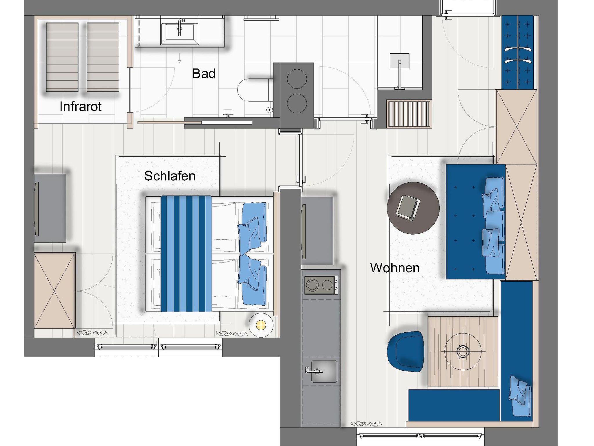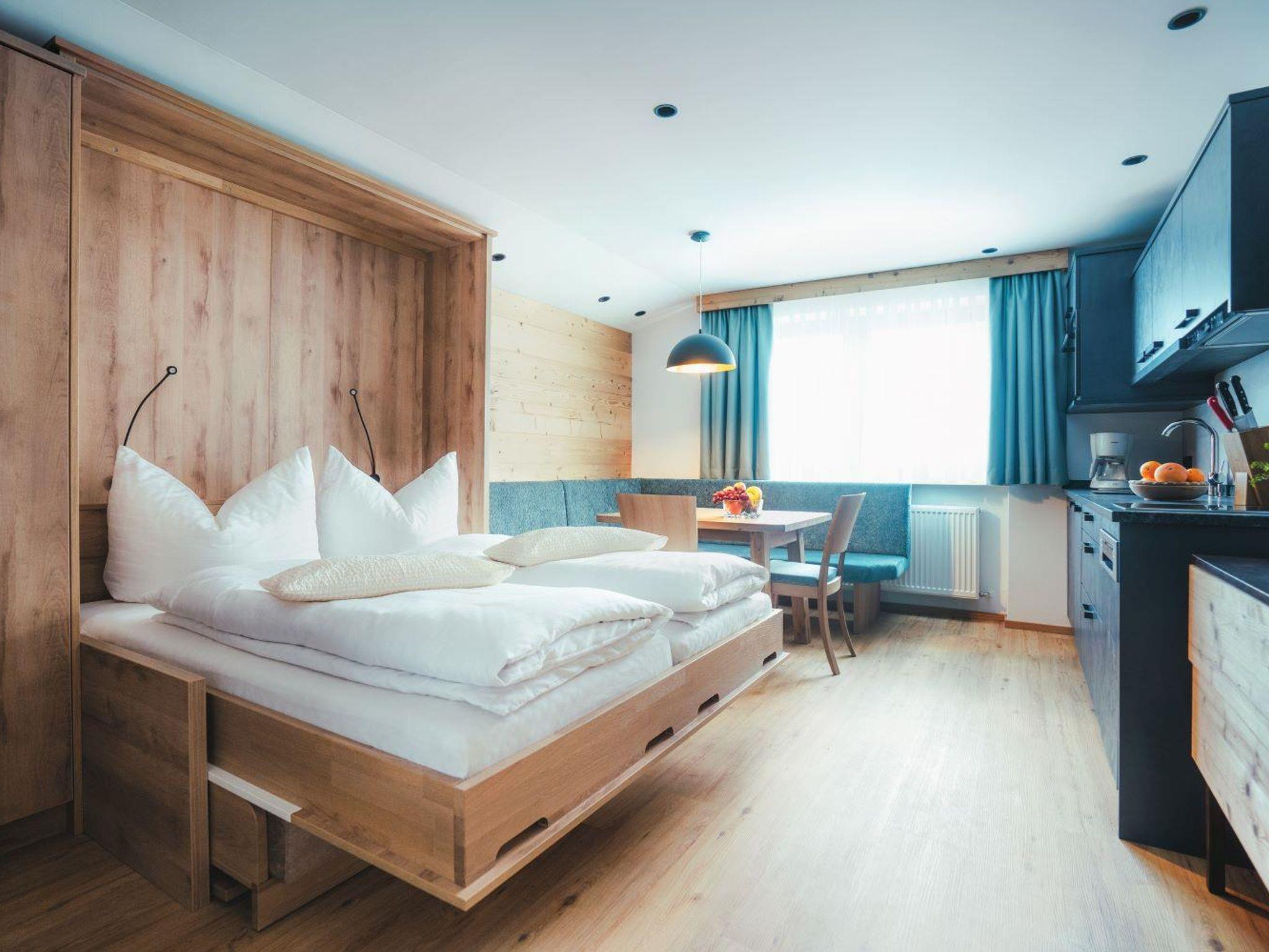 Die südseitige, komplett renovierte Ferienwohnung Hauserjoch (Umbau Herbst 2021) im das Luggi bietet Platz für bis zu vier Personen. Sie befindet sich im zweiten Stock (mit Aufzug) und ist ca. 40m² groß. Die Wohnung ist ausgestattet mit einem Wohn-Schlafraum, Küche, einem Doppelzimmer, Badezimmer mit Dusche/WC und Infrarotkabine. Weiters hat sie Kabel-TV und einen Balkon.