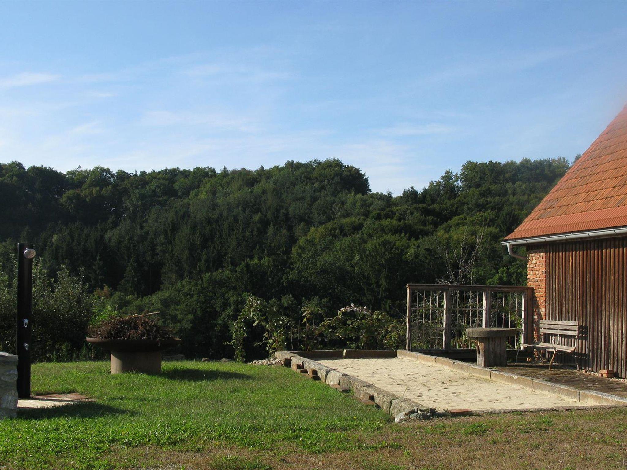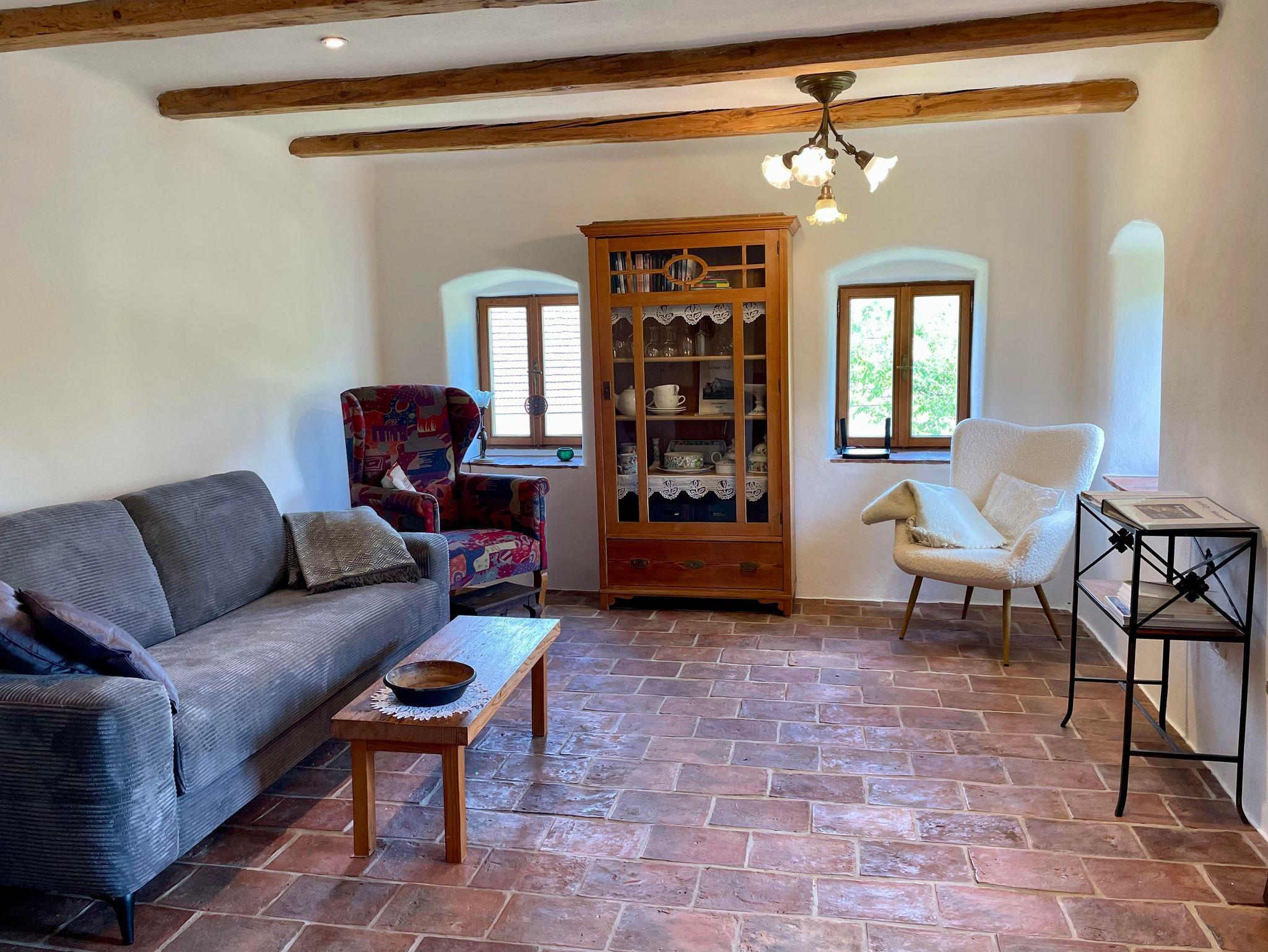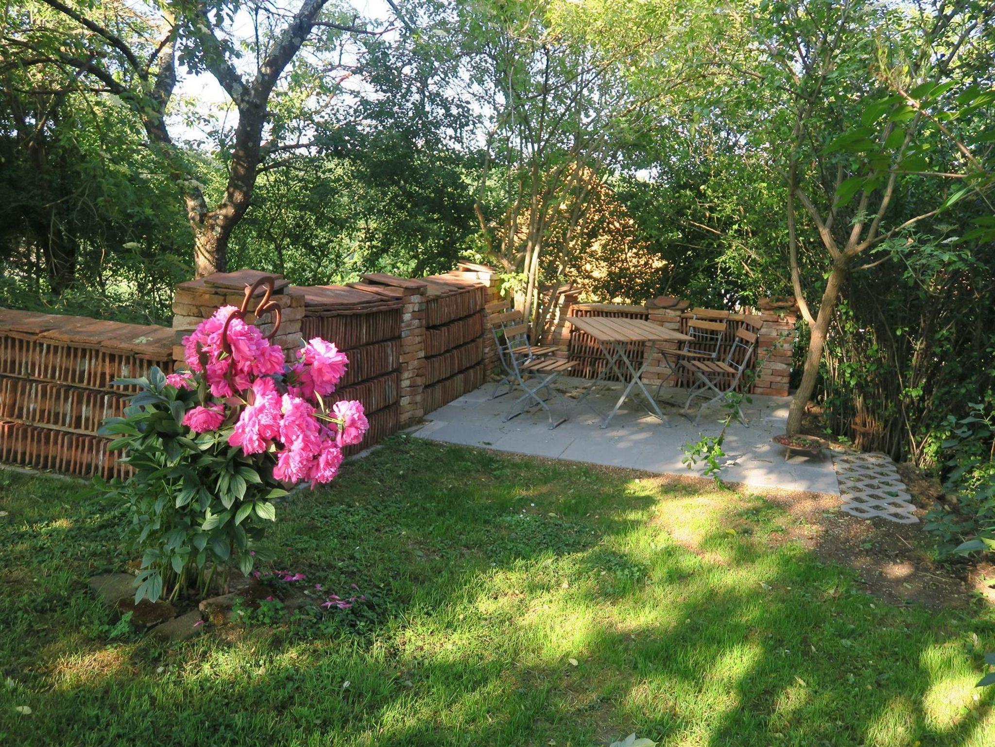 Im Haus finden Sie eine gut ausgestattete Küche, helles Bad, 2 WCs, Wohnzimmer und 2 Schlafräume unter dem Dach. Nichtraucherhaus. Ein schattiger, von Bäumen umgebener Garten mit Holzliege und eigenem Sitzplatz gehört Ihnen alleine. Eine alte Steinbank an der Hausmauer, Schwimmteich mit Holzsteg, Bocciabahn mit Sitzplatz und ein Lagerfeuerplatz laden zum Relaxen ein.