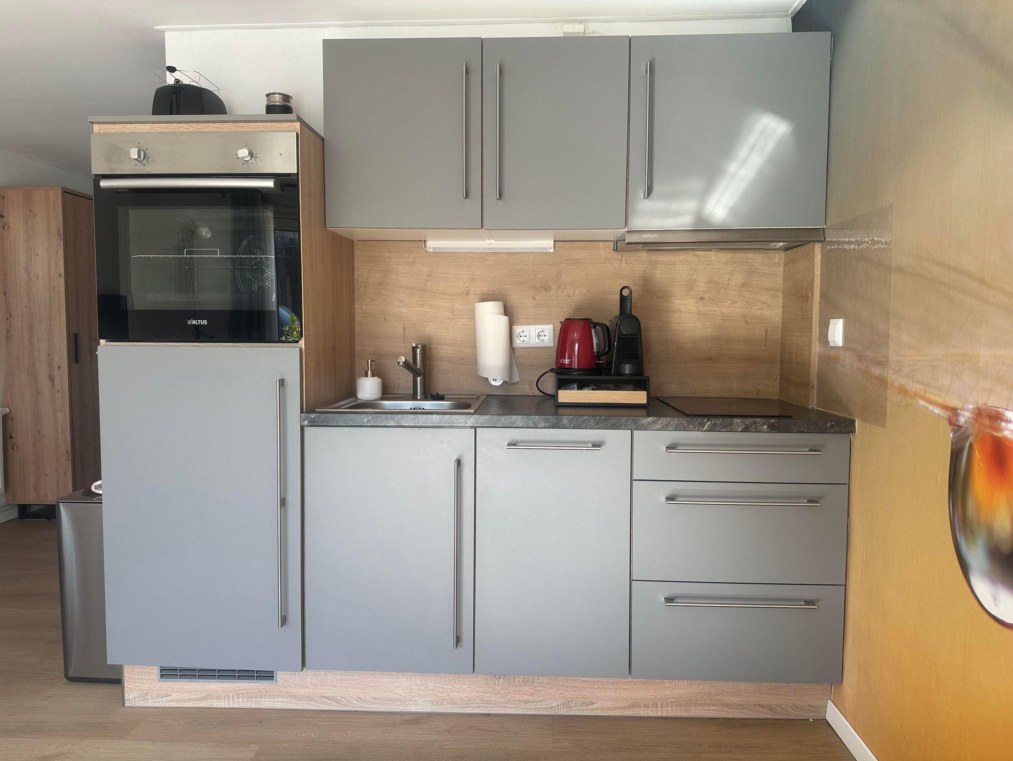 Studio 1 befindet sich im Erdgeschoss und kann bis zu 2 Personen beherbergen. Das Studio ist 33 m2 groß und verfügt über ein separates WC und ein Duschbad. Wie in allen Wohnungen ist die Küche komplett mit Induktionskochfeld, Geschirrspüler, Backofen, Kühlschrank, Horn, Nespresso-Maschine, Milchaufschäumer und Wasserkocher. Der Schlafbereich verfügt über ein Doppelboxspringbett und einen Kleiderschrank. An der Vorderseite dieses Studios befindet sich ein privater Sitzbereich, in dem Sie sich entspannen können.