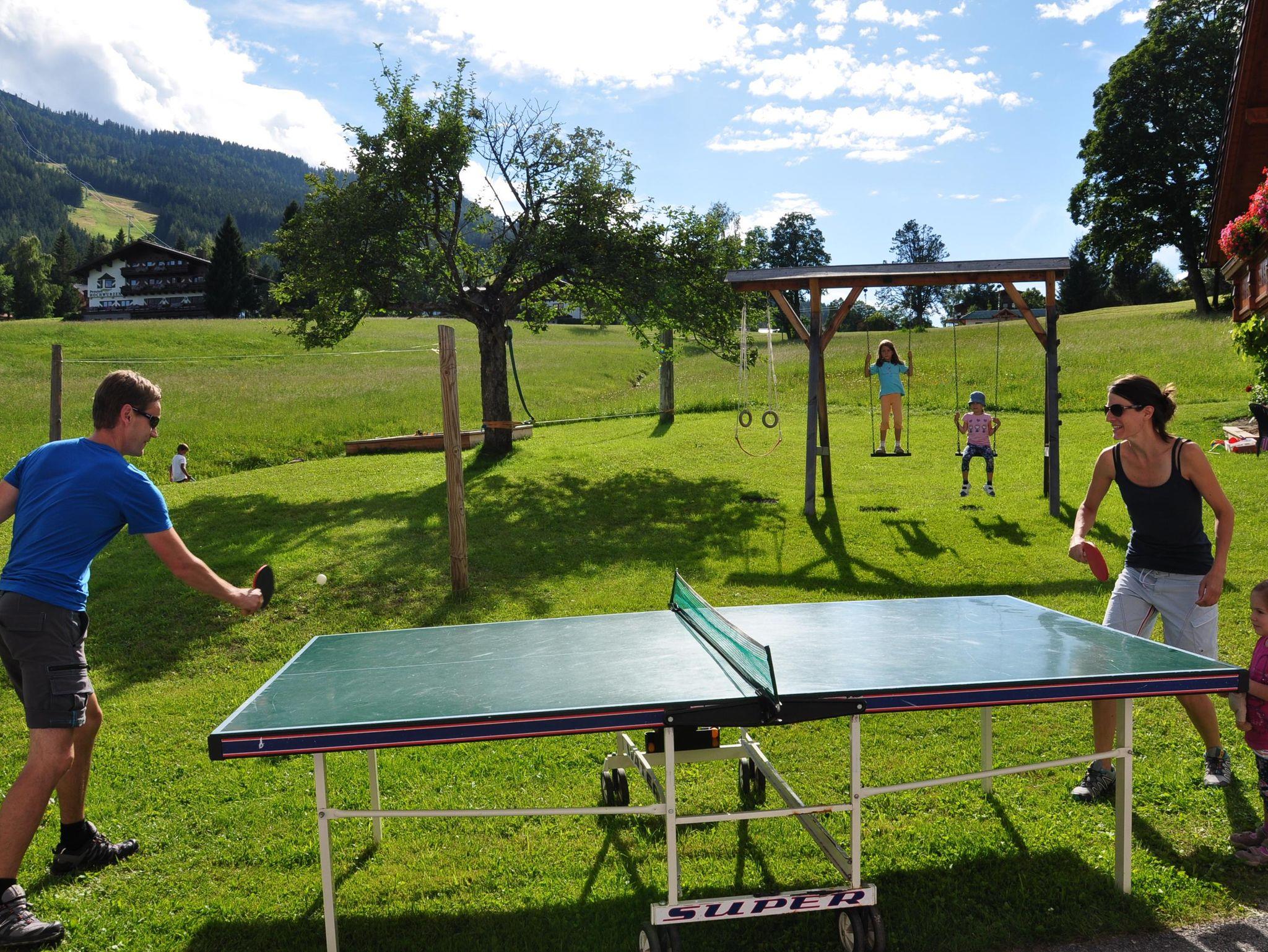 Sandkisten, Schaukeln, höhenverstellbare Reckstange, Tischtennis, ein Riesentrampolin mit Airflow- und Twinspringtechnologie, ein kleines Naturbächlein und unser Kinderfuhrpark (Roller, Laufrad, Trettraktor, Fahrräder, Bobby-Cars) warten auf kleine Entdecker.