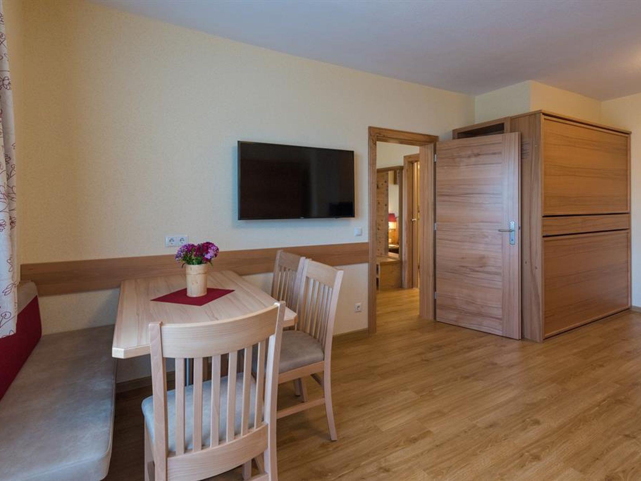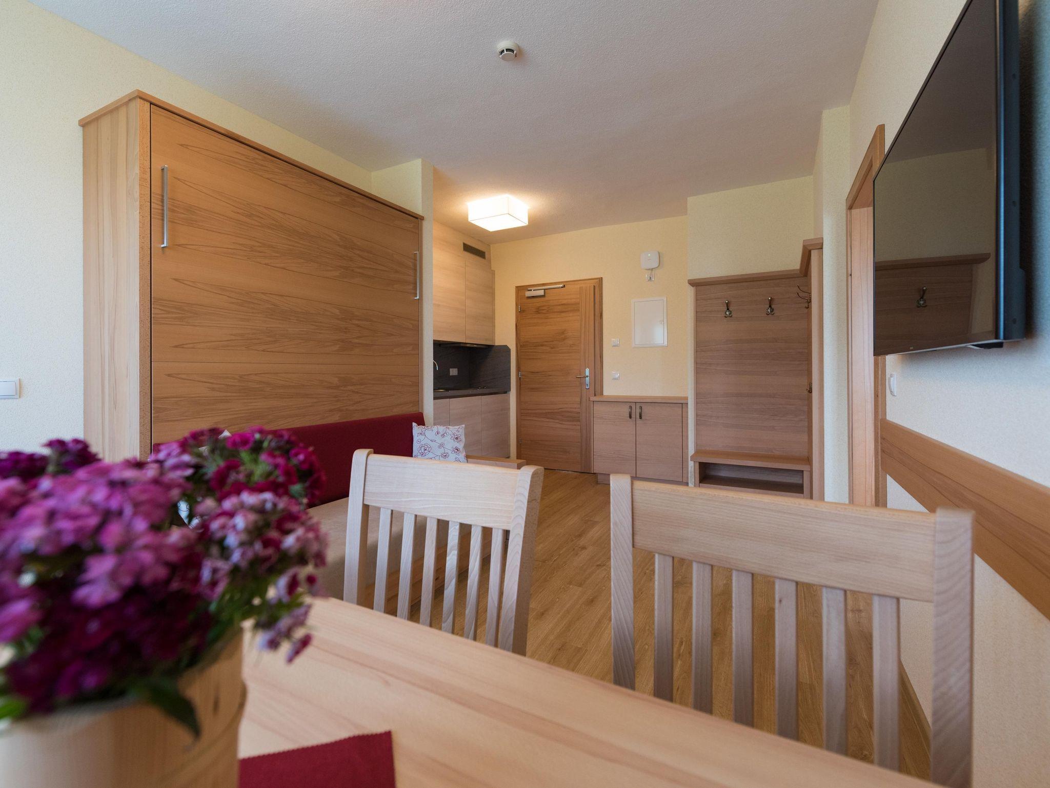Im Frühjahr 2016 komplett saniert!!! Schlafzimmer: * Handgefertigte Zirbenholzmöbeln * Doppelbett mit hochwertigen QUL-zertifizierten Relax-Matratzen * Kabel-TV * Balkon mit Talblick und Morgensonne Badezimmer: * Waschtisch * Dusche * WC * Handtuchtrockner * Leistungsstarker Fön Wohnraum: * Gemütliche Sitzecke mit Tisch * Kabel-TV * Couch (verschwindet bei Bedarf in der Wand und ein Doppelbett wird hervorgezaubert) * Stockbett (verschwindet in der Wand, wenn es nicht benötigt wird) Küche: * 2 Herdplatten * Mikrowelle * Kühlschrank * Kaffeevollautomat * Geschirrspüler * Wasserkocher * Geschirr und Küchentücher Gesamte Suite: * Fußbodenheizung * gratis WiFi