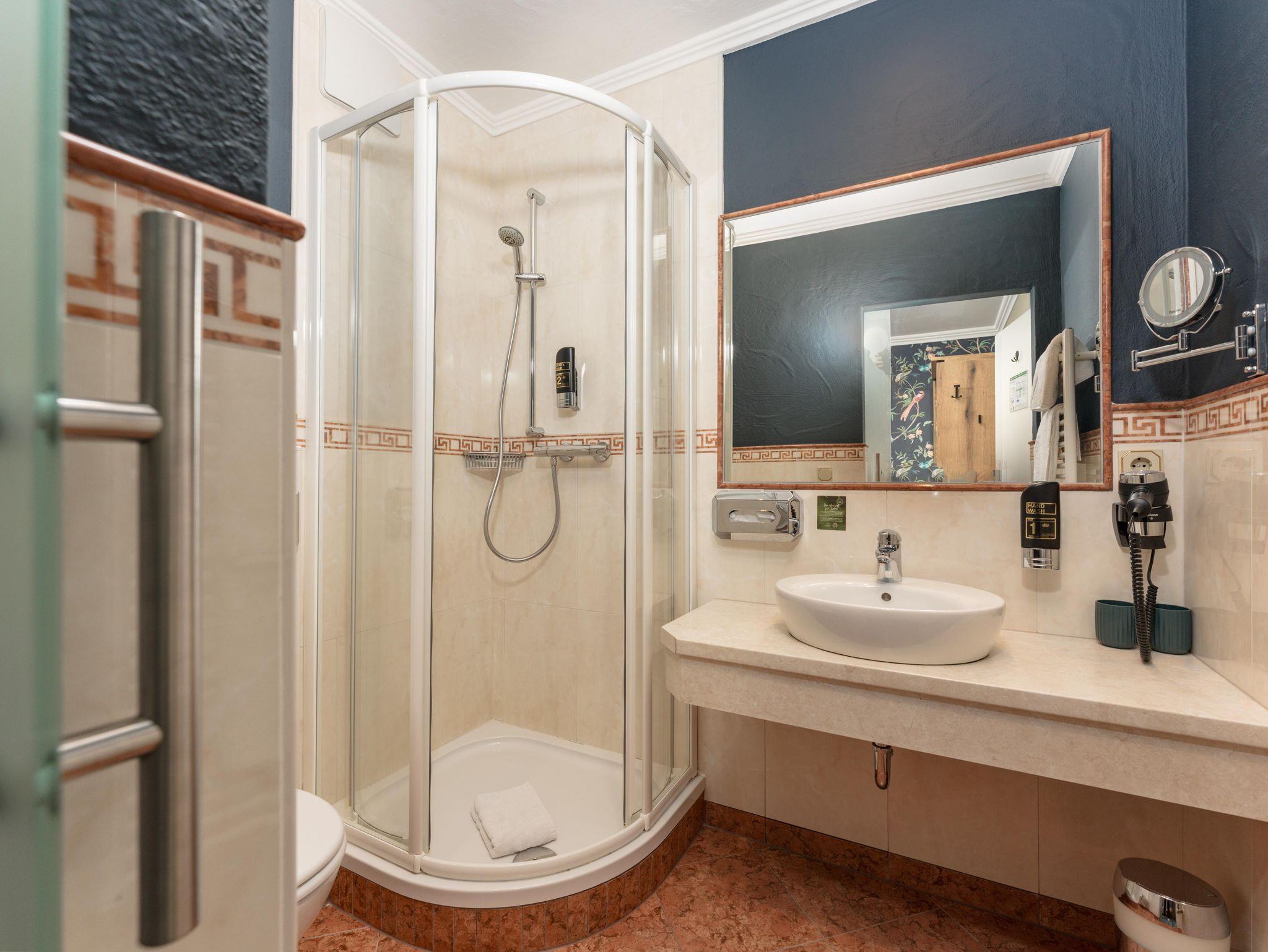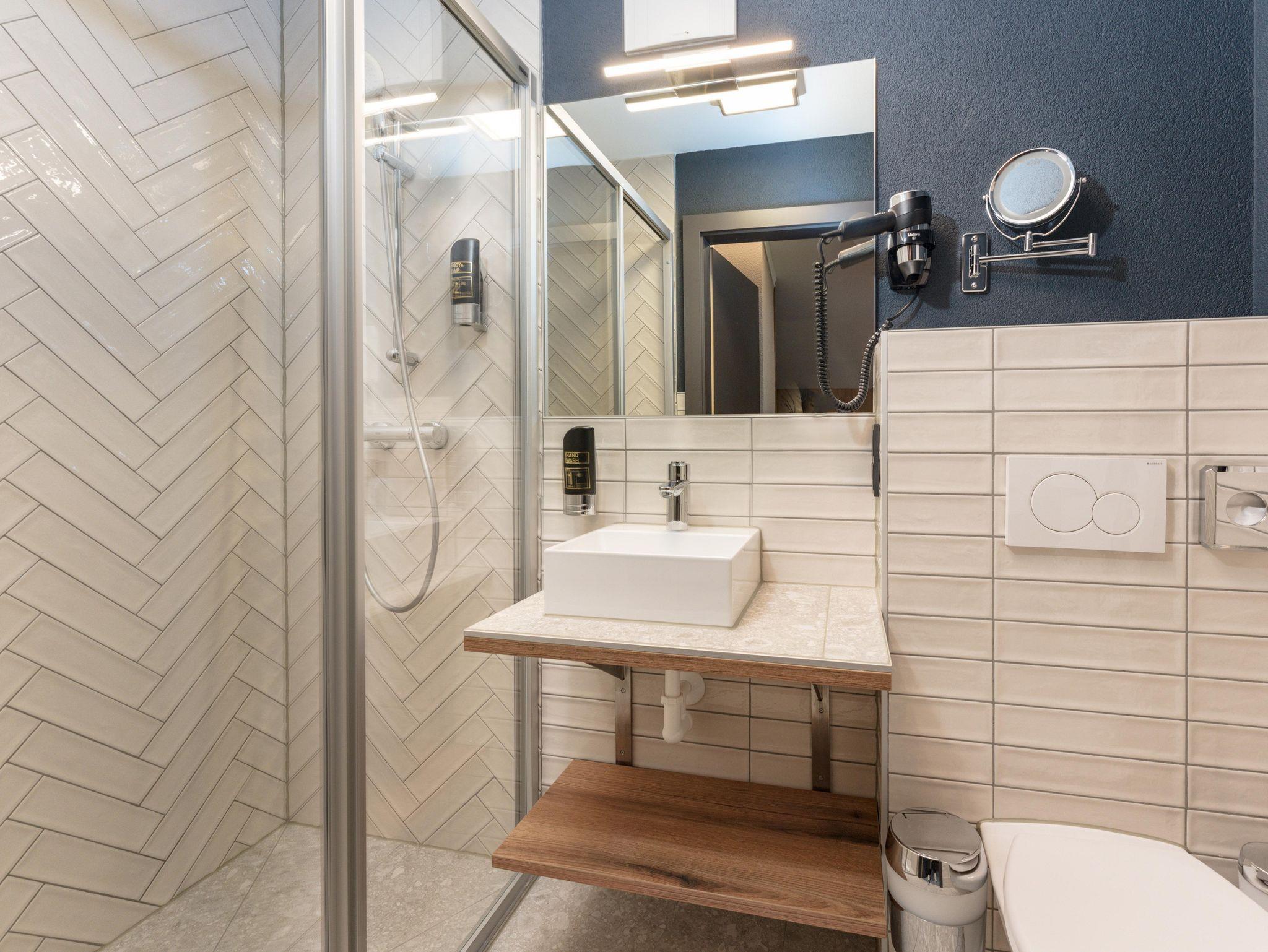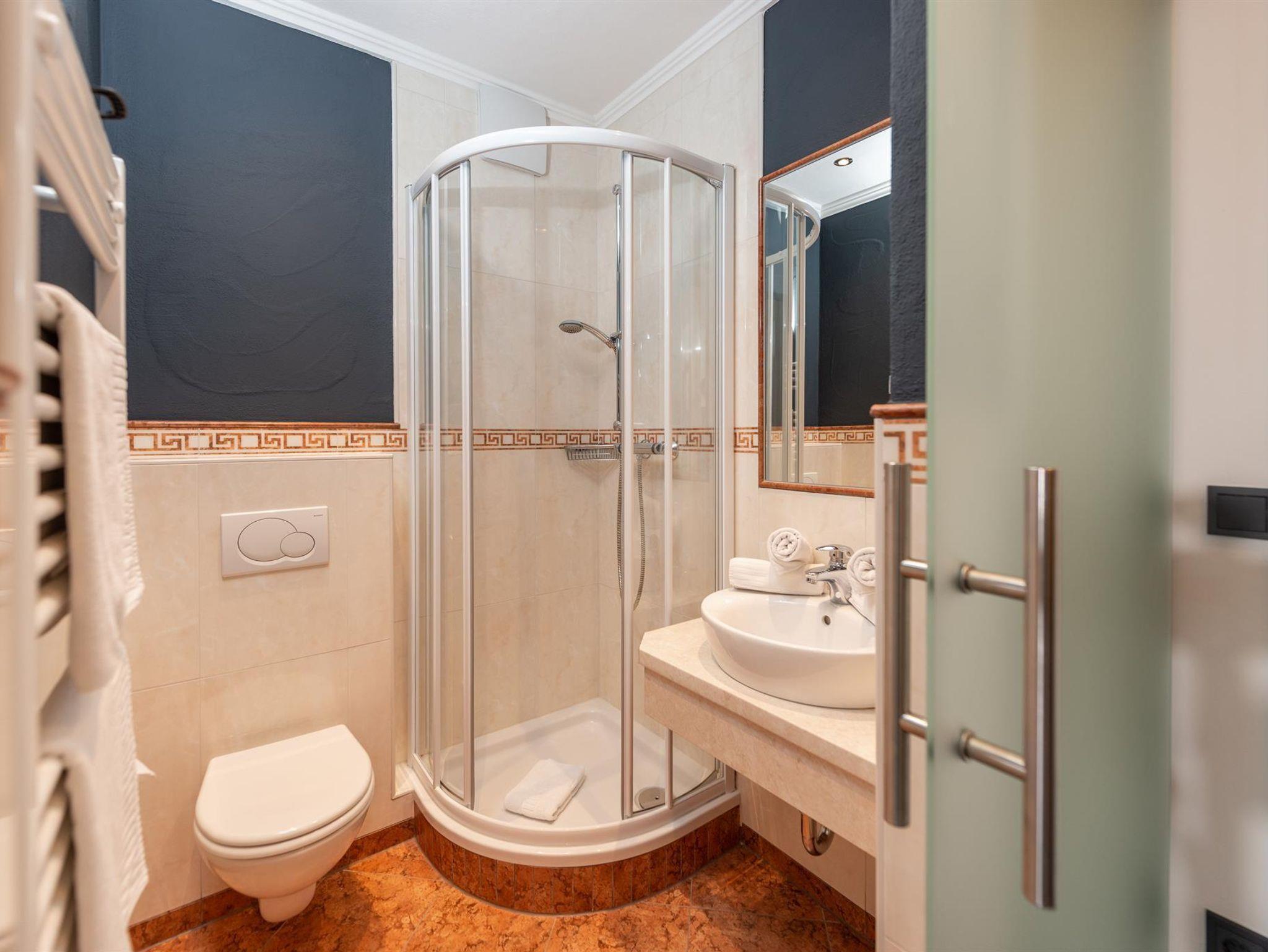 Badezimmer mit Dusche/WC, Haarföhn, Schminkspiegel & Handtuchtrockner