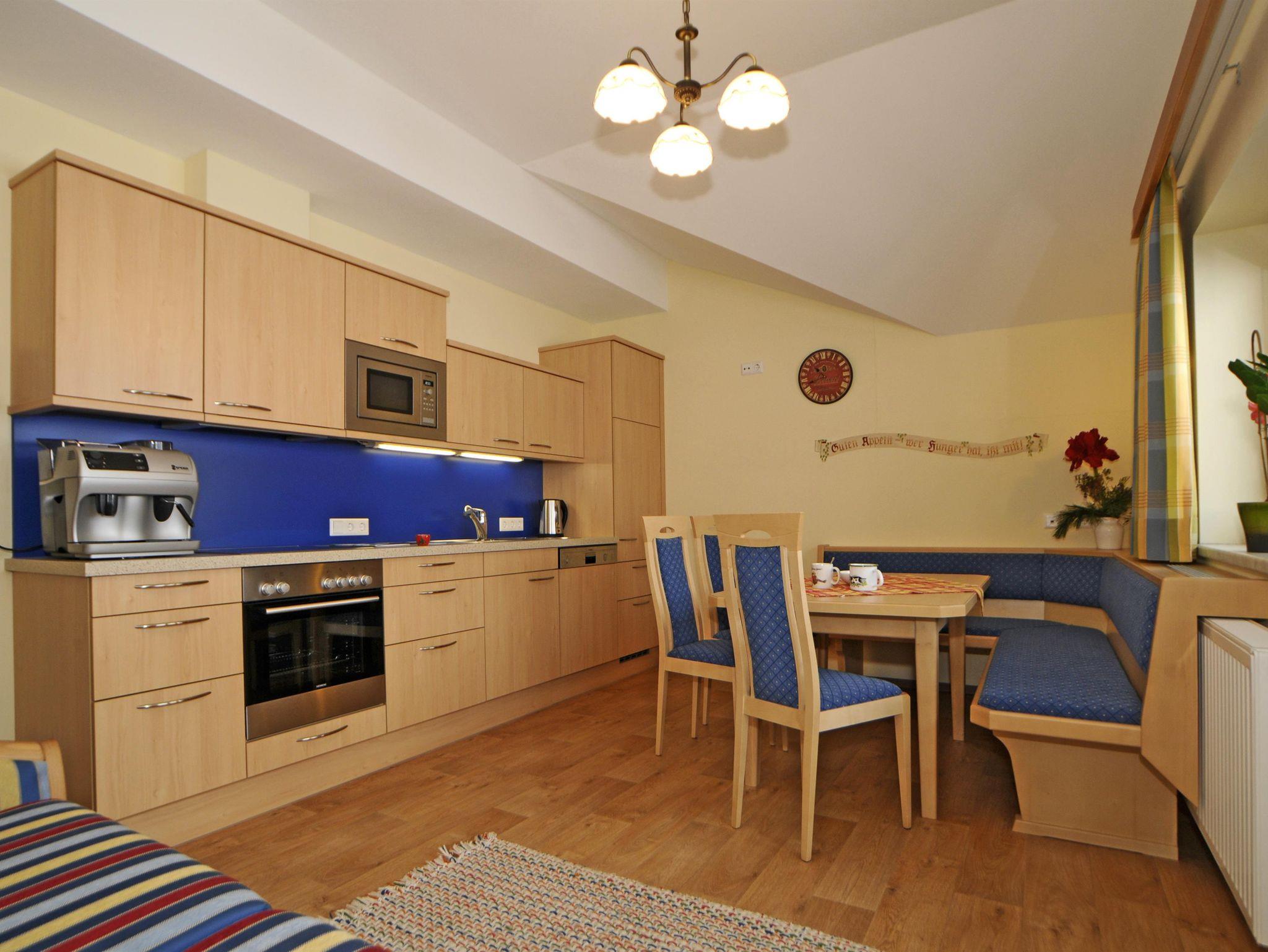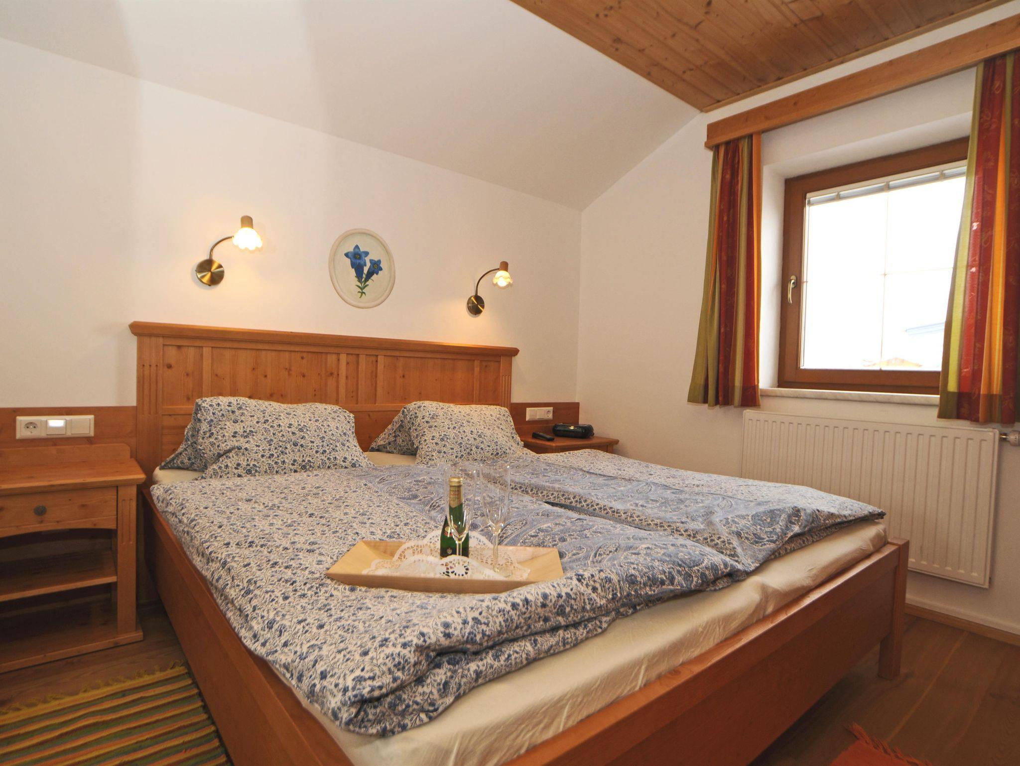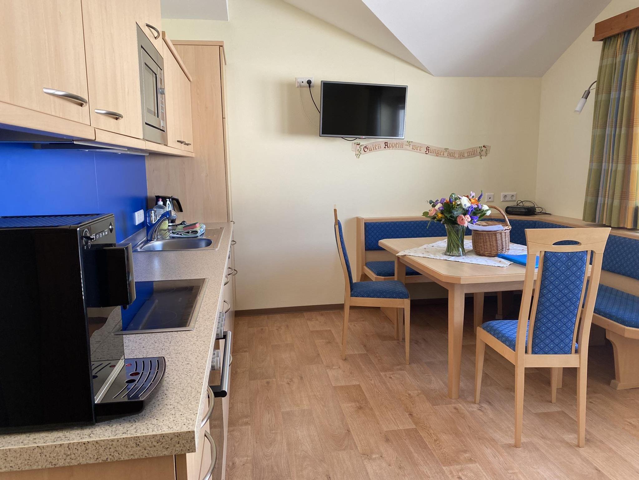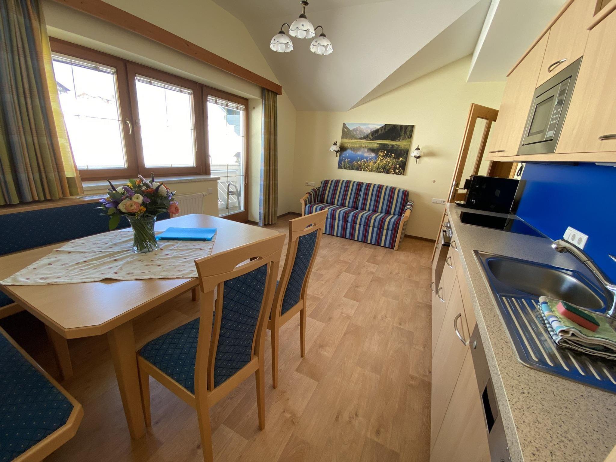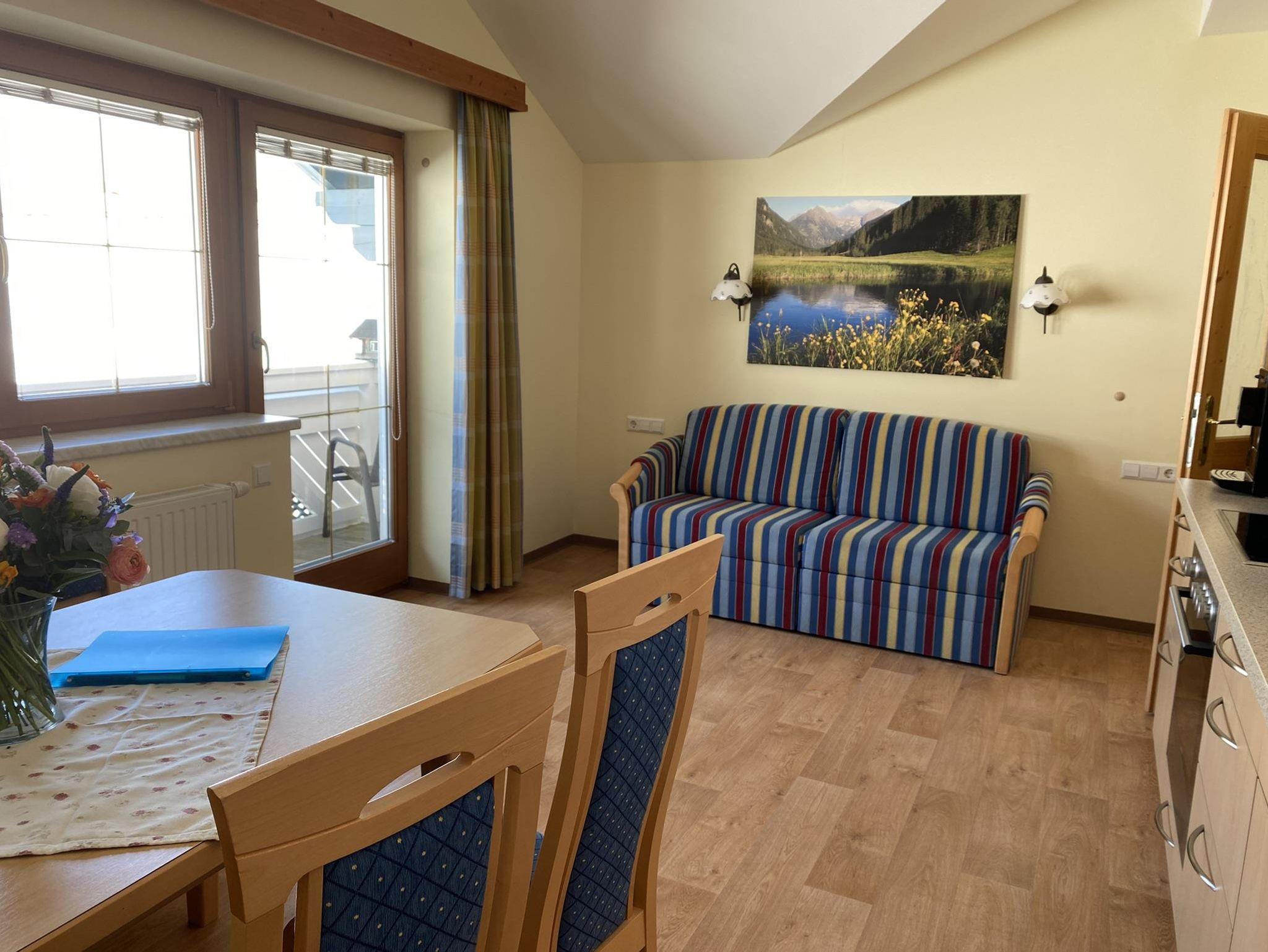 Das Appartement Enzian verfügt über ein Schlafzimmer, WC und Dusche getrennt und eine komplett eingerichtete Wohnküche mit einer Ausziehcouch und einem Balkon in Blickrichtung Westen.