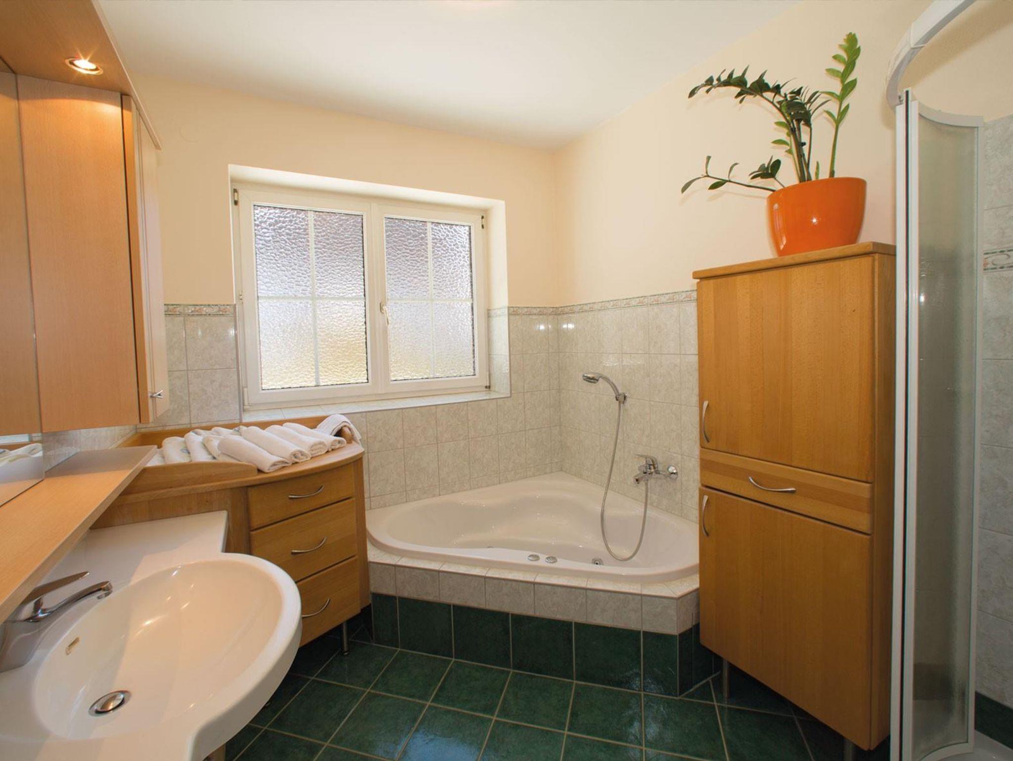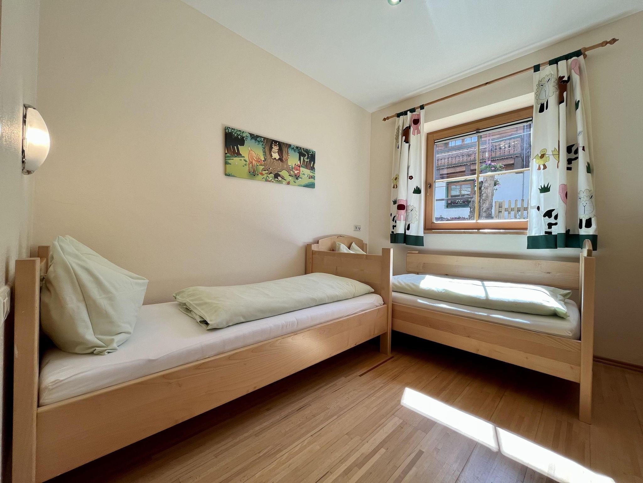 Ein Kinderzimmer und ein Elternschlafzimmer sowie ein Badezimmer mit Dusche, Badewanne und Waschbecken.