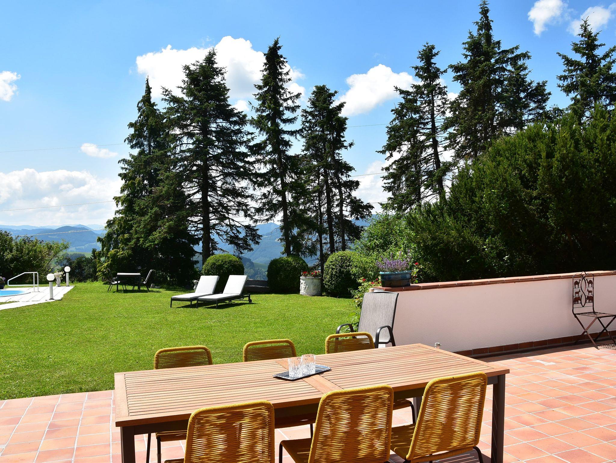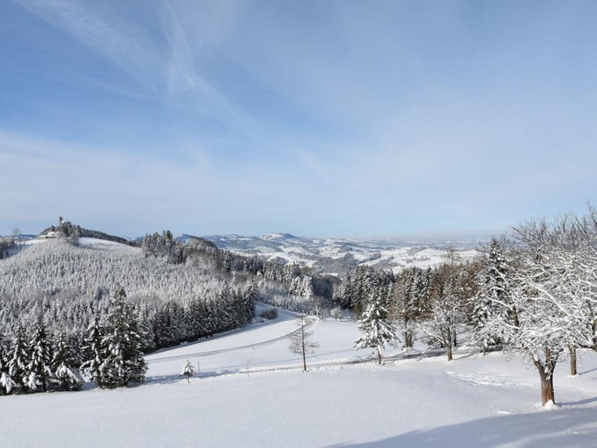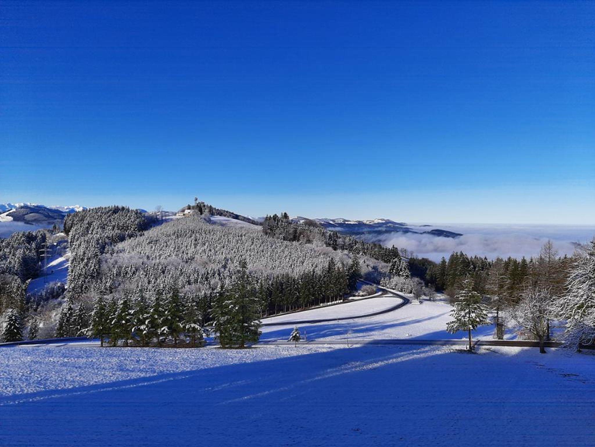Wohin das Auge sieht eröffnen sich malerische Ausblicke - von Südwesten bis Südosten die lange schneebedeckten Gipfel der Alpen, auf der gegenüberliegenden Seite Alpenvorland und Donautal.
