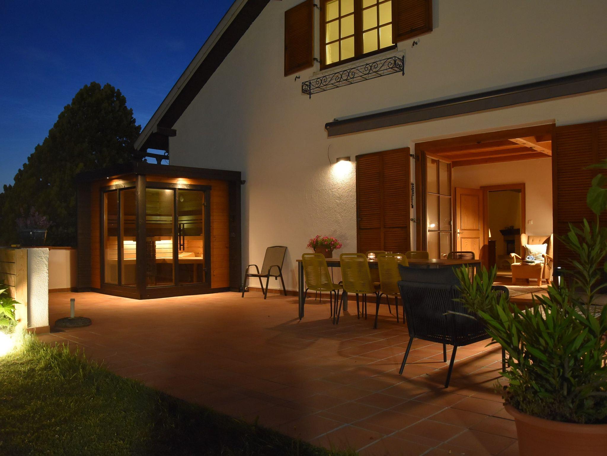 Eindruck hinterlässt auch der Außenbereich des Sandlehen mit seiner großen ebenen Gartenanlage, inklusive Swimming-Pool, Terrasse mit Outdoor-Sauna, vielen Relax- und Ruhebereichen sowie einer großen Spielwiese für Kinder und Erwachsene.