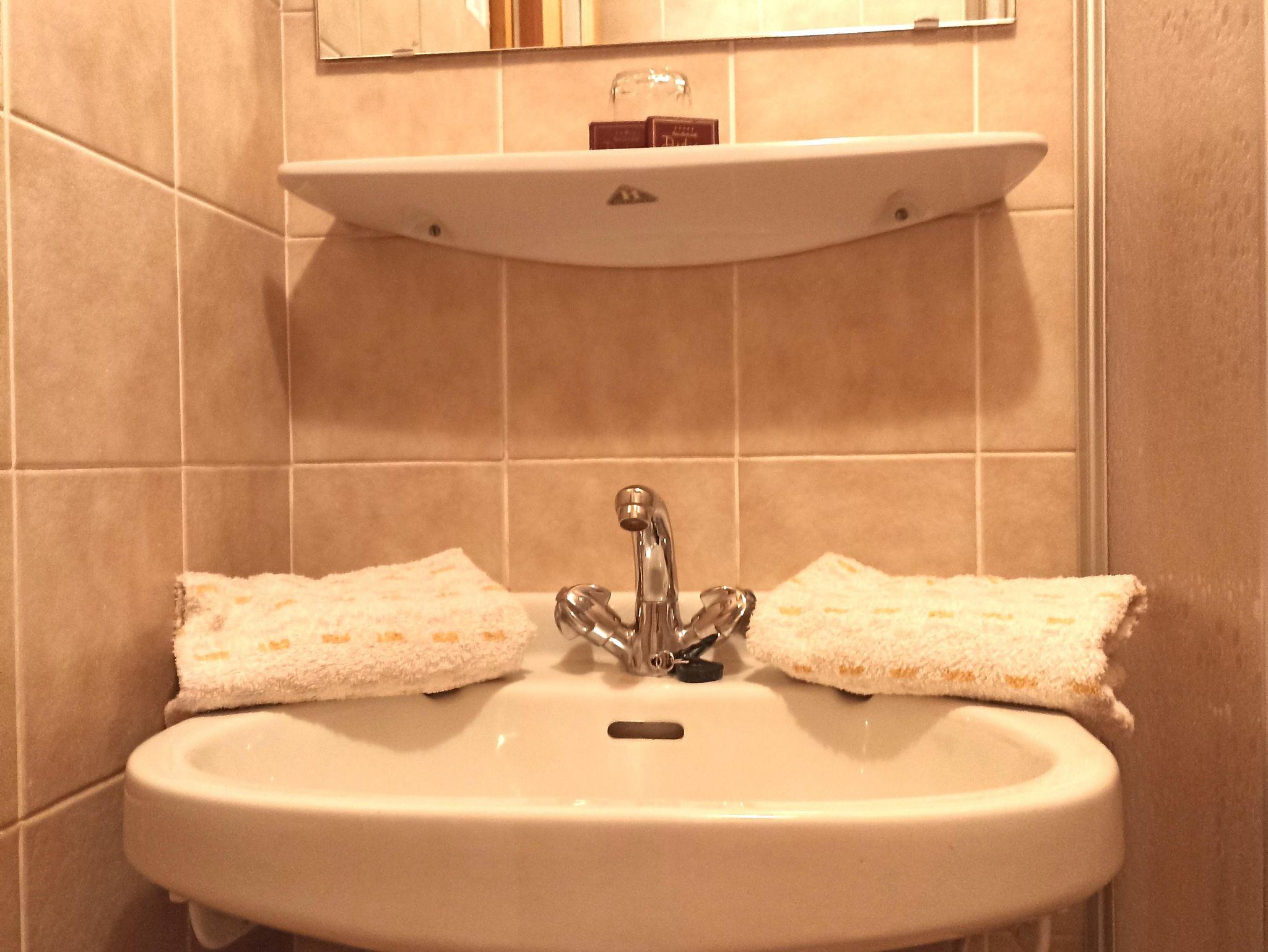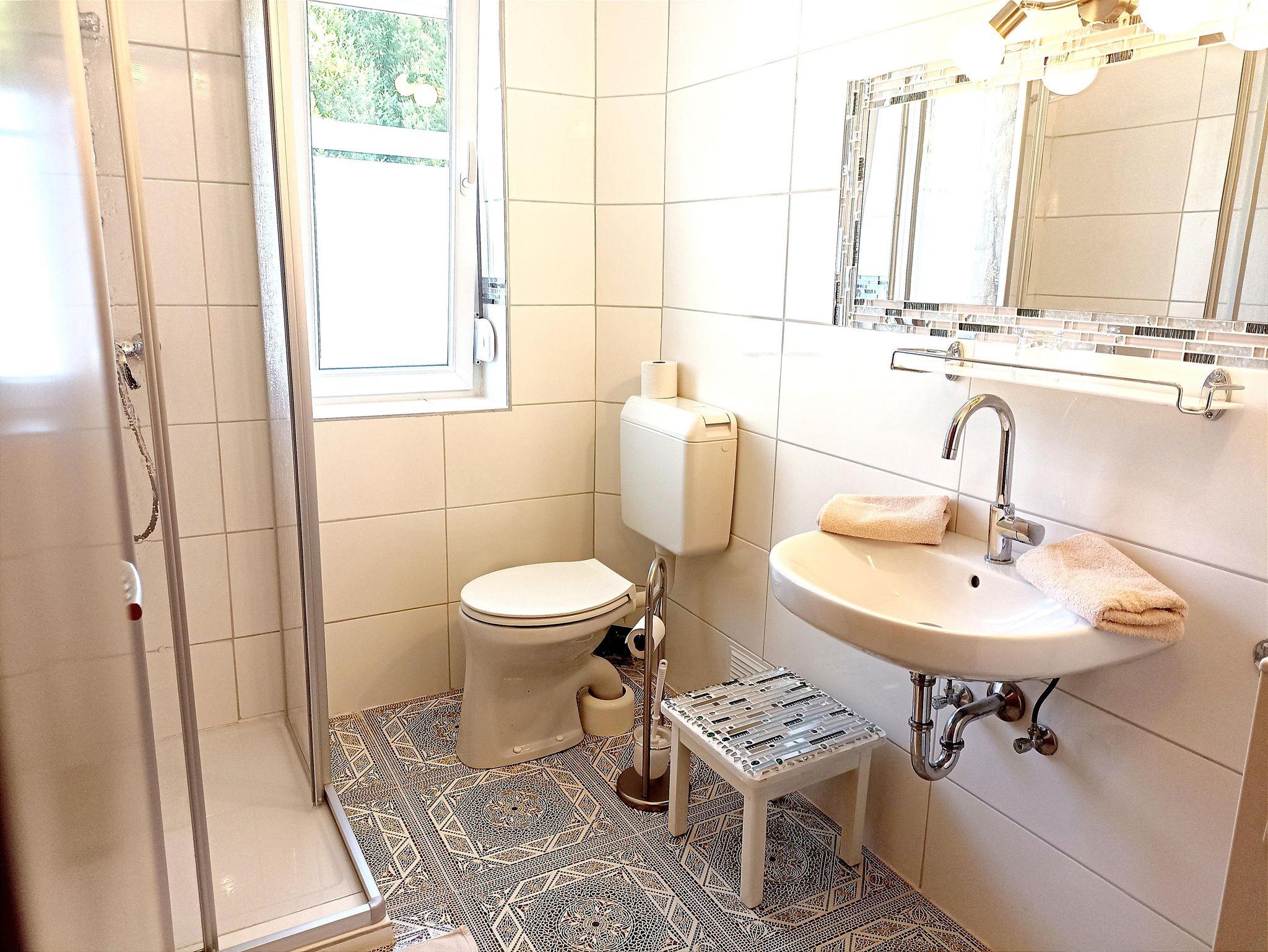 Duschraum mit Dusche, Waschbecken, Ablage, Spiegel, Toilette, Dusch - und Handtücher,