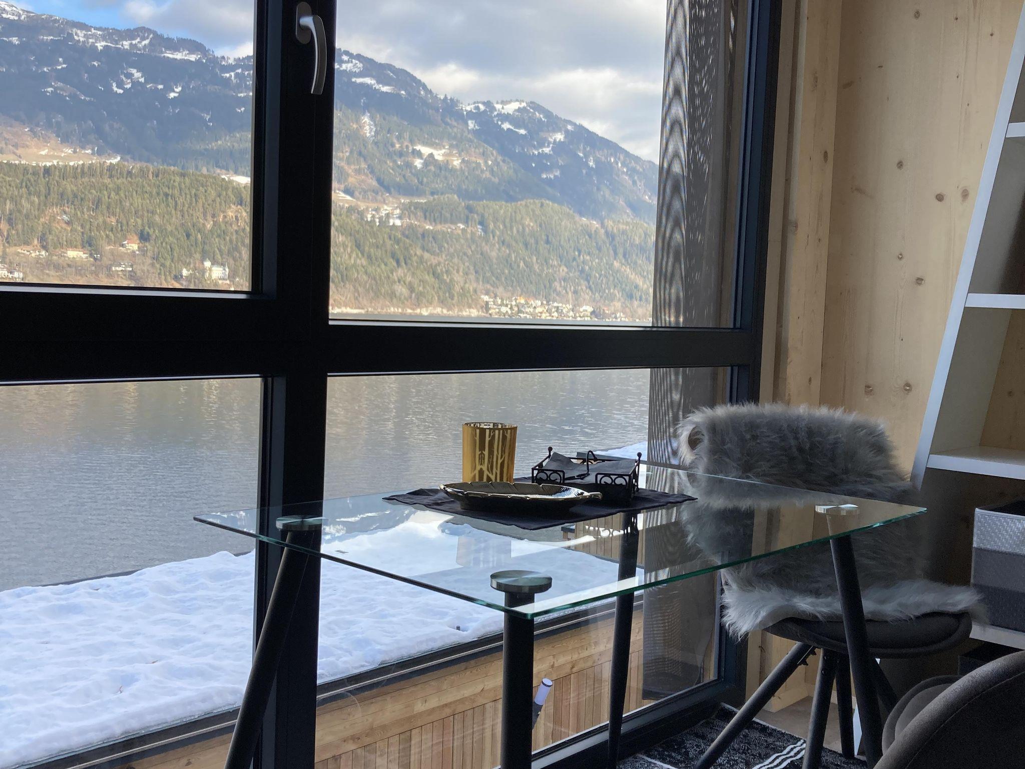 • Riesige Fensterfront mit direktem Blick auf den See und Millstatt mit Esstisch und gemütlichen Sesseln