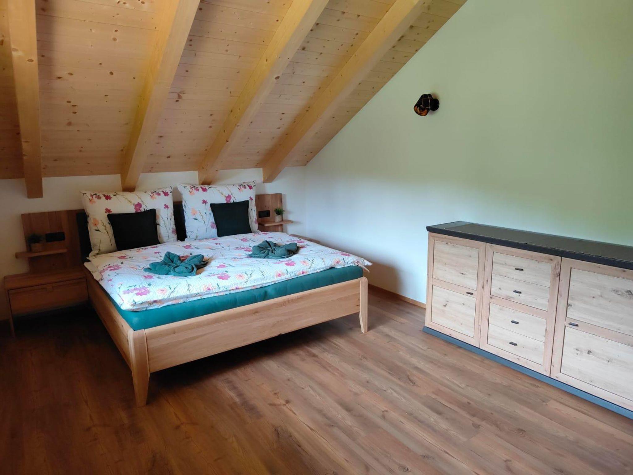 Auf der Ebene 2 läd der offene gemütliche Schlafbereich mit einem Doppelbett und einem weiteren erweiterbaren Bett zum träumen ein.