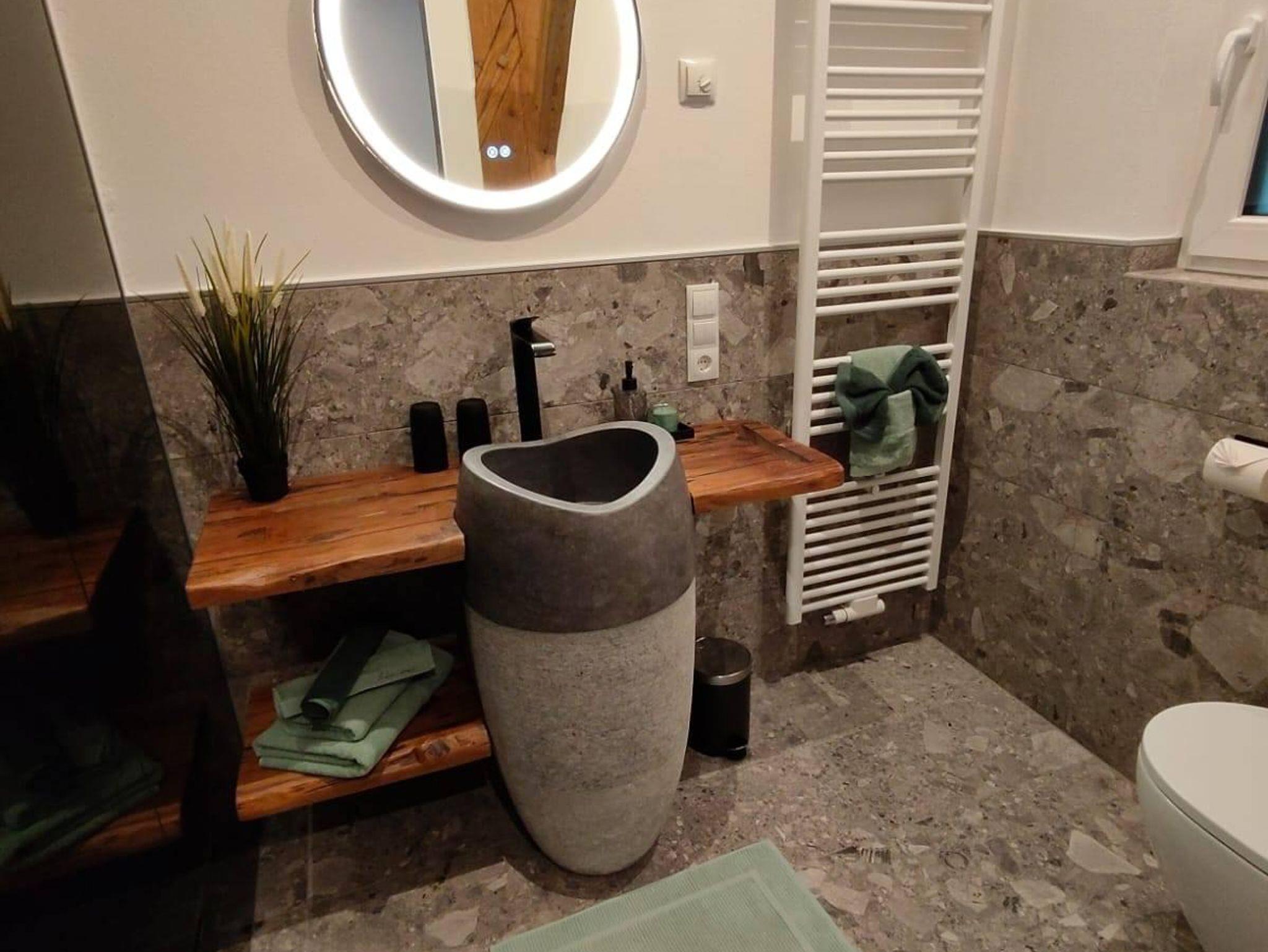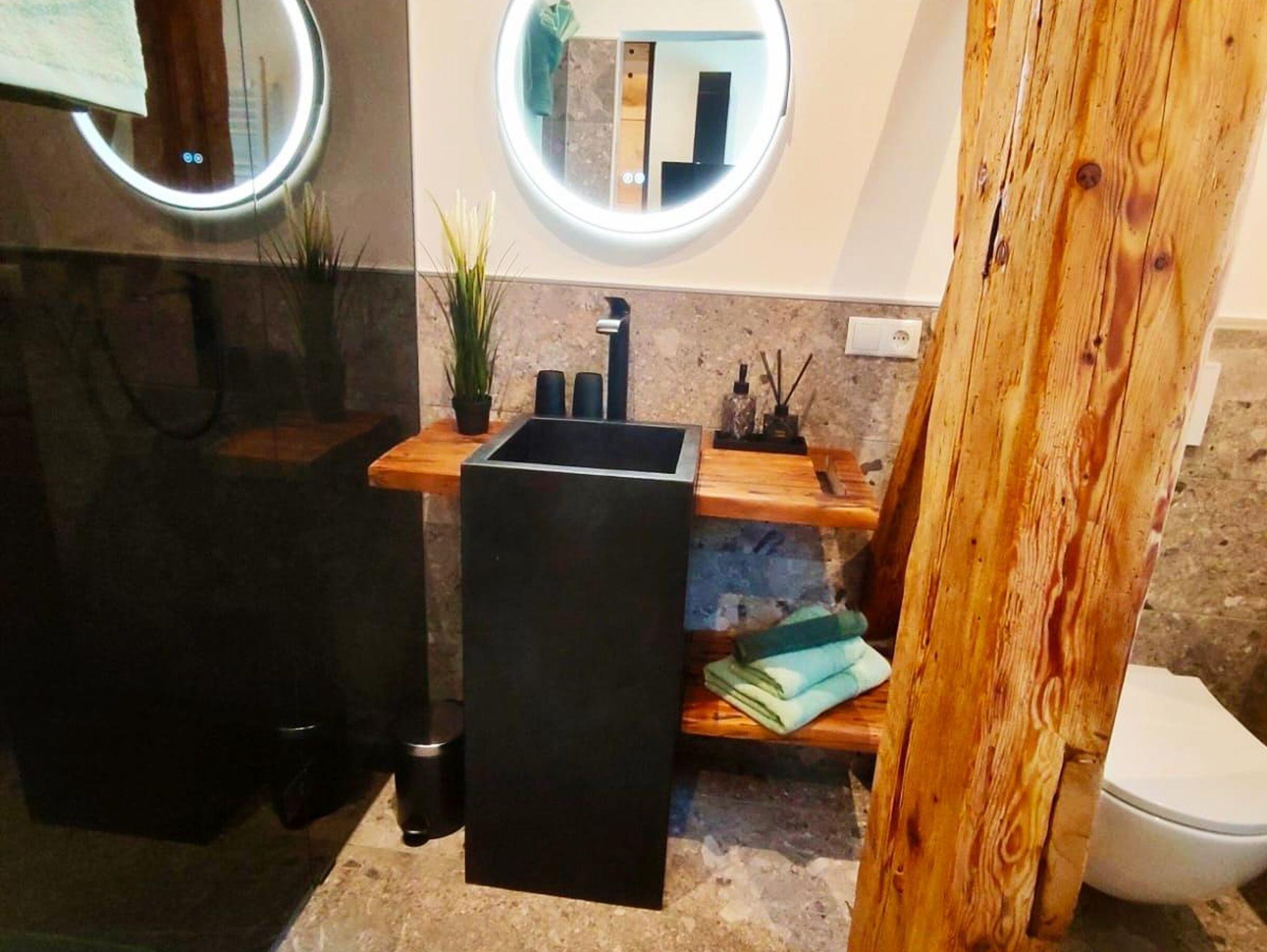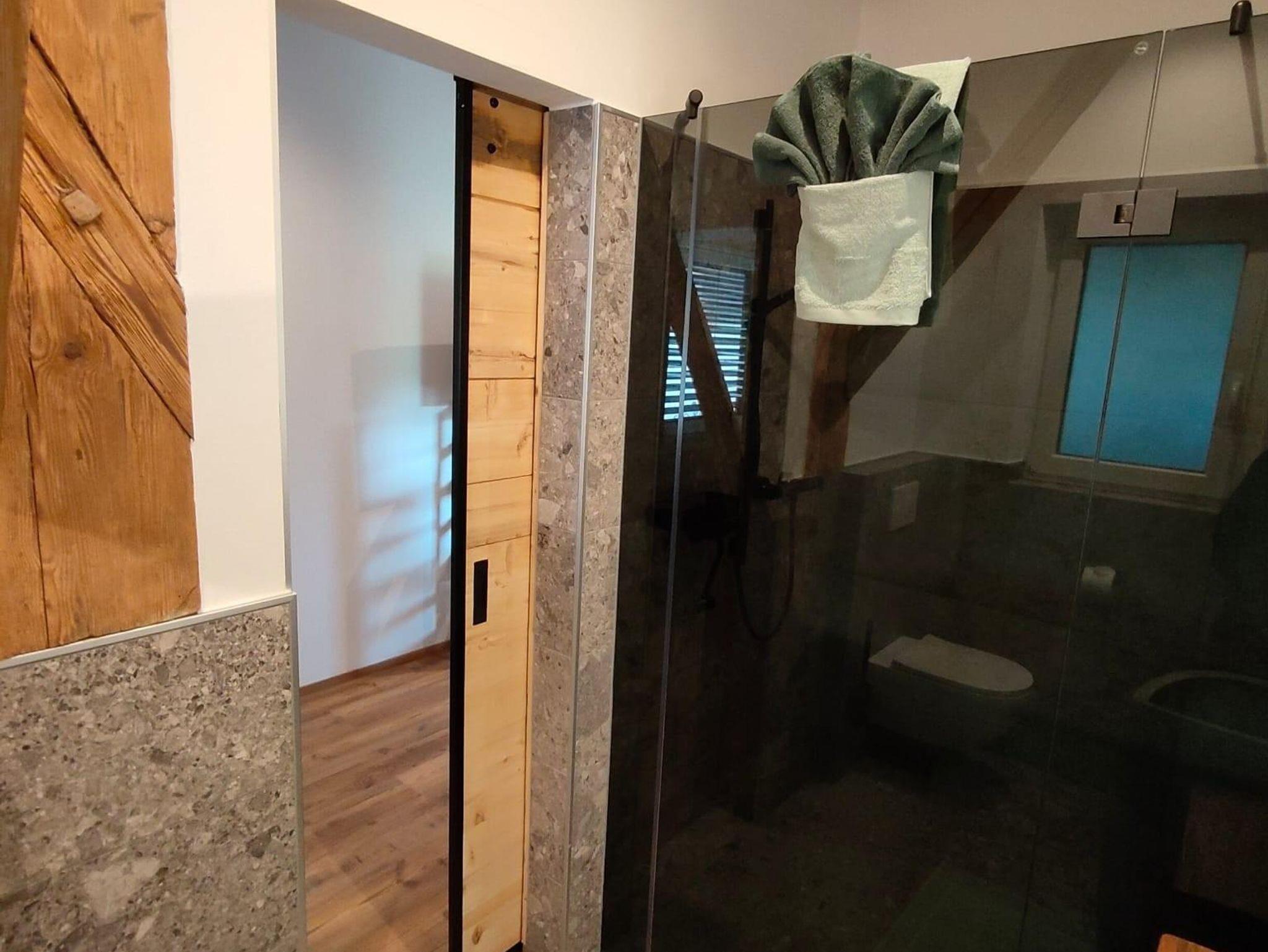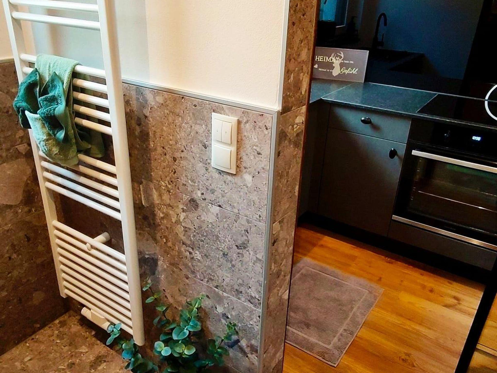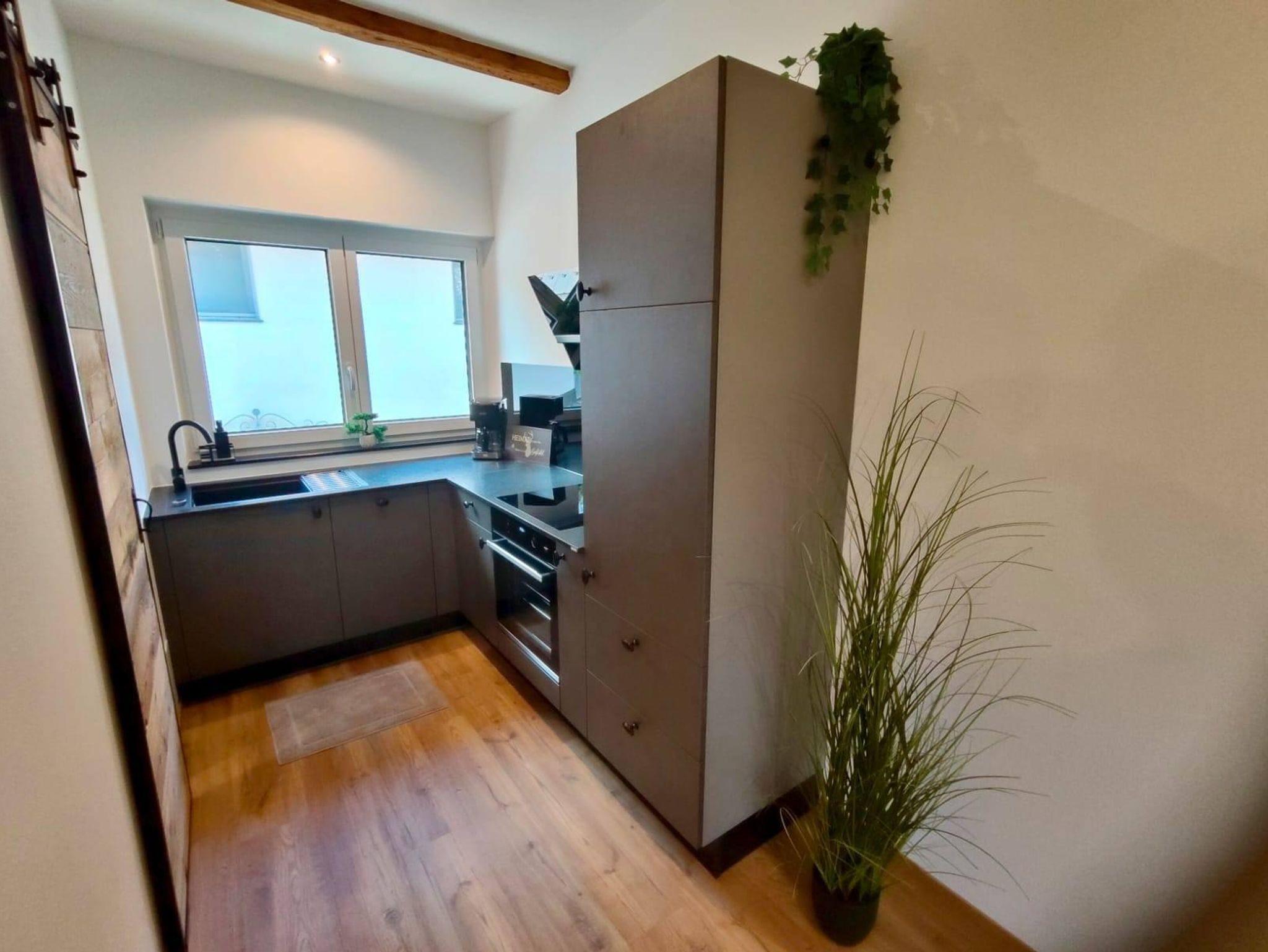 Auf der Ebene 1 befindet sich der rustikal moderne und komplett eingerichtete Wohnraum mit Küche,sowie unser tolles Badezimmer mit XXl Dusche.