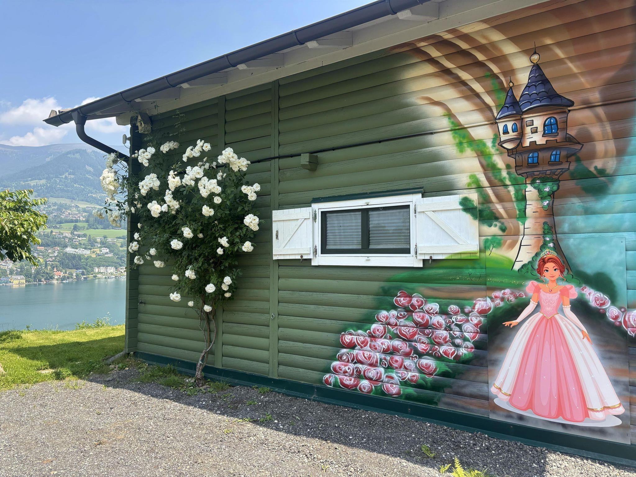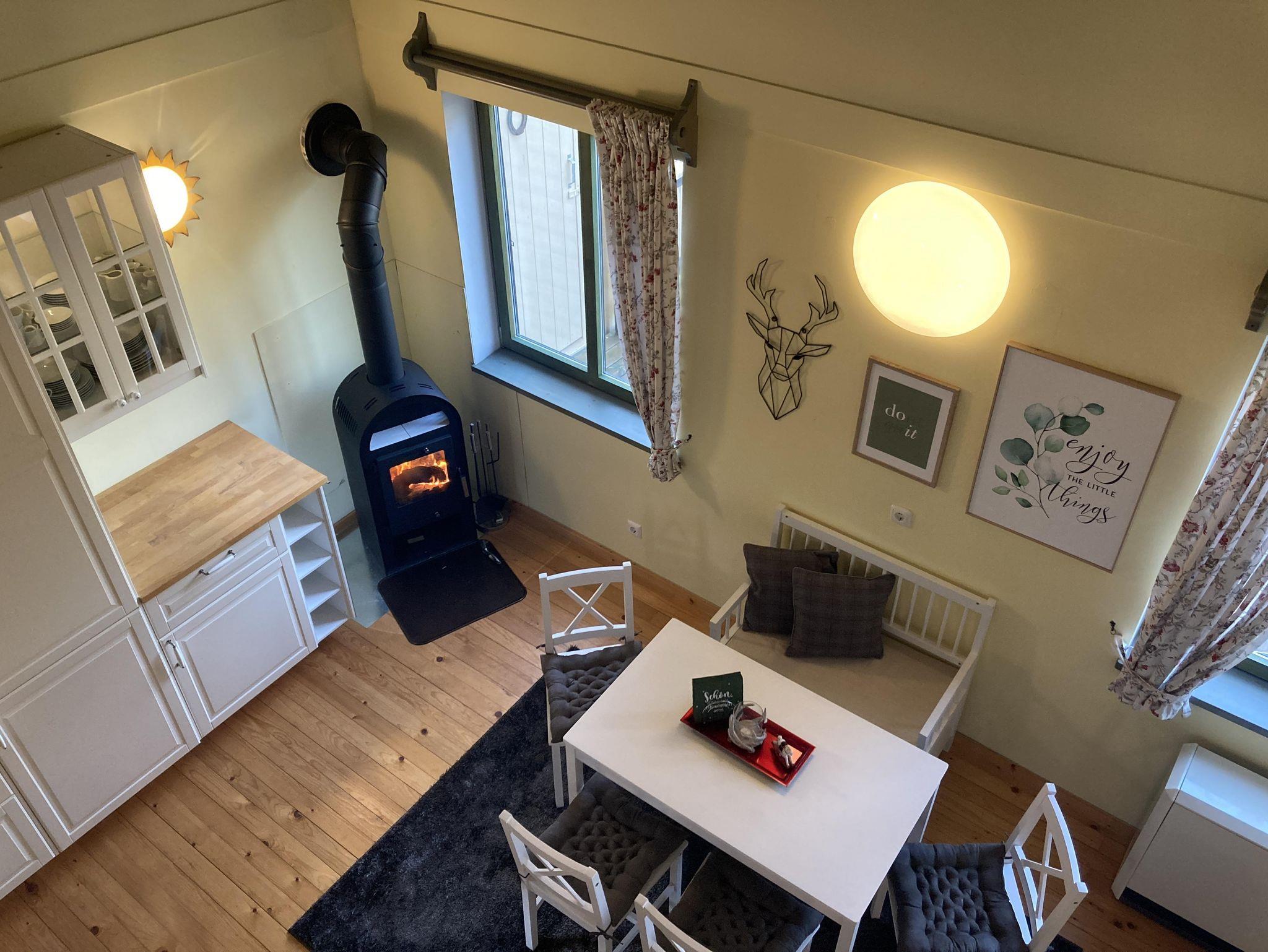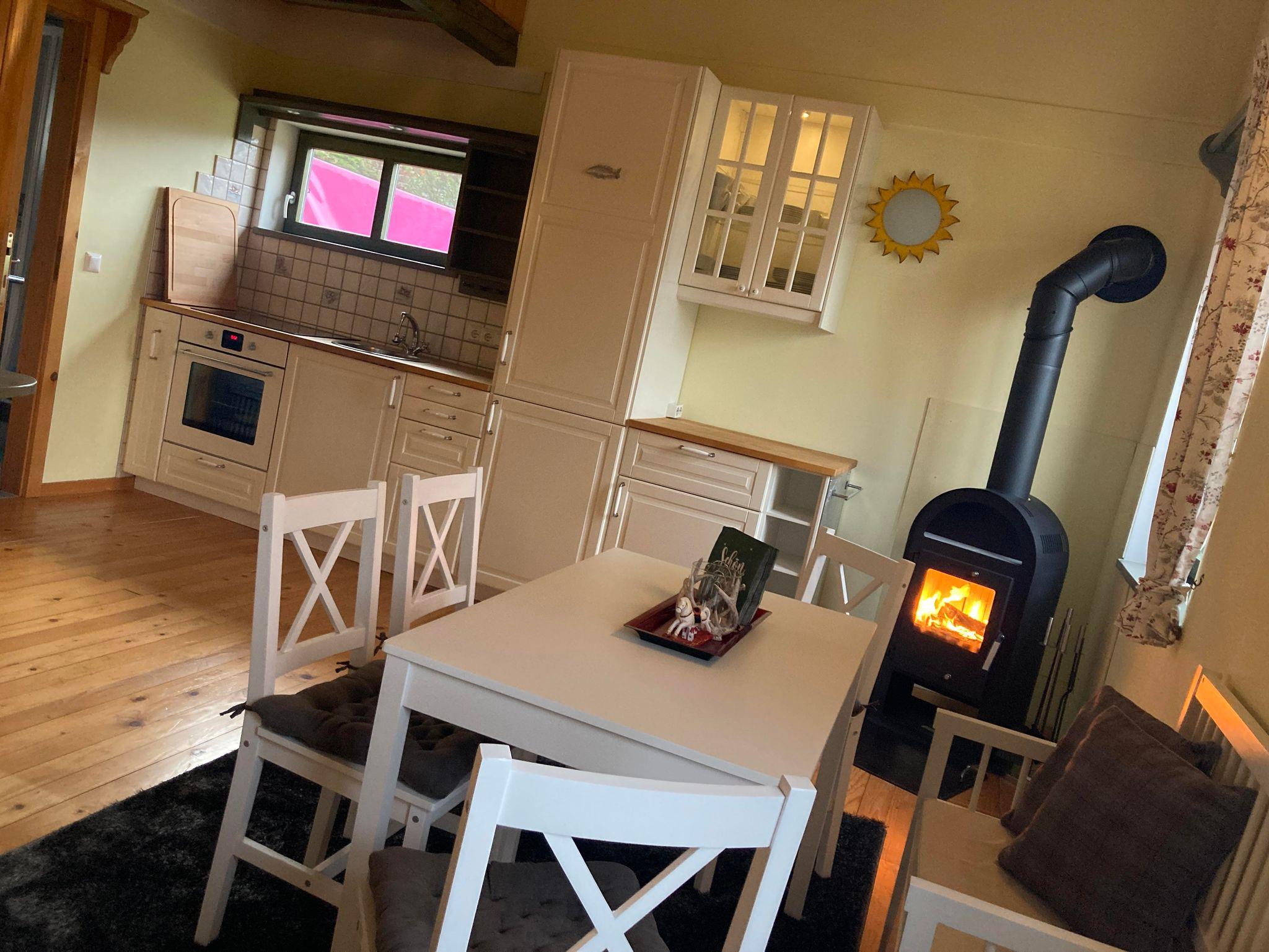 ist ein Holzblockhaus und wurde im Landhaus-Style in den Farben: weiß, gelb, grau, grün mit viel Holz und Liebe dekoriert und ausgestattet.