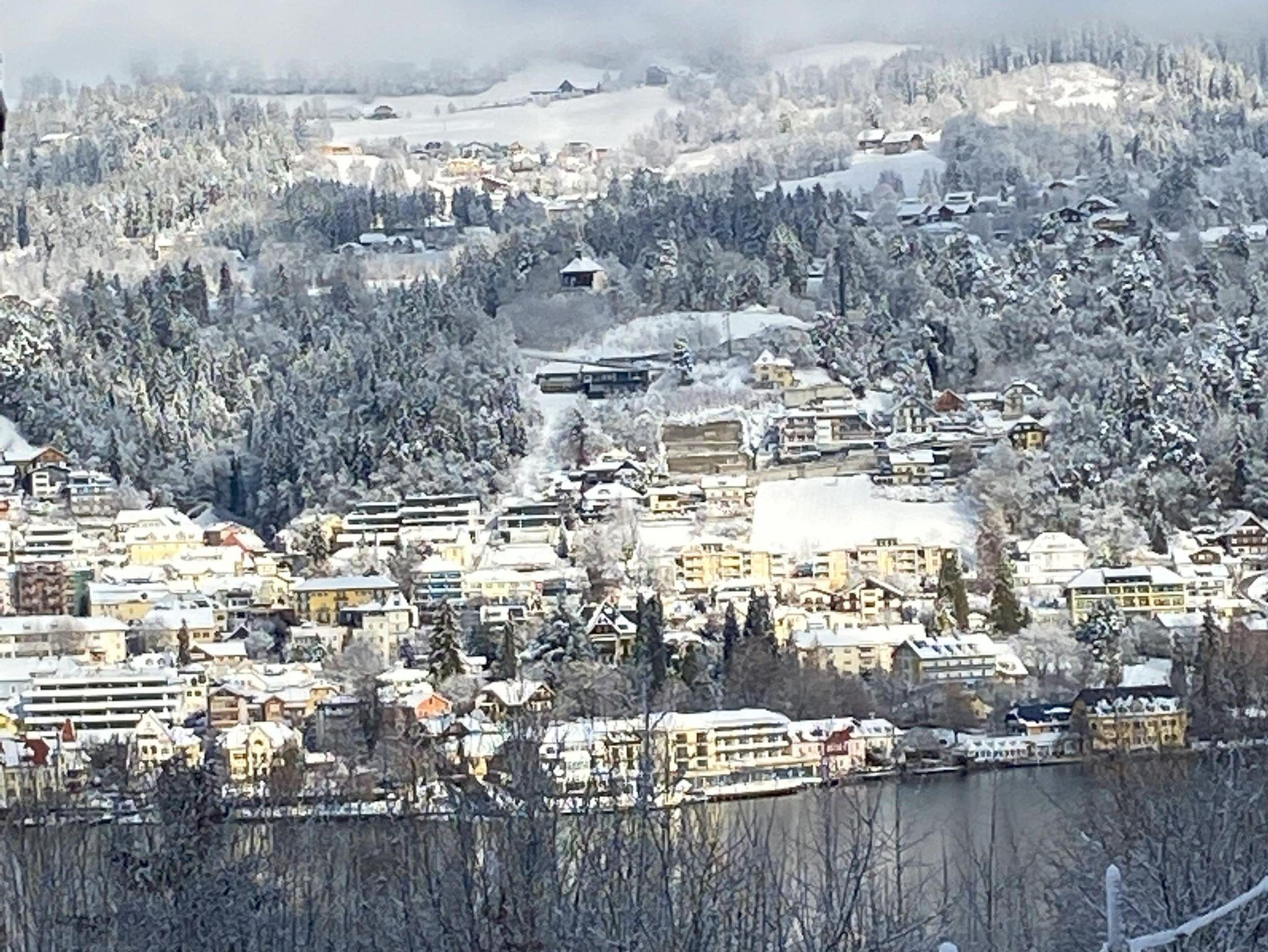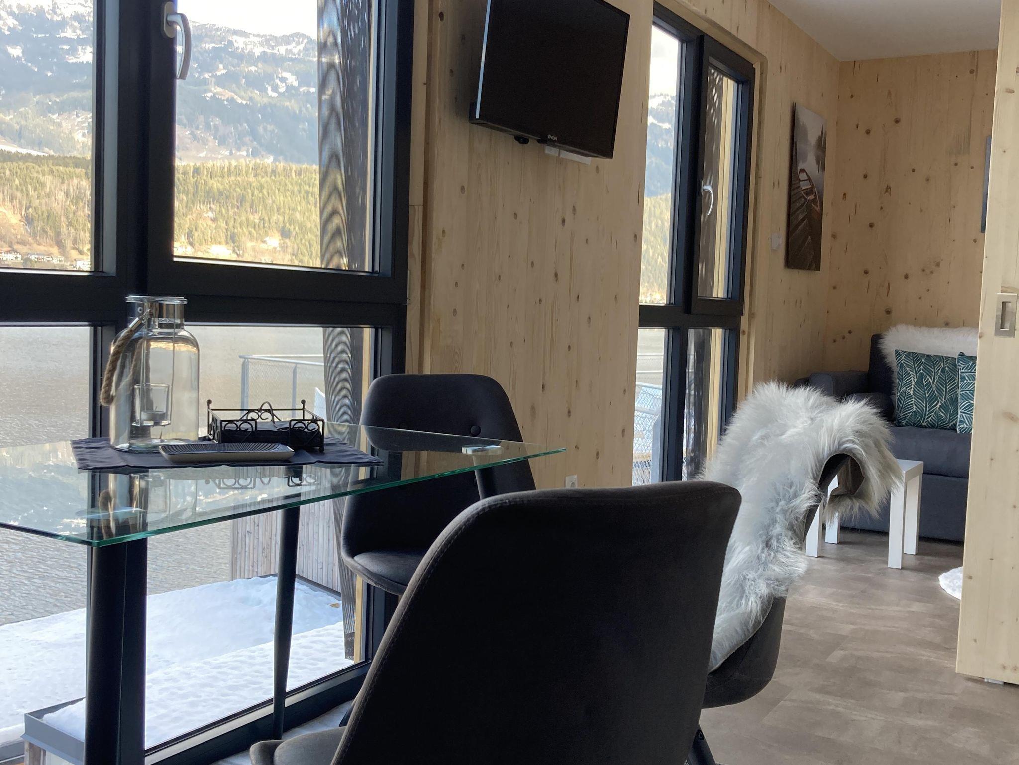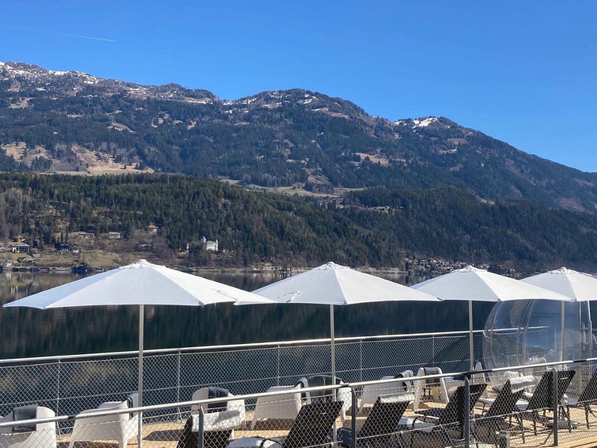• Riesige Fensterfront mit direktem Blick auf den See und Millstatt mit Esstisch und gemütlichen Sesseln