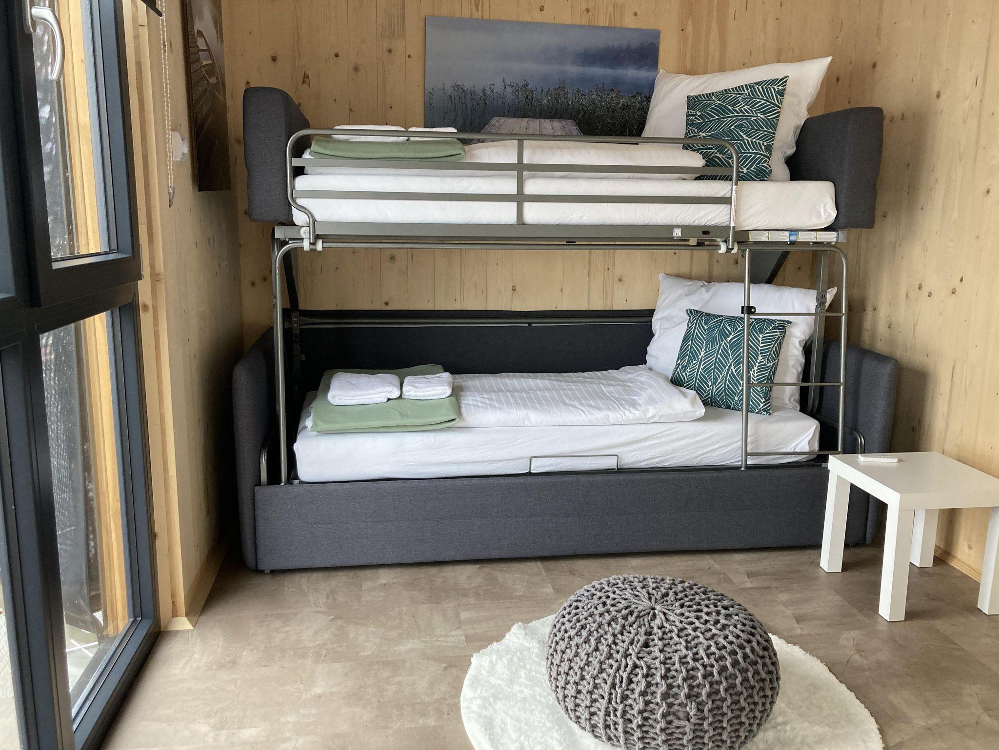 • Wohnzimmer mit stylischem Designersofa aus Italien - aus diesem Sofa lässt sich mit 2 Handgriffen ein Stockbett zaubern; das Wohnzimmer kann mit einer Schiebewand von der Wohnküche getrennt werden (2. Schlafzimmer)