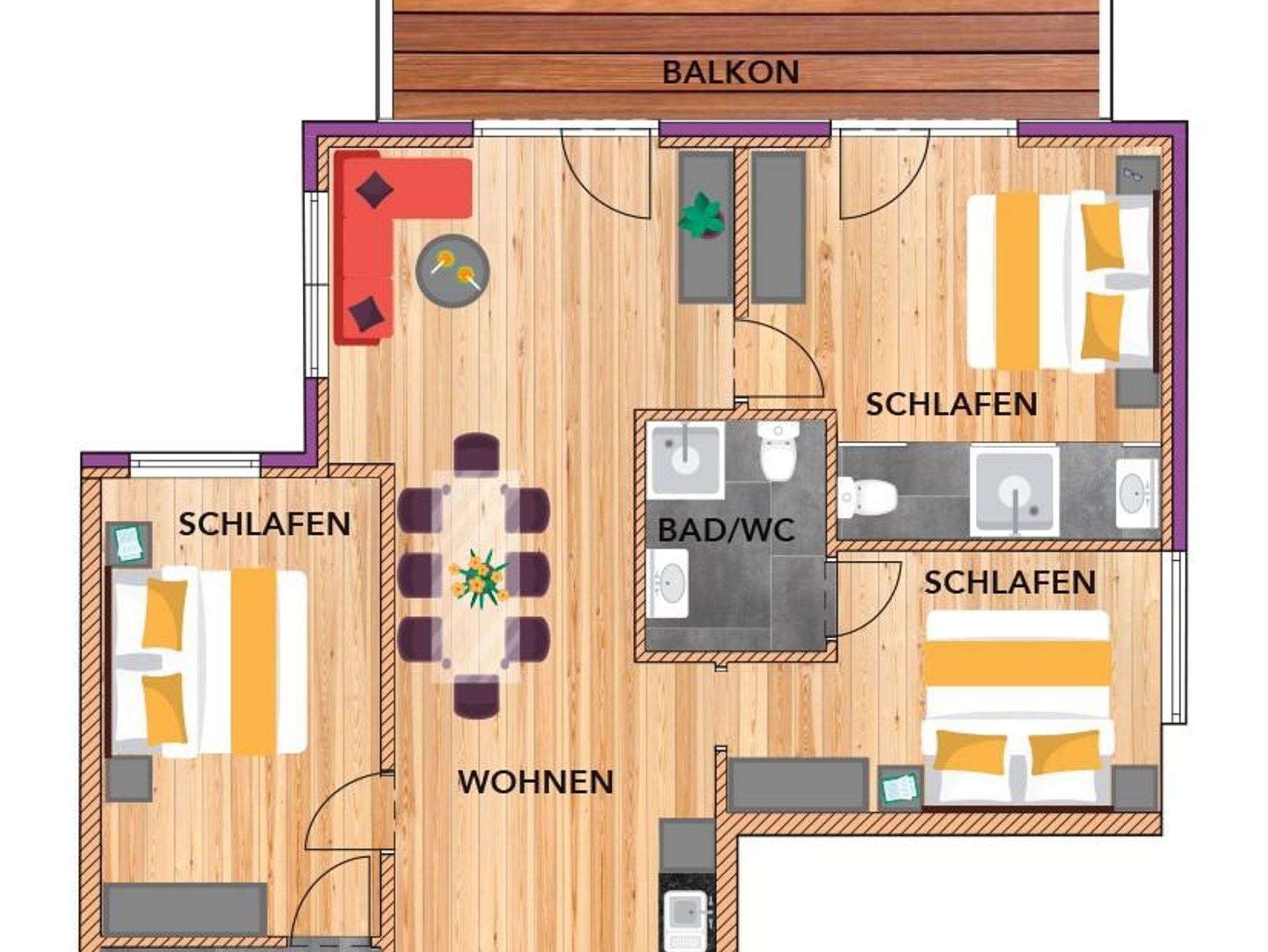 - 3 Schlafzimmer mit je einem Doppelbett