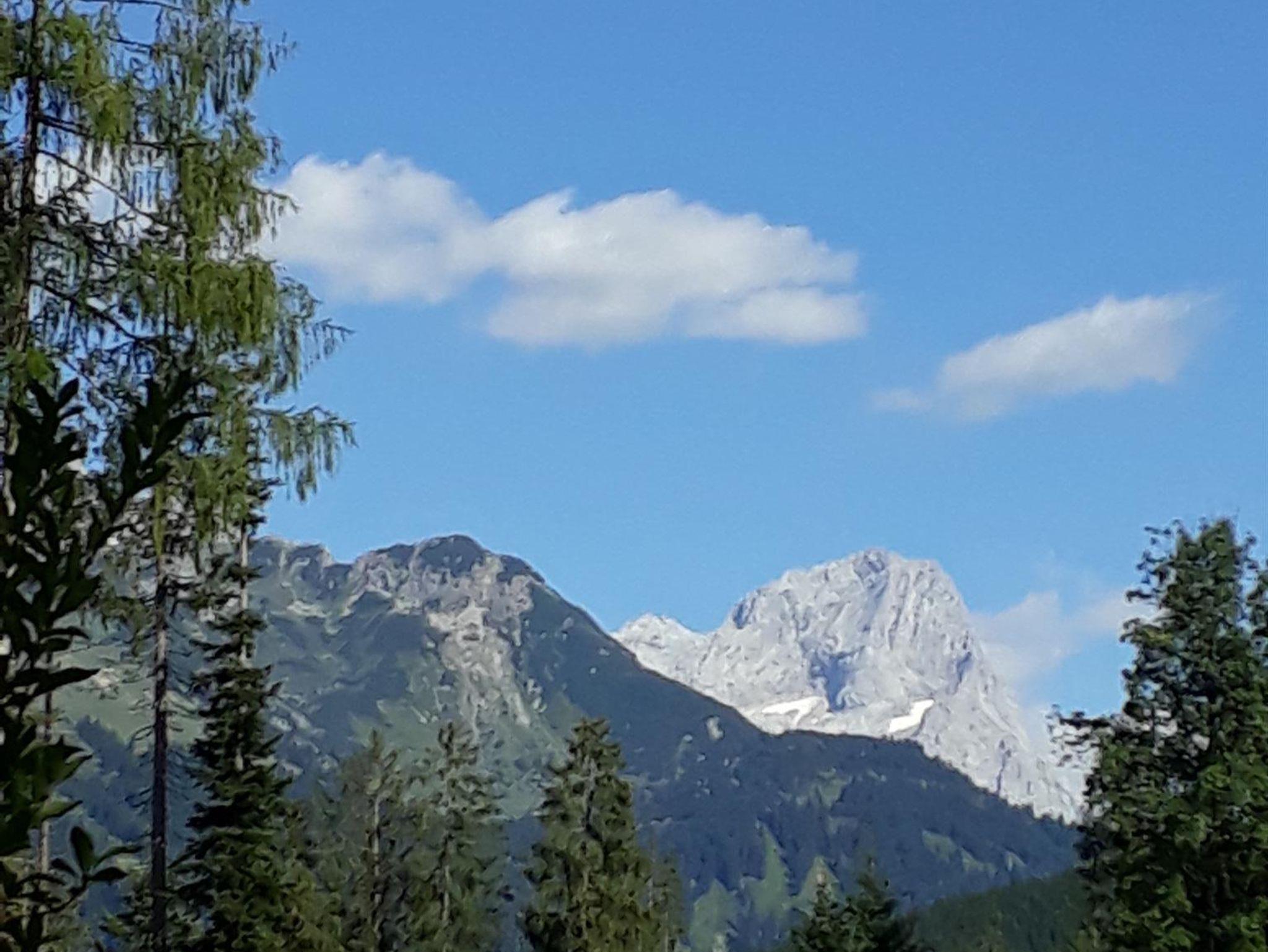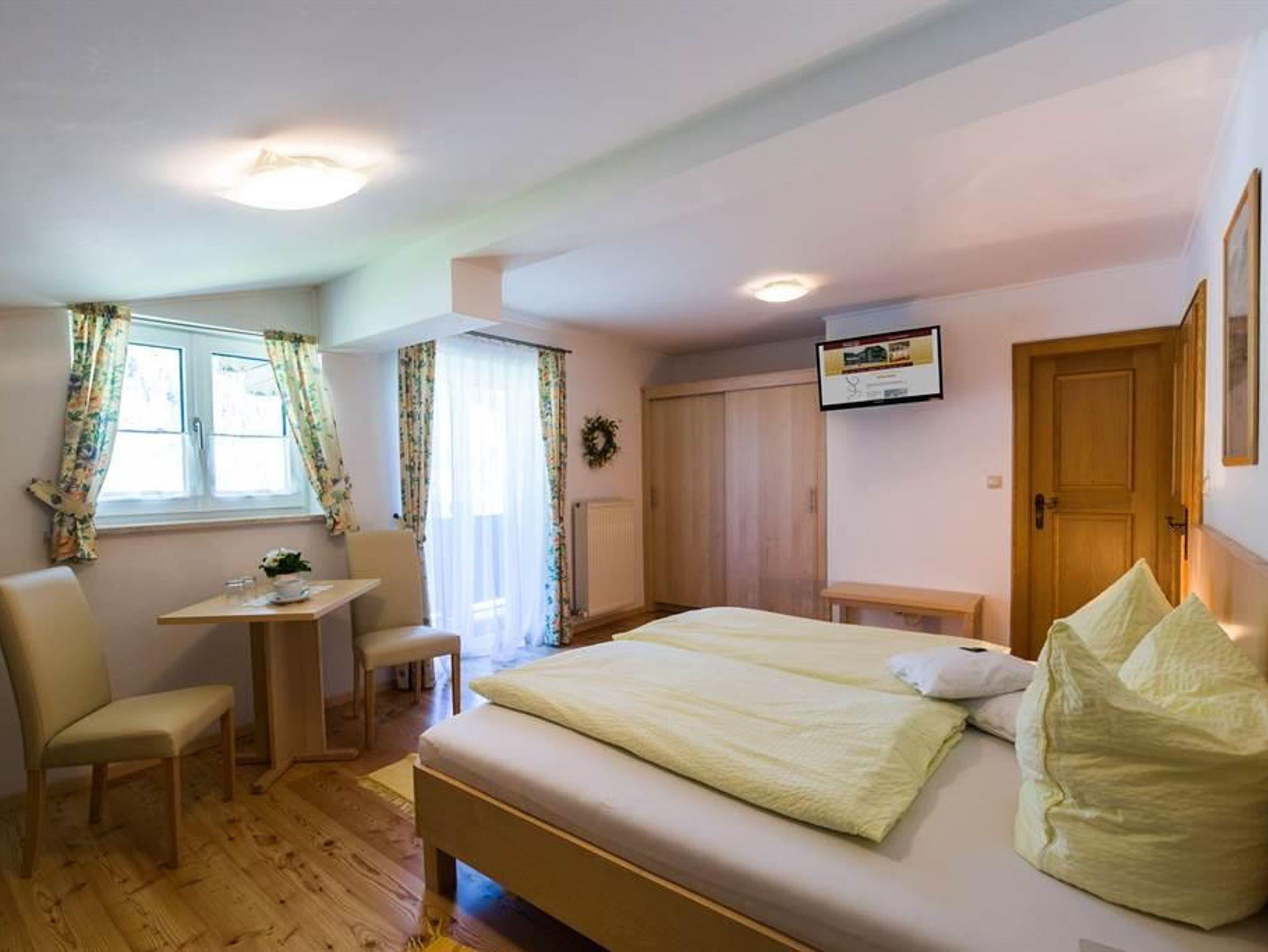 Doppelzimmer ausgestattet mit einem modernen Doppelbett, hellen Landhausmöbeln aus Holz, Lärchenboden mit Bad mit Dusche/WC, Fön, Kabel TV, Tee-Oase W-LAN und Balkon mit herrlichem Bergblick auf das Gamsfeld. Ein Safe ist vorhanden.