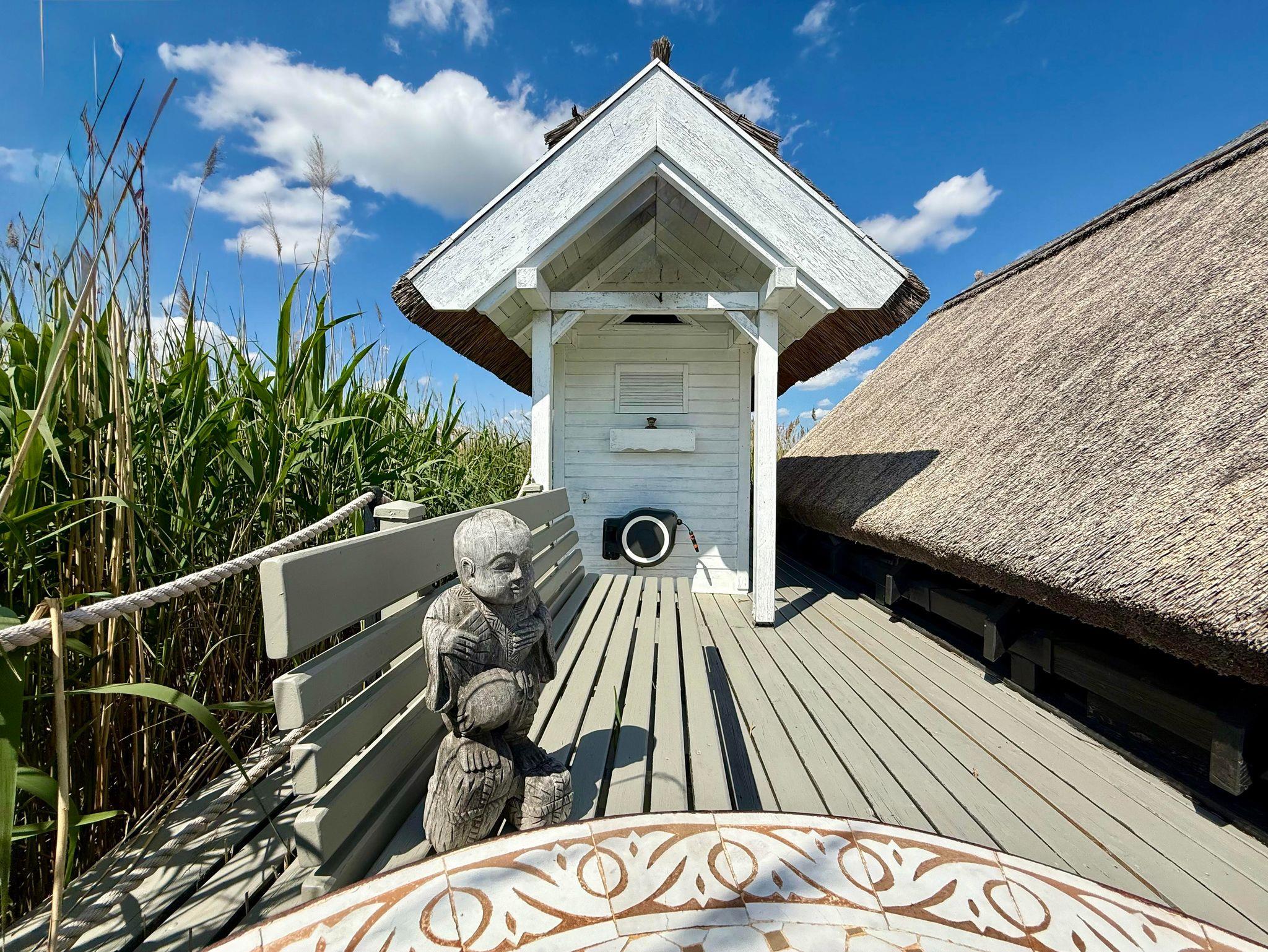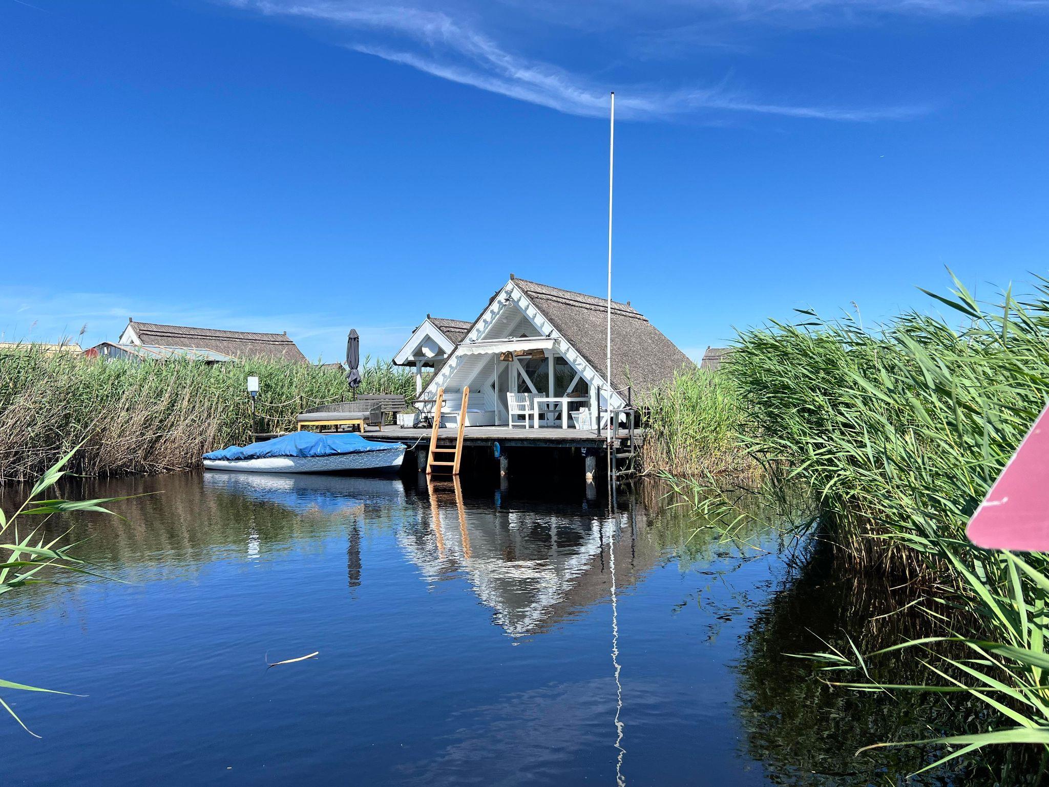 Sonneninsel, private Terrasse im Schilf mit Blick auf den See und Boot für Ihren Aufenthalt