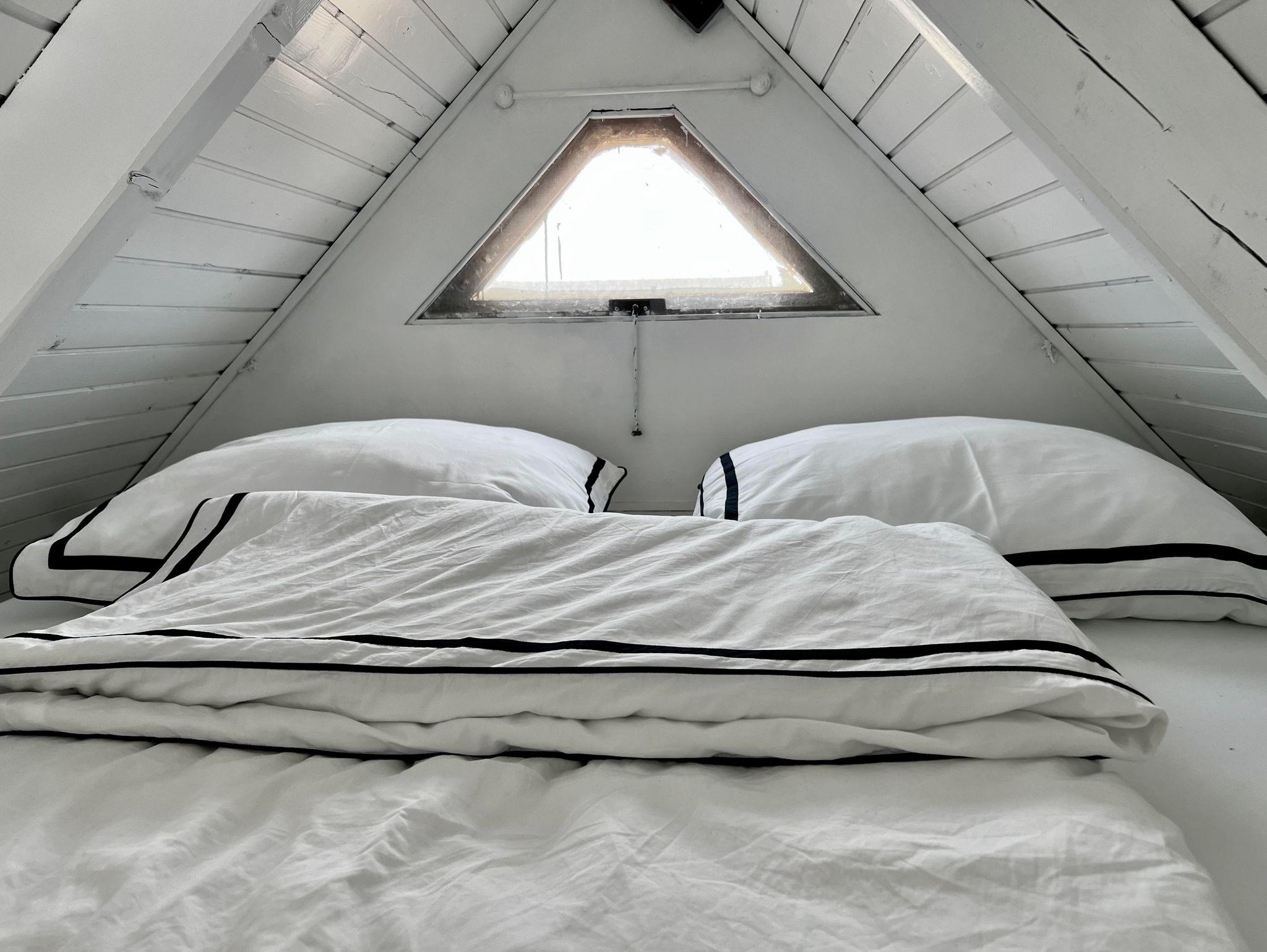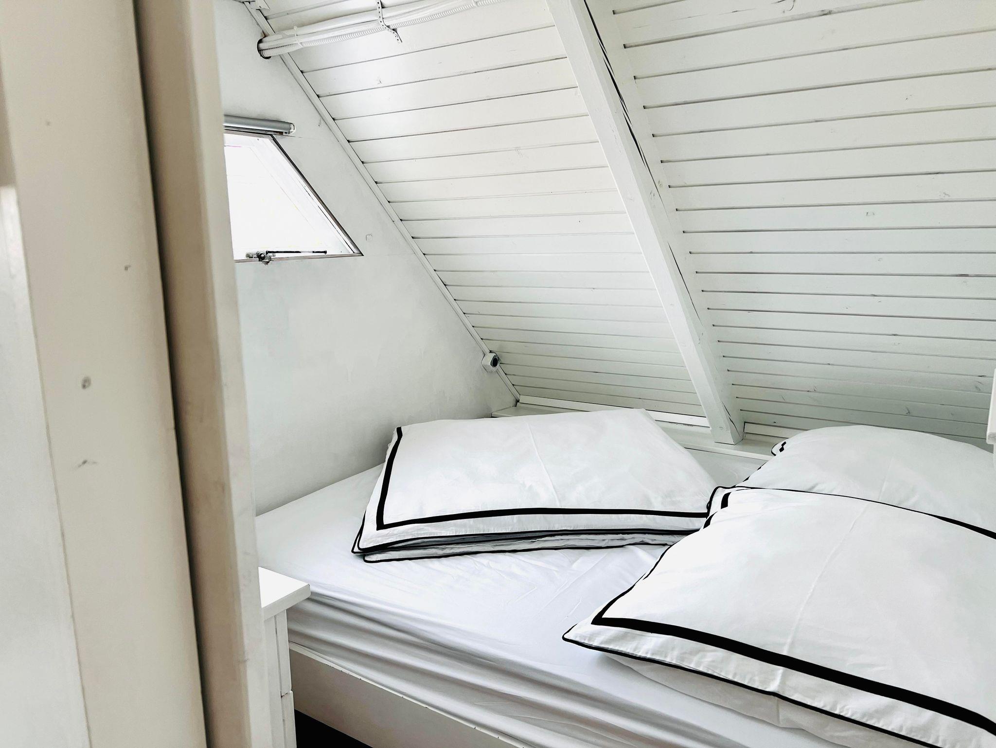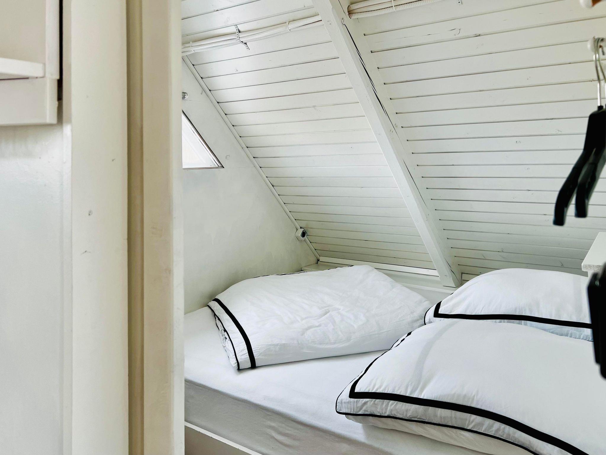 Das Ferienhaus Seehaus hat ein ebenerdiges, getrenntes Schlafzimmer mit einem Doppelbett. Das andere Doppelbett (mit Matratzen, aus Platzgründen gibt es kein komplettes Bett mit Beinen und Bett Haupt) befinden sich romantisch direkt unter dem Dach der Hütte und ist über eine Leiter zu erreichen. Zusätzlich kann als 5. Bett die Bank im Erdgeschoss zu einem Bett umfunktioniert werden. Die Betten im oberen Bereich sind für Personen mit eingeschränkter Beweglichkeit nicht zu empfehlen.